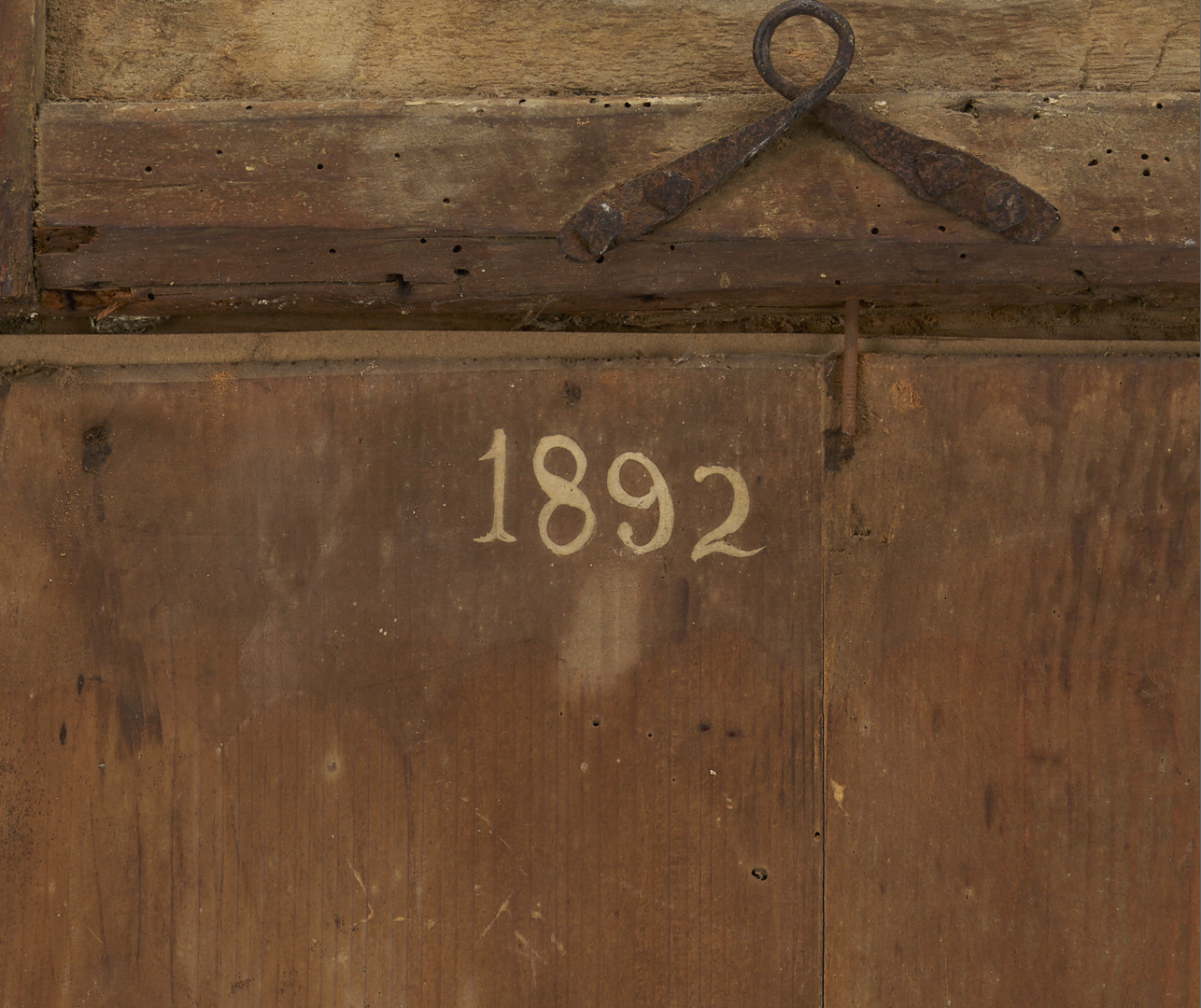 Antique Baroque style giltwood mirror with elaborate fan, shell and rosette carvings to crest, sides and base. Inscribed 1892 en verso. 41 1/2 in. H x 28 in. W x 2 in. D. Likely Italian, 19th century.