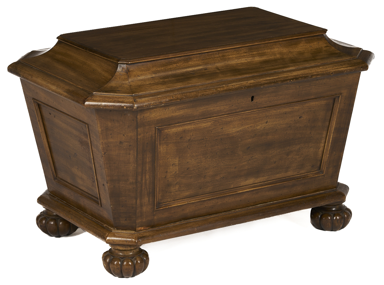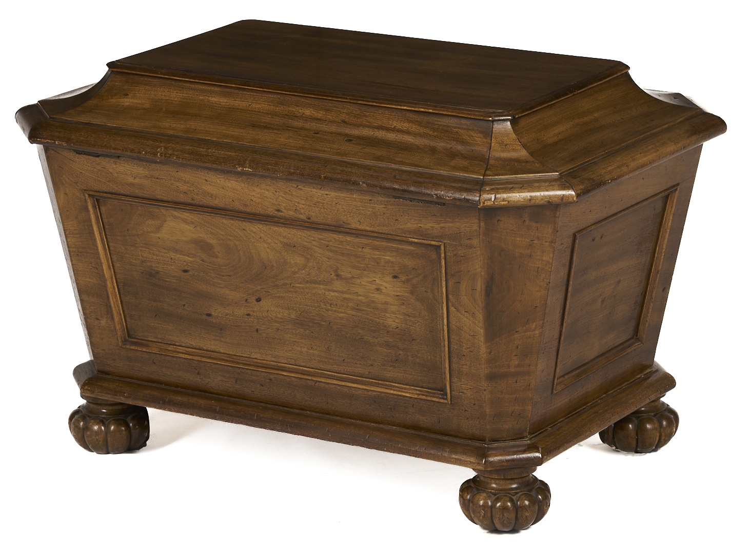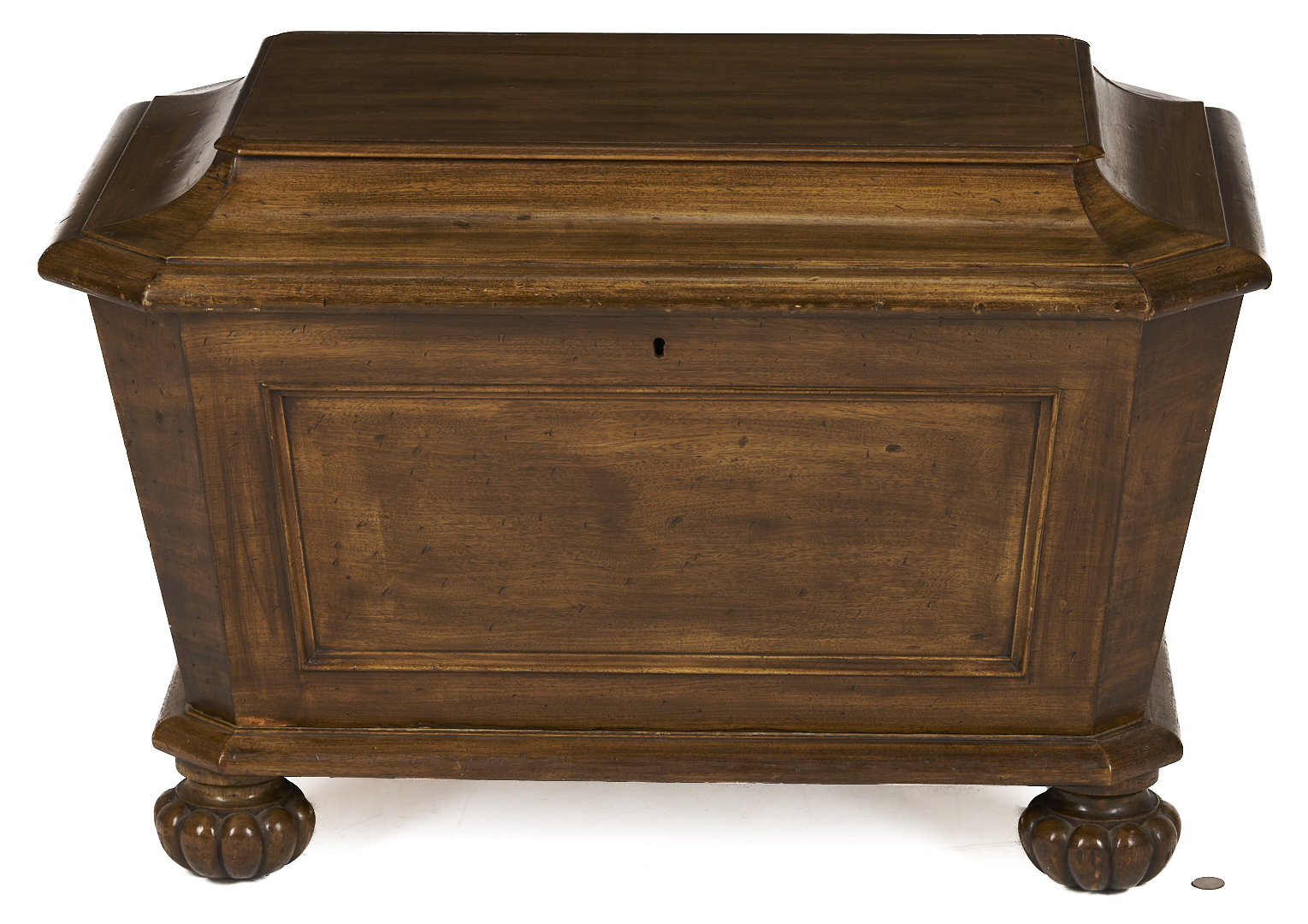 Large English Regency mahogany floor cellarette or bottle box, sarcophagus form with flat molded hinged top, tapering body with canted corners and paneled and molded sides, set on a separate molded base with lobed compressed ball feet. The interior retains the old metal lined bottle compartments. 35 in. W x 23 in. H x 24 in. D. Circa 1825.