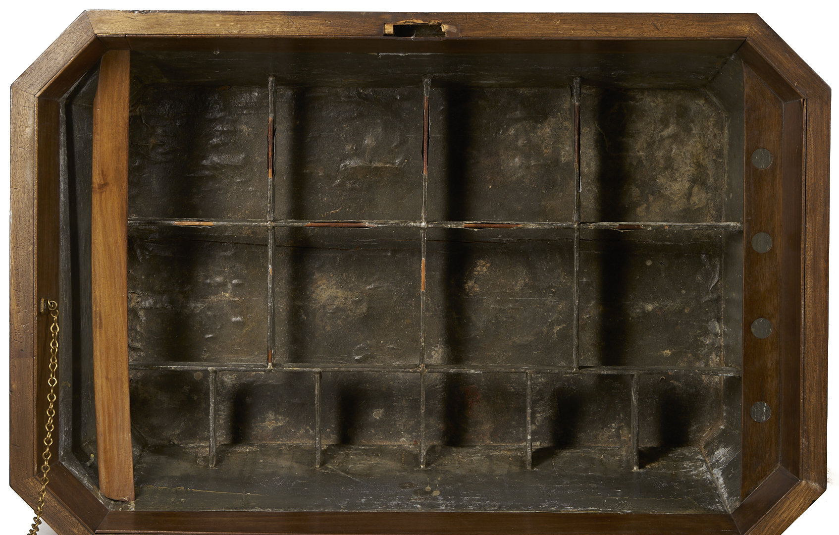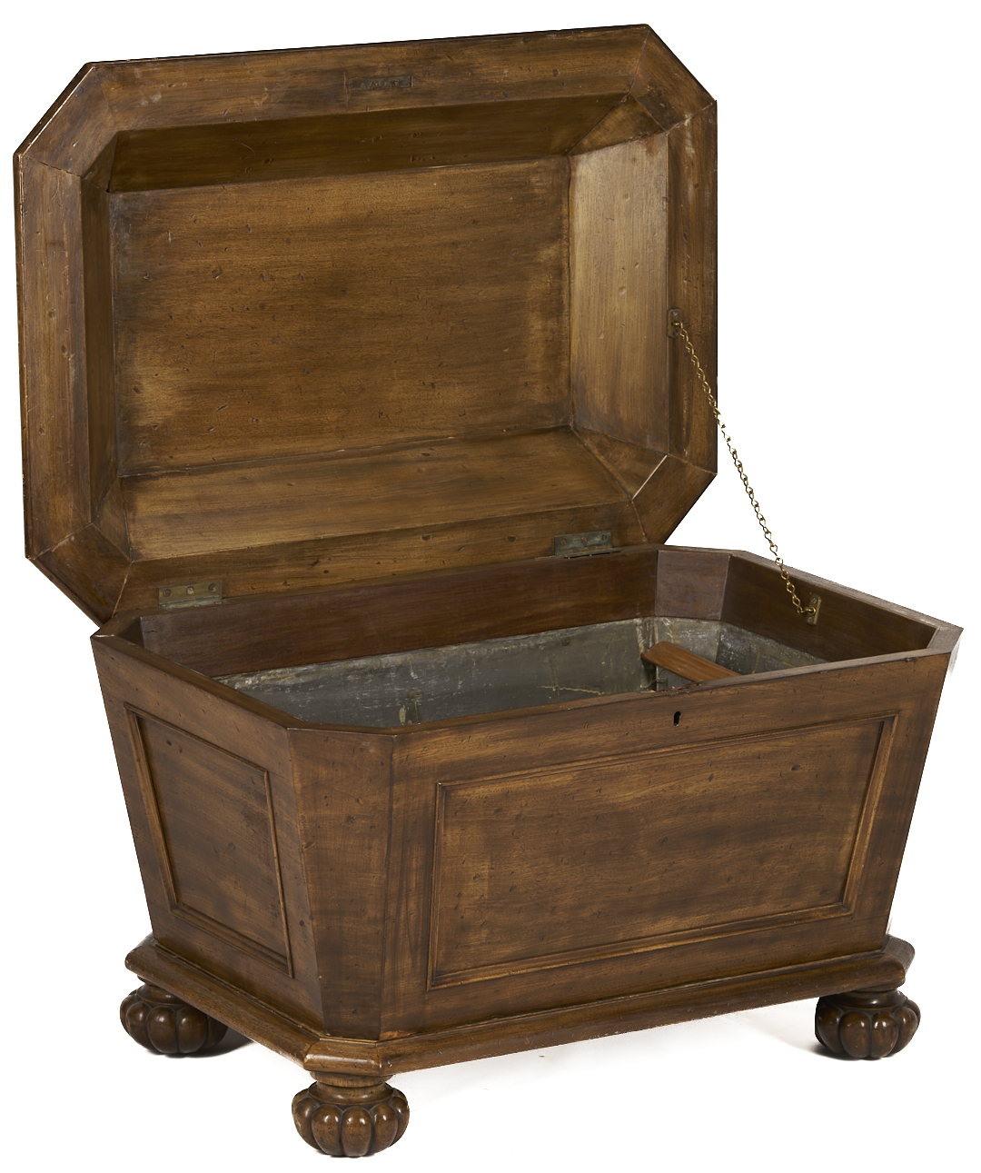Some wear, scratching and surface losses, particularly to outer edges. Wear and some cracking to interior metal lining (no longer water-tight). Later hinge screws and chain added, lock has been removed but retained, lacks key. Castors on feet added later.