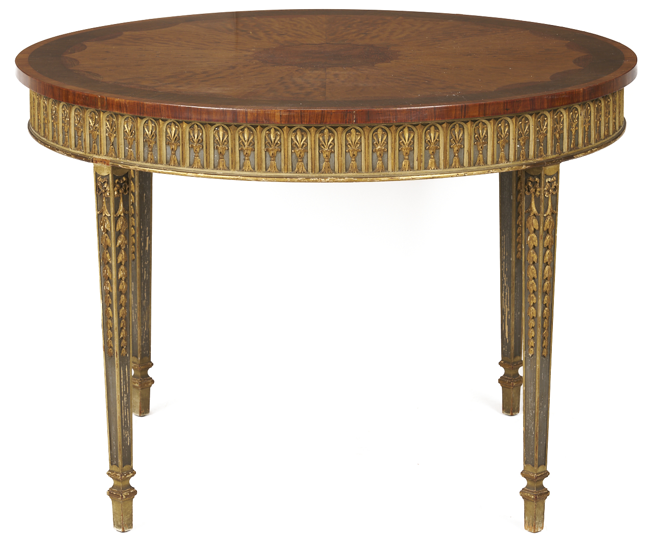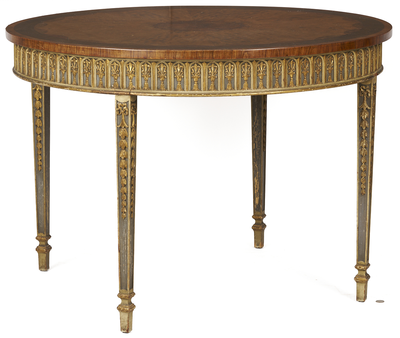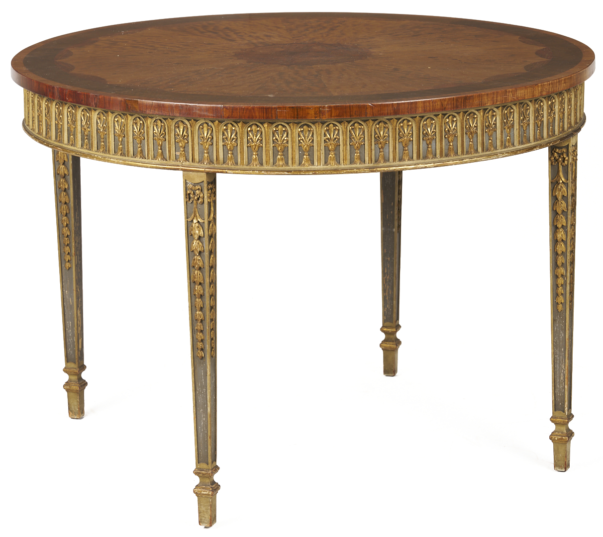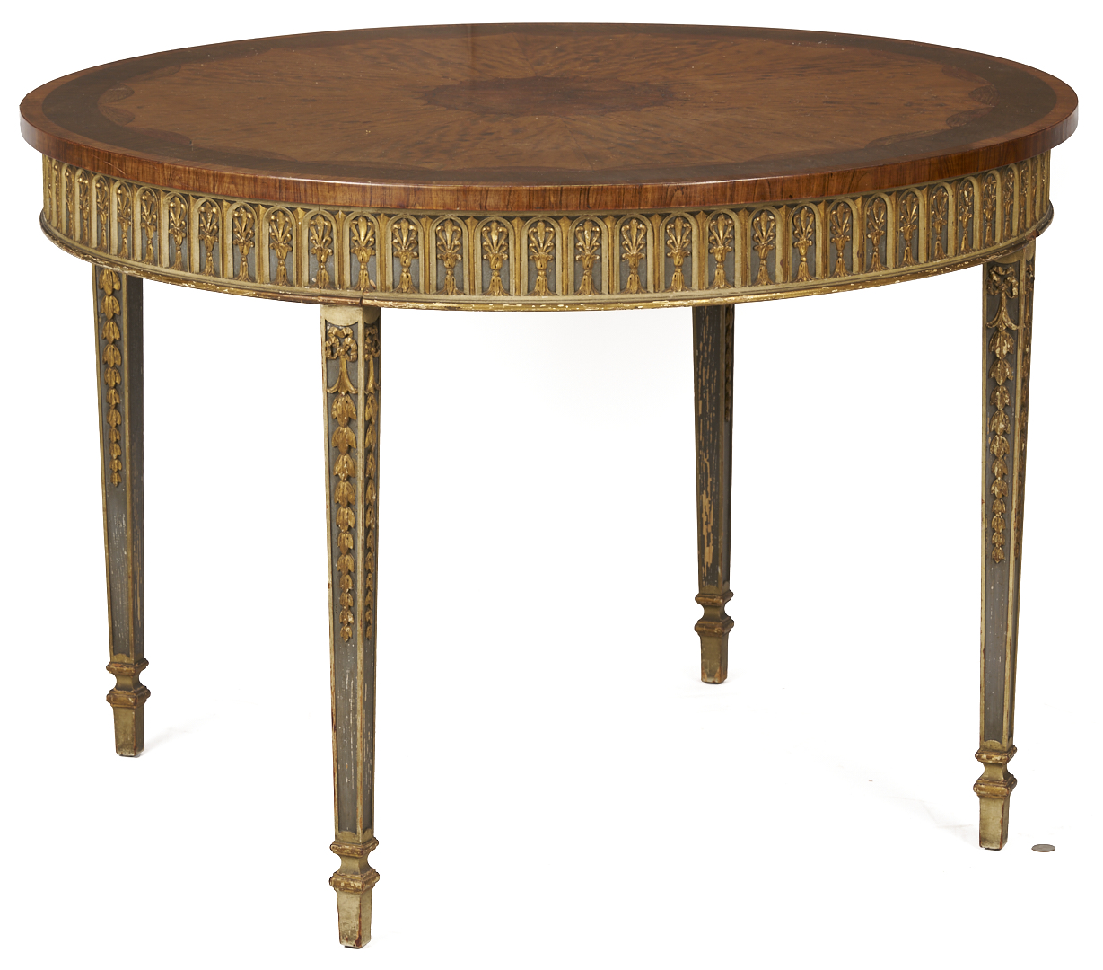 An Italian Neoclassical style center or small dining table, featuring a circular inlaid top, painted skirt with carved stylized leaf and arch overlay, on four square tapering legs with carved bellflowers and square gilt feet. 29 1/2 in. H x 42 1/4 in. dia. Early to mid 20th C.