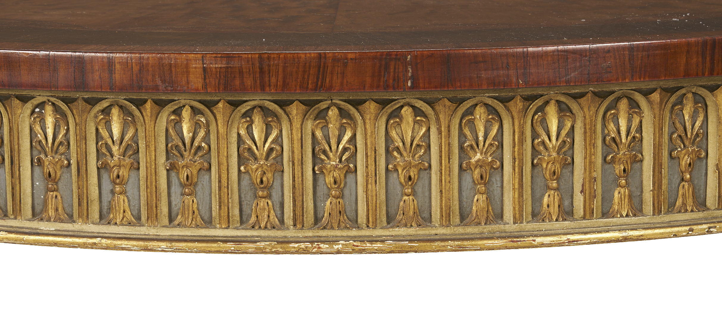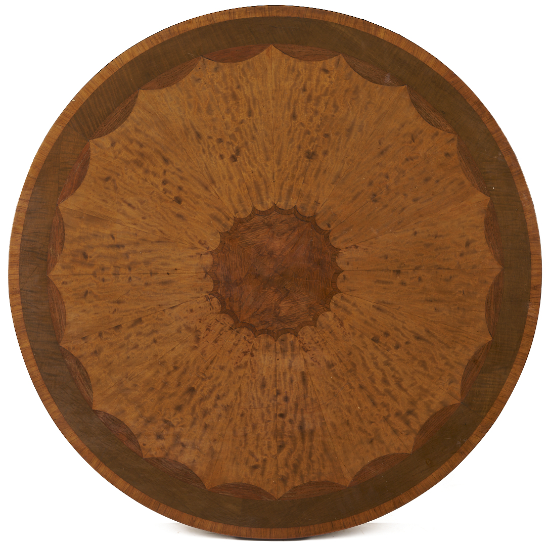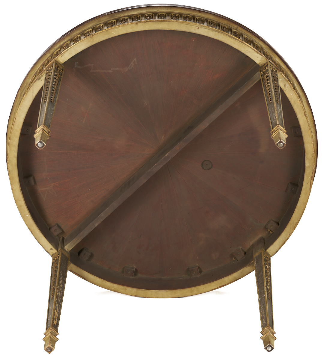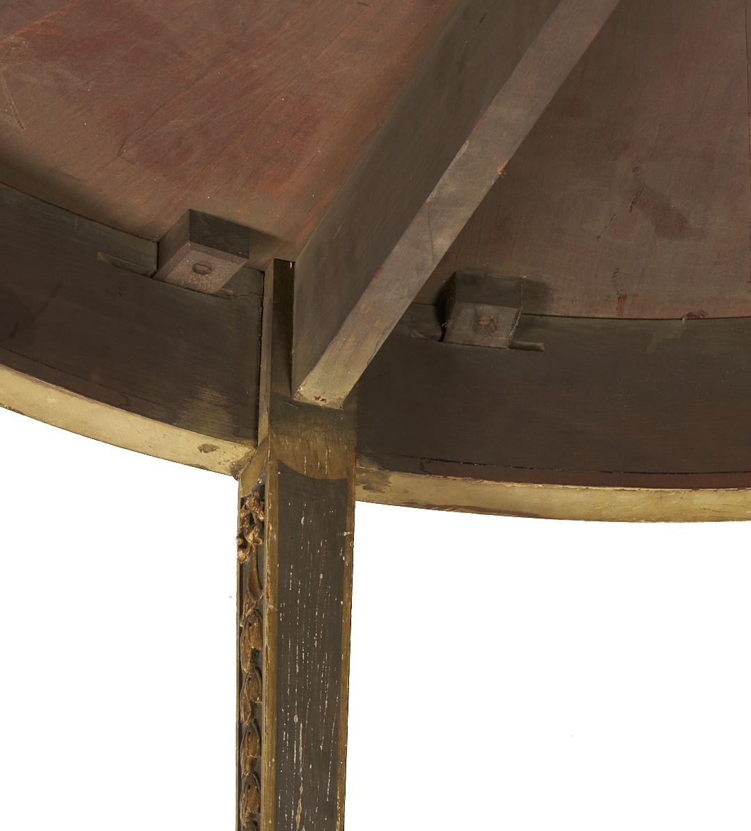 An Italian Neoclassical style center or small dining table, featuring a circular inlaid top, painted skirt with carved stylized leaf and arch overlay, on four square tapering legs with carved bellflowers and square gilt feet. 29 1/2 in. H x 42 1/4 in. dia. Early to mid 20th C.
