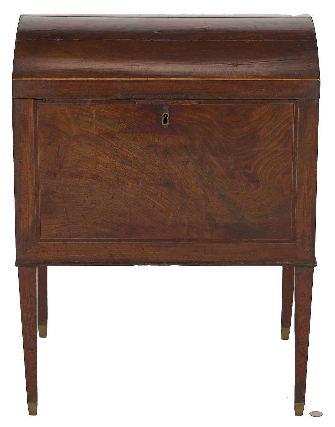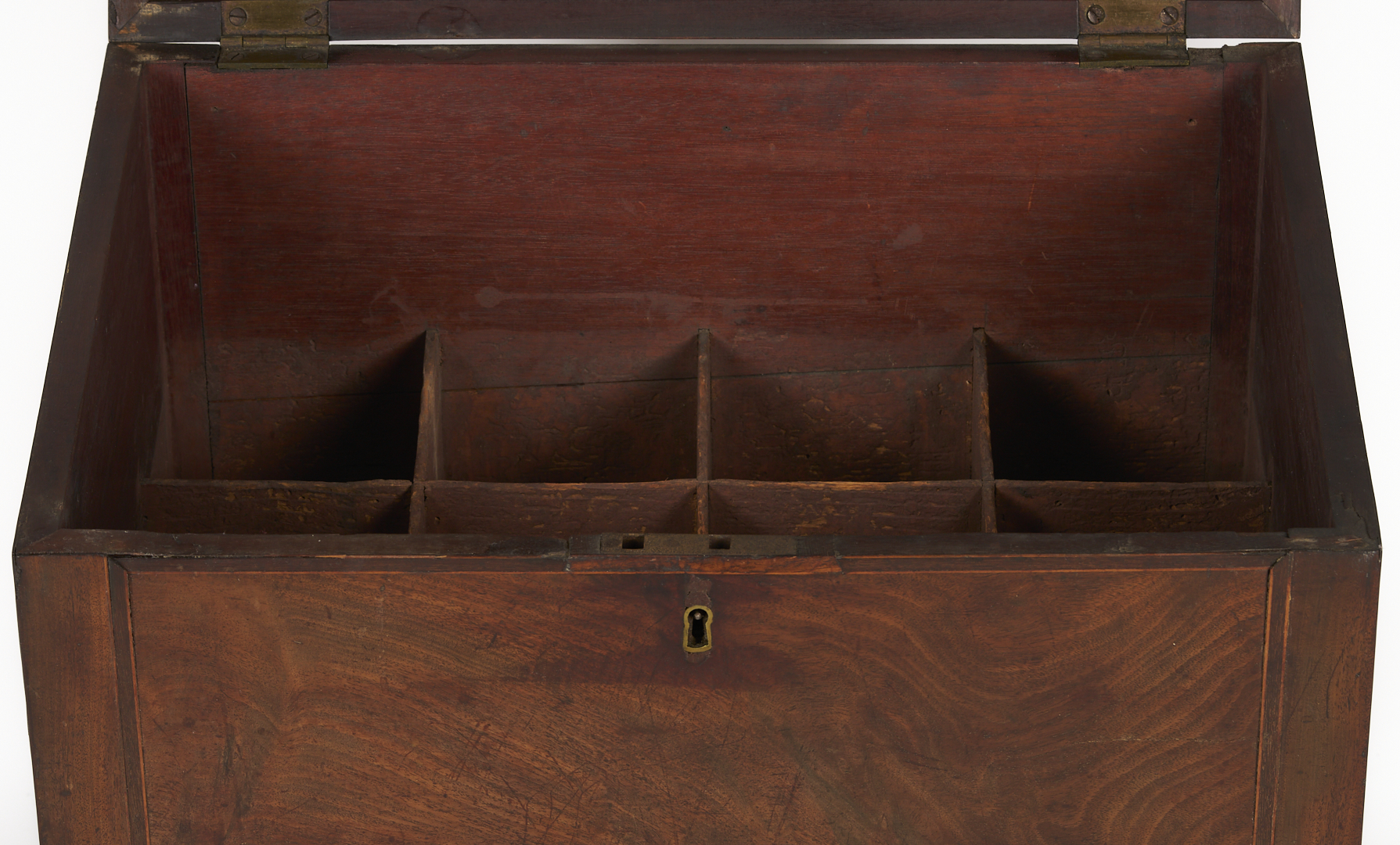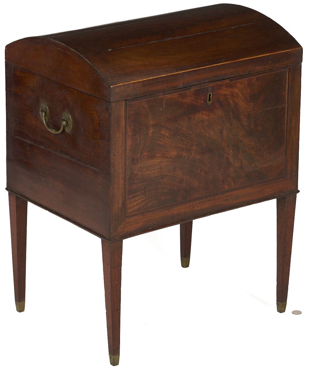 English mahogany and mahogany veneer cellarette, domed lift top, 12-bottle fitted interior, and tapered square legs with brass feet. 27 3/4 in. H x 21 1/2 in. W x 15 7/8 in. D. Late 18th/early 19th century.