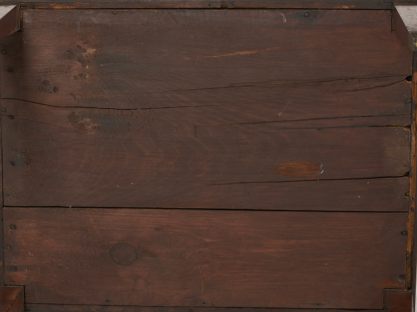 Overall good condition with wood shrinkage to the lid and case. Some scattered losses and minor repairs to the lid edge. The lid does not fully engage with the lock.