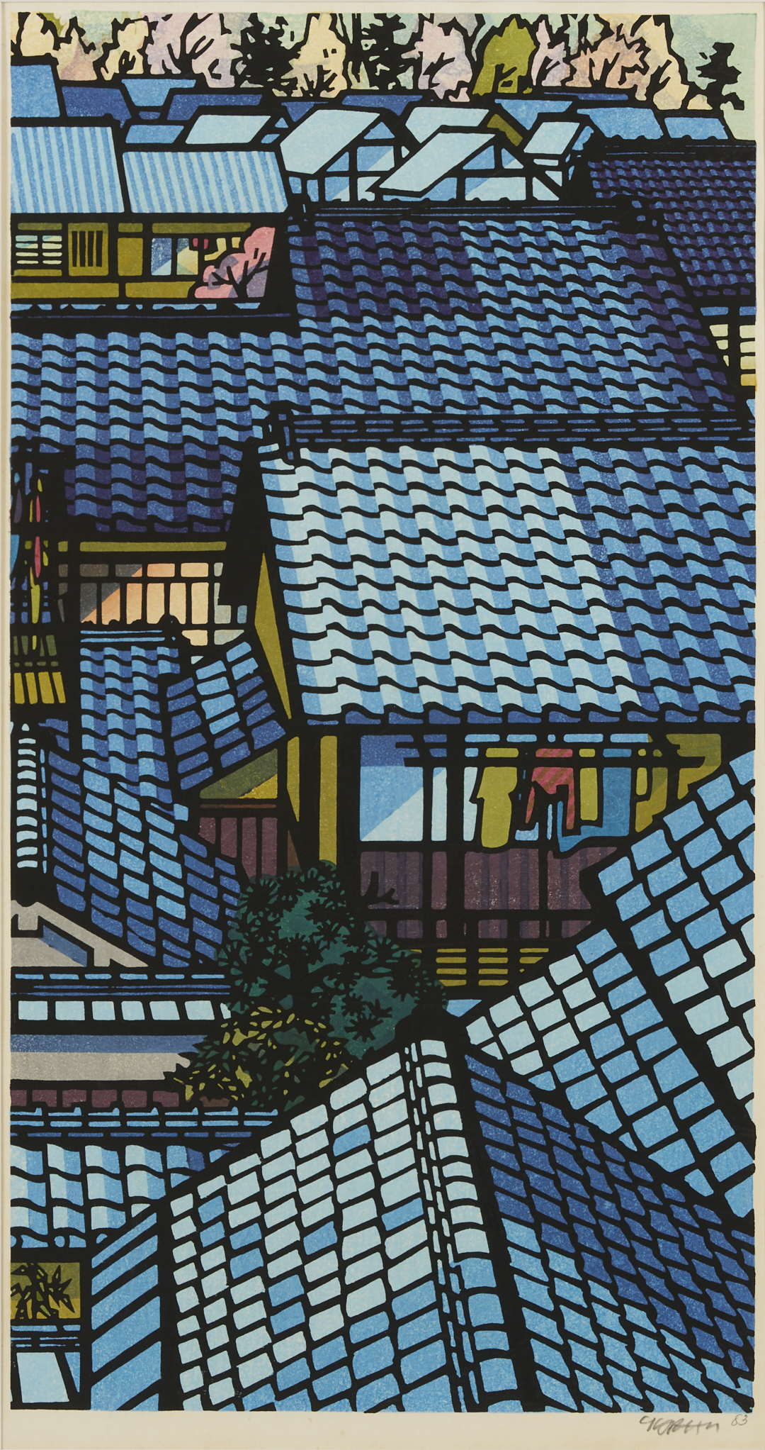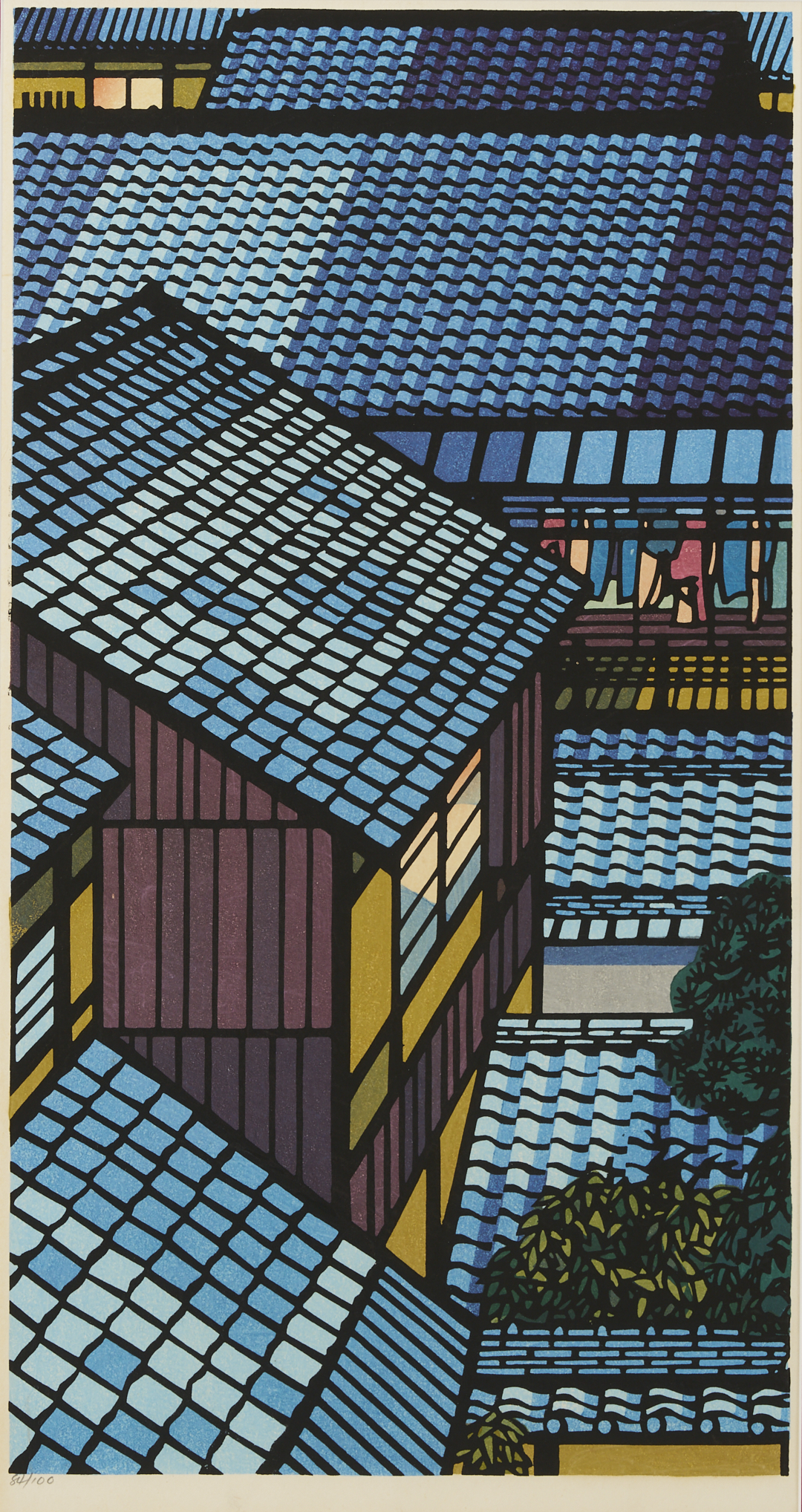 Clifton Karhu (Minnesota/Japan, 1927-2007) ukiyo-e woodblock print triptych, “Nishijin Roofs,” 1983. Slate rooftops in Kyoto’s Nishijin district reflect cool moonlight while warm electric light shines from windows. Numbered 84/100 to left sheet, titled to center sheet, and pencil signed and dated to right sheet, lower margins. Housed under acrylic in a silvered wood frame with navy textile mat and red reveal. Each sight: 23 1/4 in. H x 12 1/4 in. W. Framed: 37 1/8 in. H x 53 3/4 in. W.