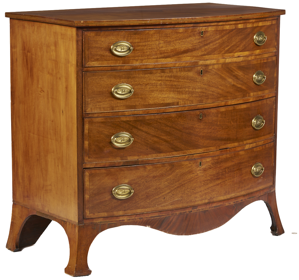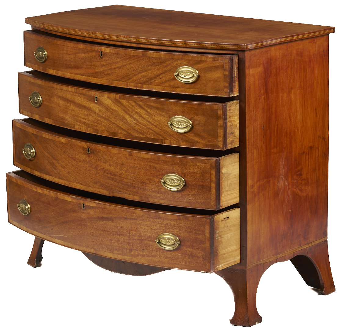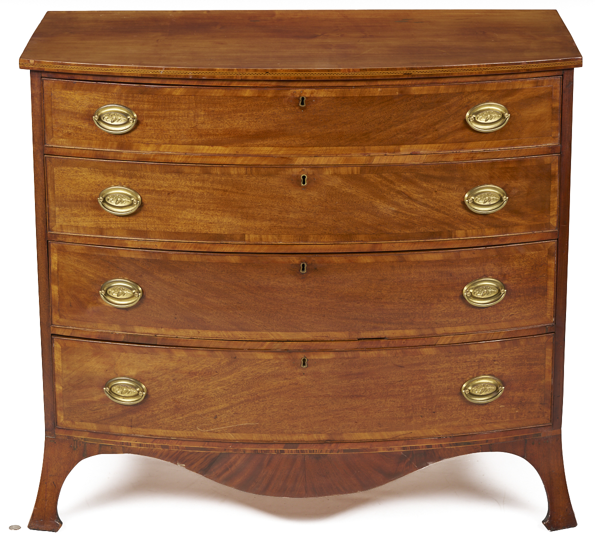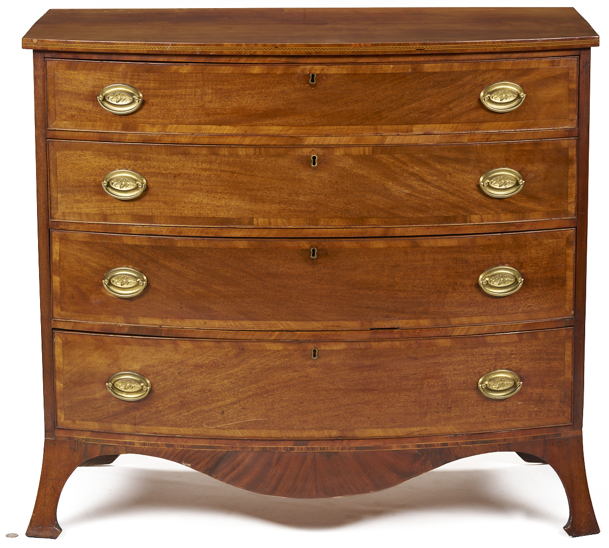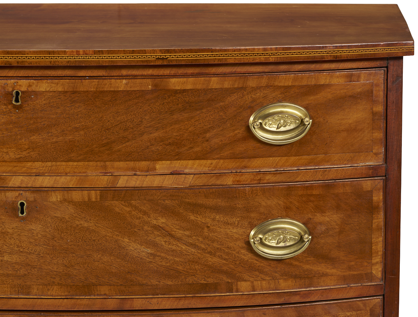 American Federal mahogany bowfront chest, likely New England, mahogany inlay, white pine secondary. Signed on the back “Thayer”. Slightly overhanging top with geometric step inlay above four graduated, banded, cockbeaded, and dovetailed figured mahogany drawers with oval brasses, inlaid band above the skirt, and highly splayed French front and back feet. 37 3/8 in. H x 41 1/4 in. W x 23 1/8 in. D. Circa 1800 – 1810.
