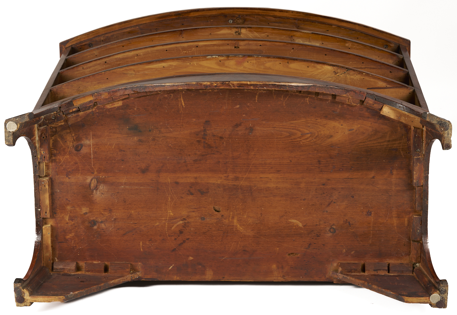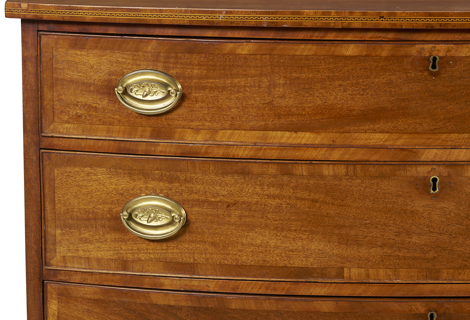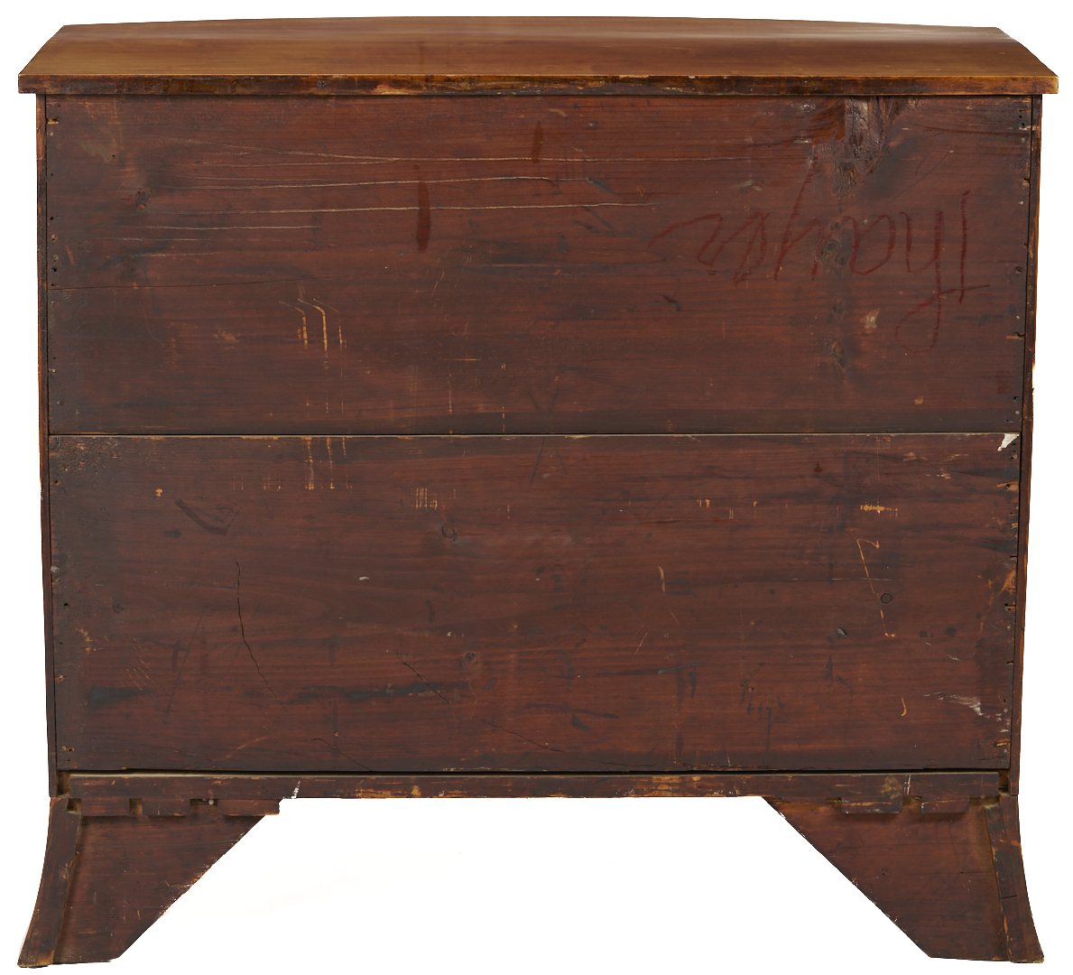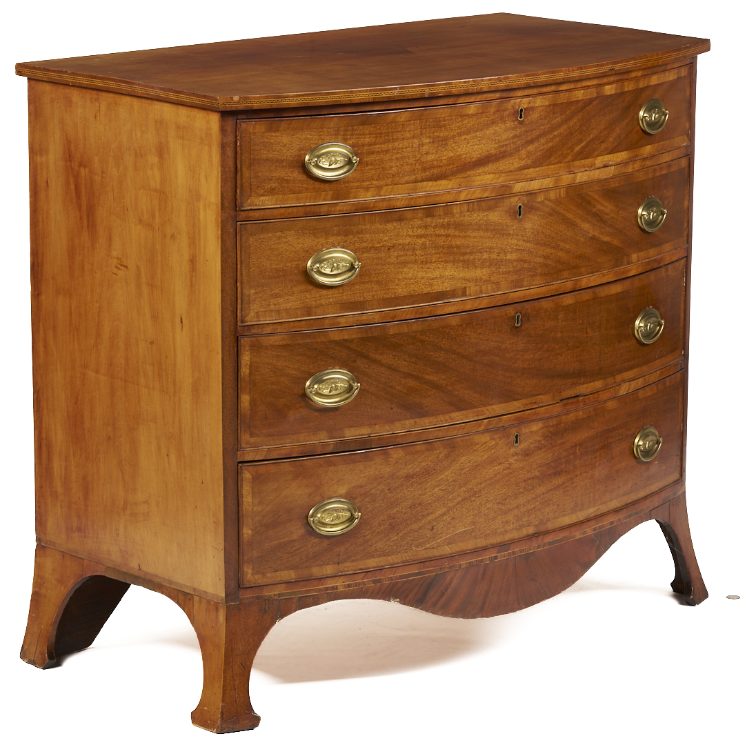 American Federal mahogany bowfront chest, likely New England, mahogany inlay, white pine secondary. Signed on the back “Thayer”. Slightly overhanging top with geometric step inlay above four graduated, banded, cockbeaded, and dovetailed figured mahogany drawers with oval brasses, inlaid band above the skirt, and highly splayed French front and back feet. 37 3/8 in. H x 41 1/4 in. W x 23 1/8 in. D. Circa 1800 – 1810.
