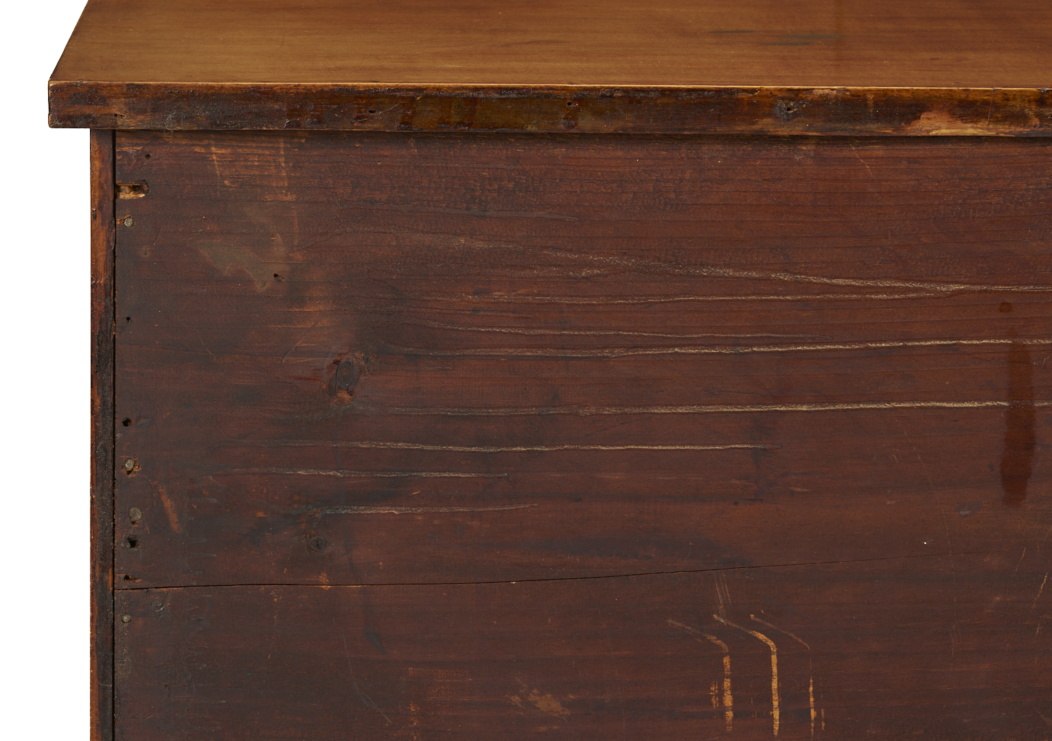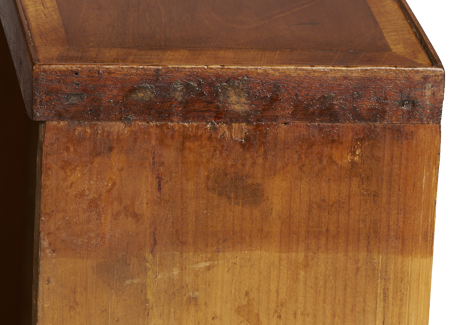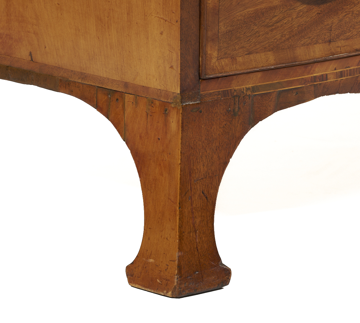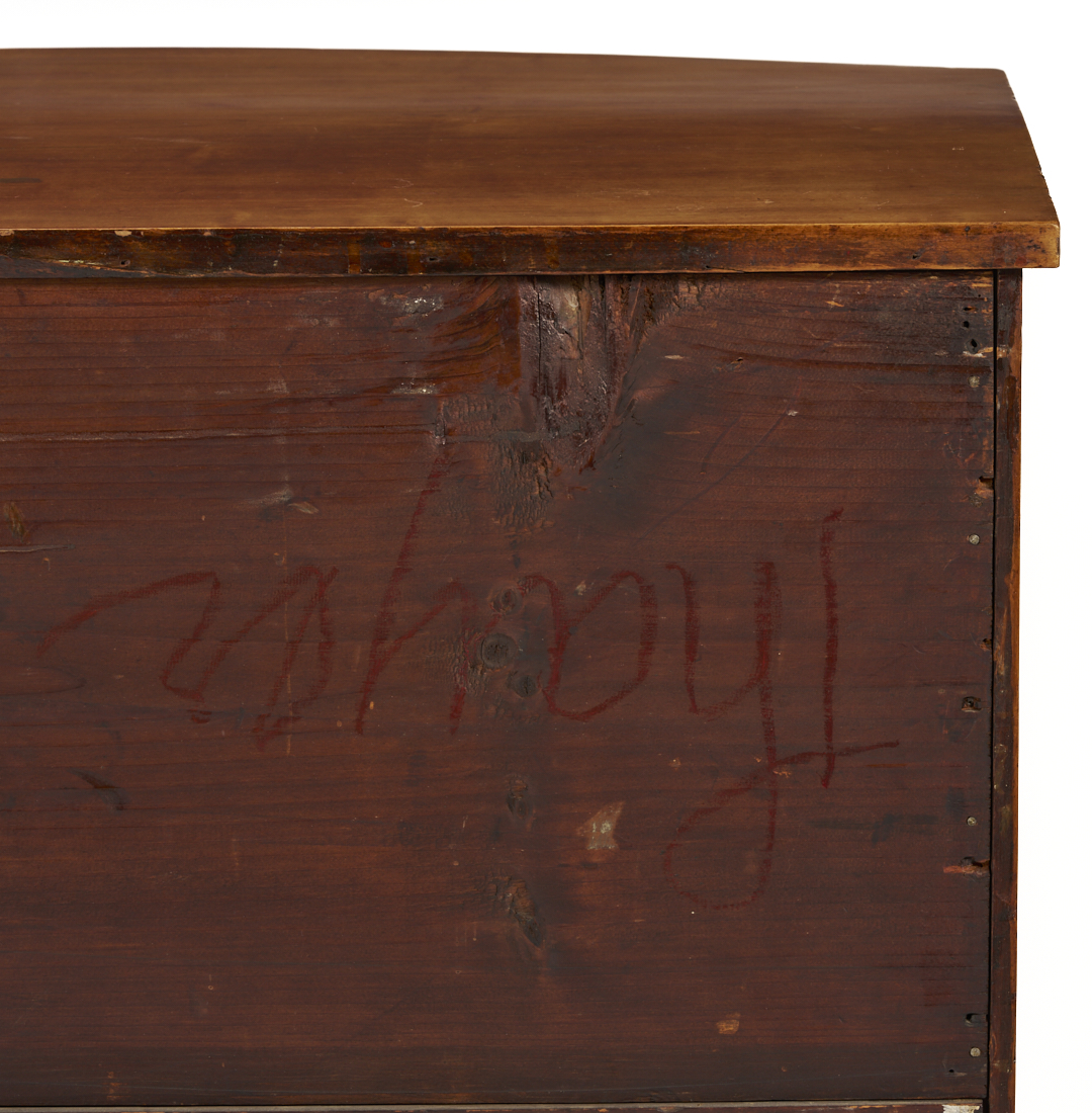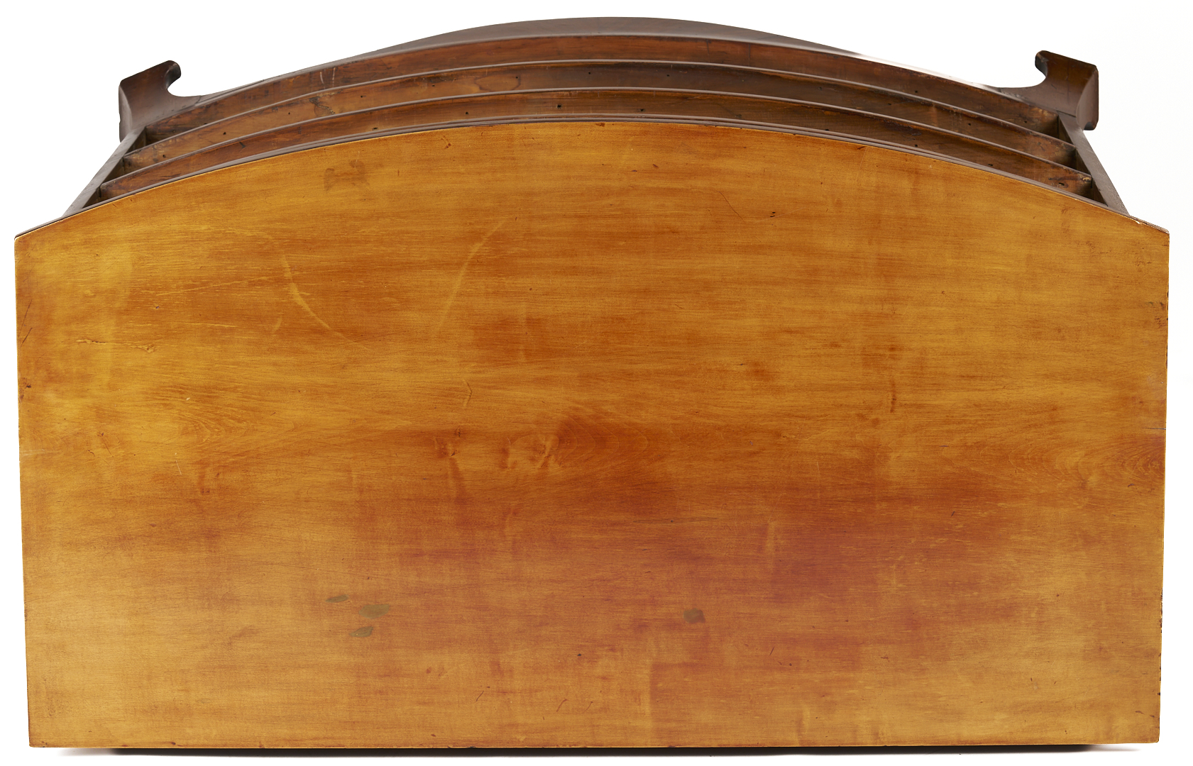 American Federal mahogany bowfront chest, likely New England, mahogany inlay, white pine secondary. Signed on the back “Thayer”. Slightly overhanging top with geometric step inlay above four graduated, banded, cockbeaded, and dovetailed figured mahogany drawers with oval brasses, inlaid band above the skirt, and highly splayed French front and back feet. 37 3/8 in. H x 41 1/4 in. W x 23 1/8 in. D. Circa 1800 – 1810.