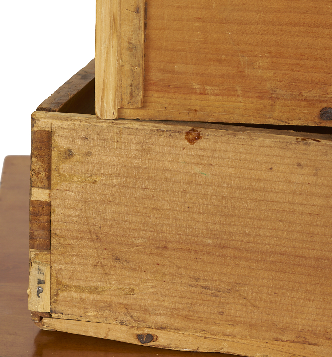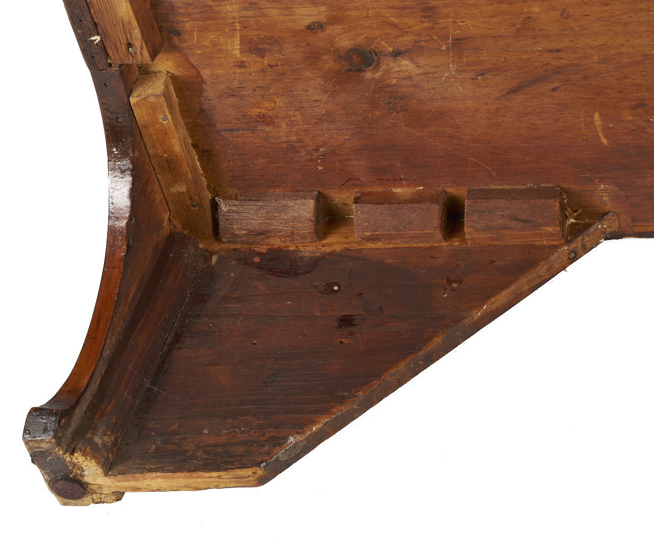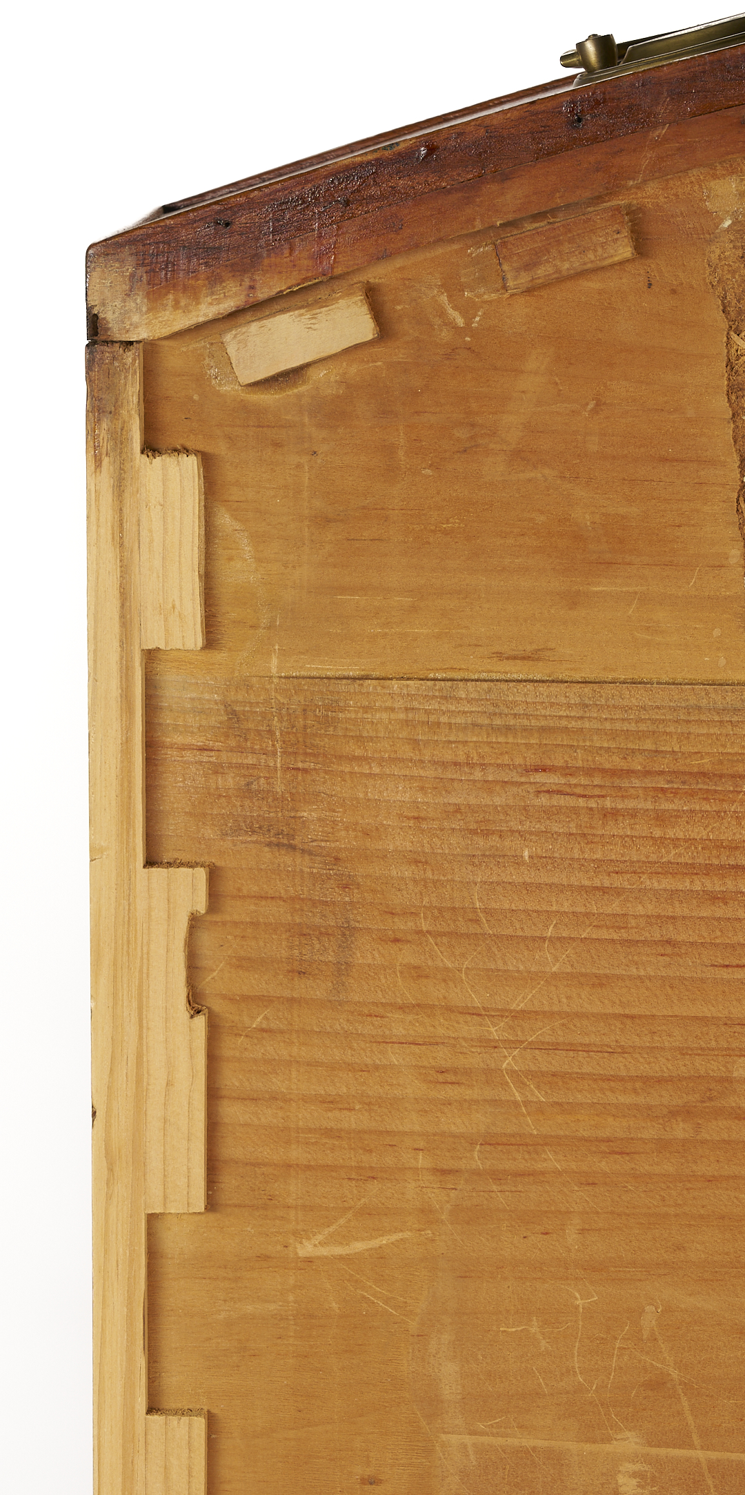 Older refinish with wear and minor losses around the top edge, some putty infill to the top. Scattered minor losses and repairs to the inlay along the top and base, replaced blocking segment behind front right foot. Case with minor scattered scratching and abrasions.