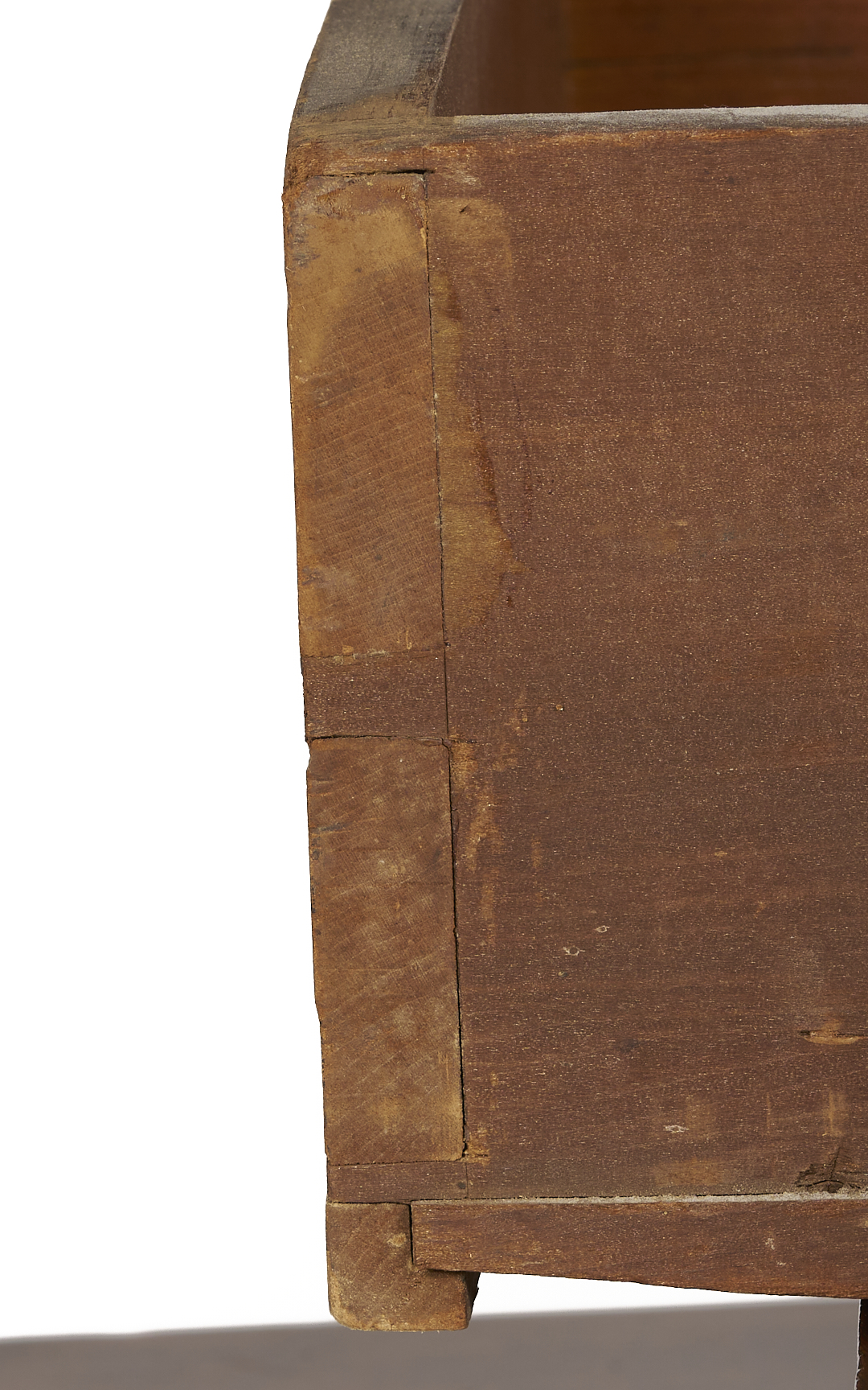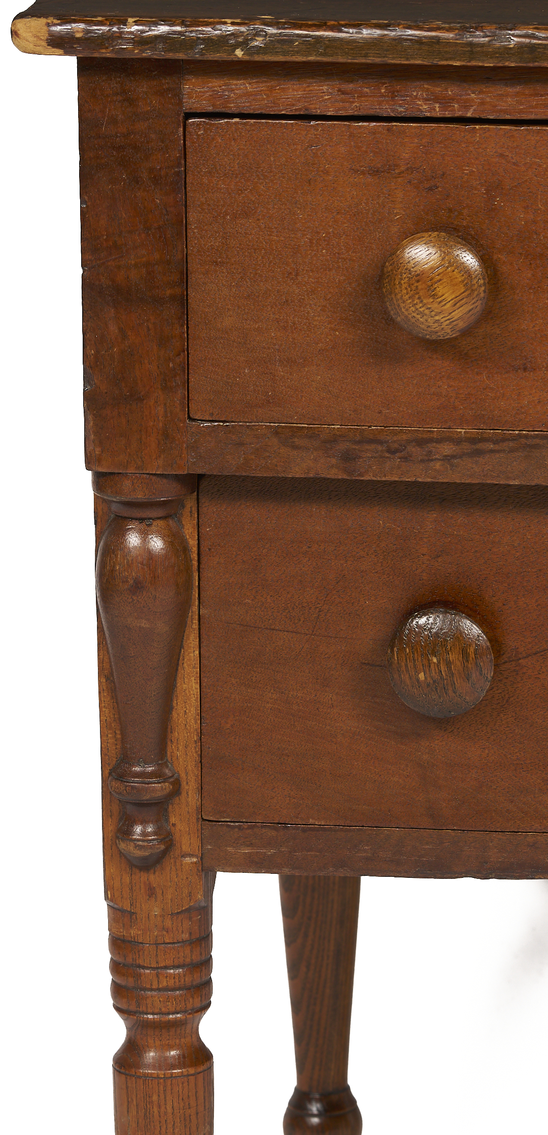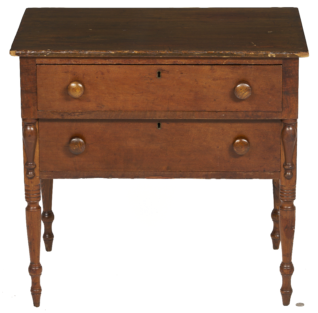 Diminutive Midwestern server or sideboard, poplar, oak, and cherry veneer. The top interior edge of the top drawer is stamped “T. M. Dilley”, possibly working in Lafayette or New Albany County, Indiana. Rectangular form with an overhanging top above one slightly overhanging full drawer and a lower full drawer, both of which are dovetailed and feature wood pulls. Flanked by half-turned pilasters and tapering ring turned feet. 28 1/2 in. H x 30 1/2 in. W x 20 1/2 in. D. Mid-19th century.
