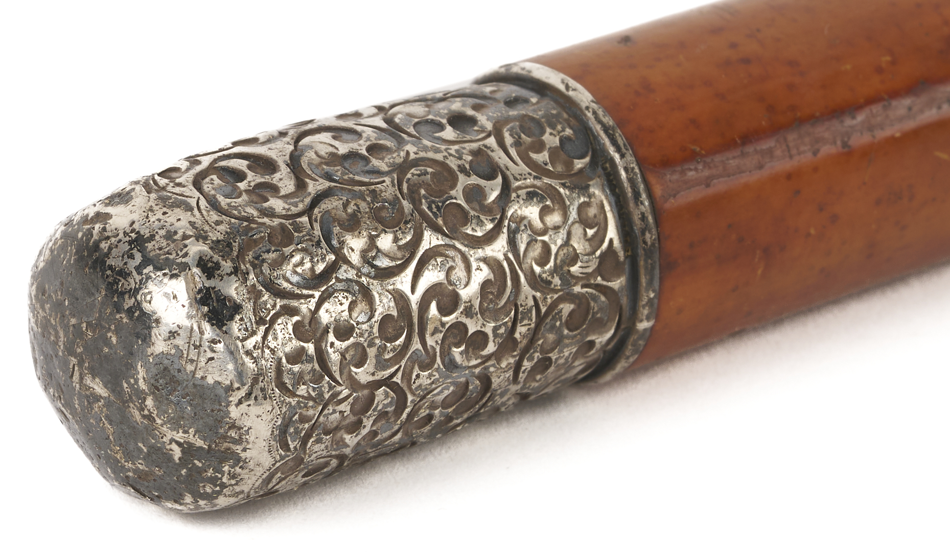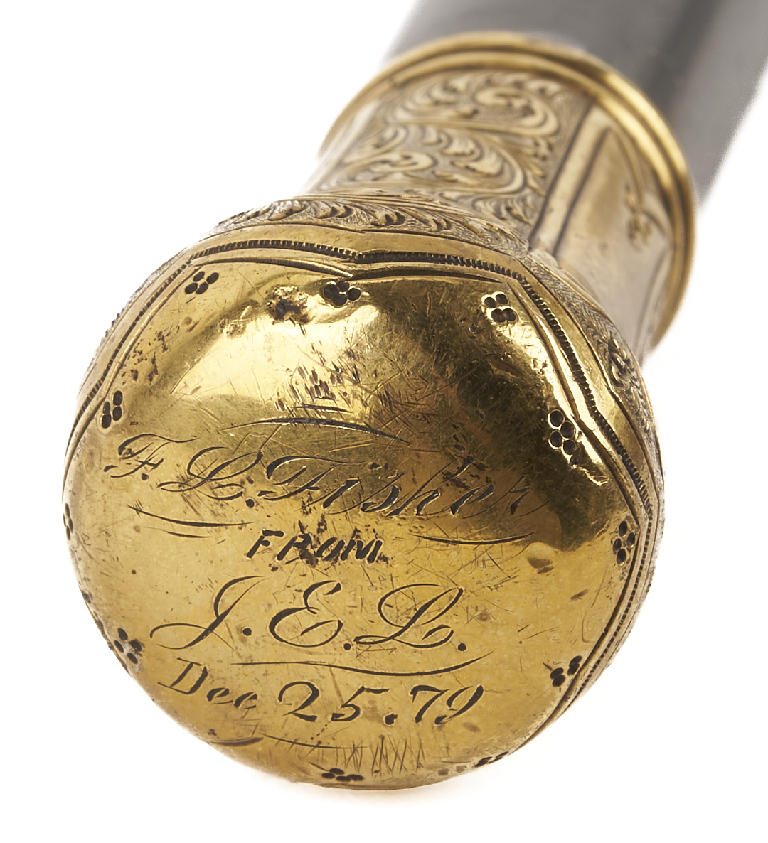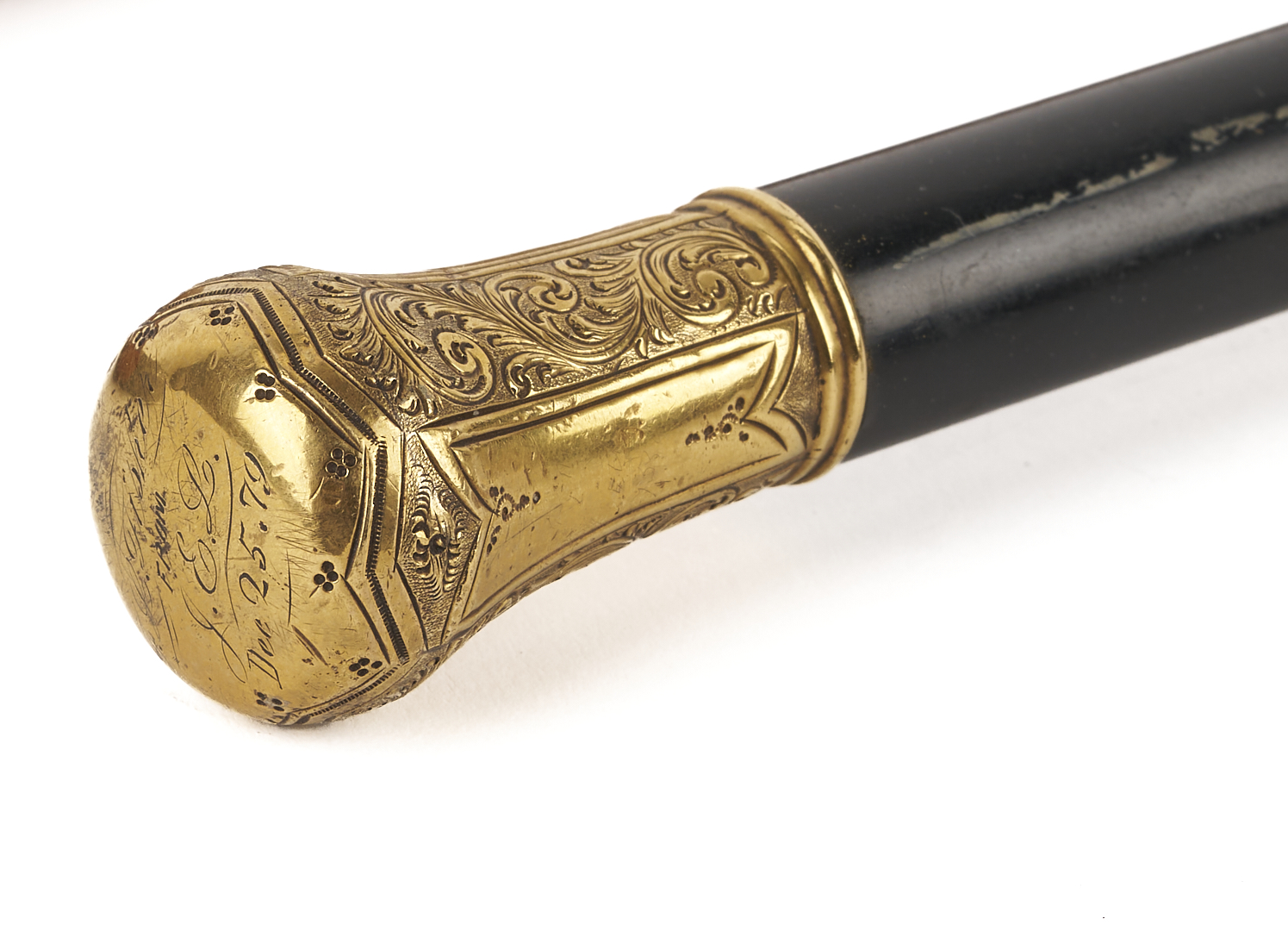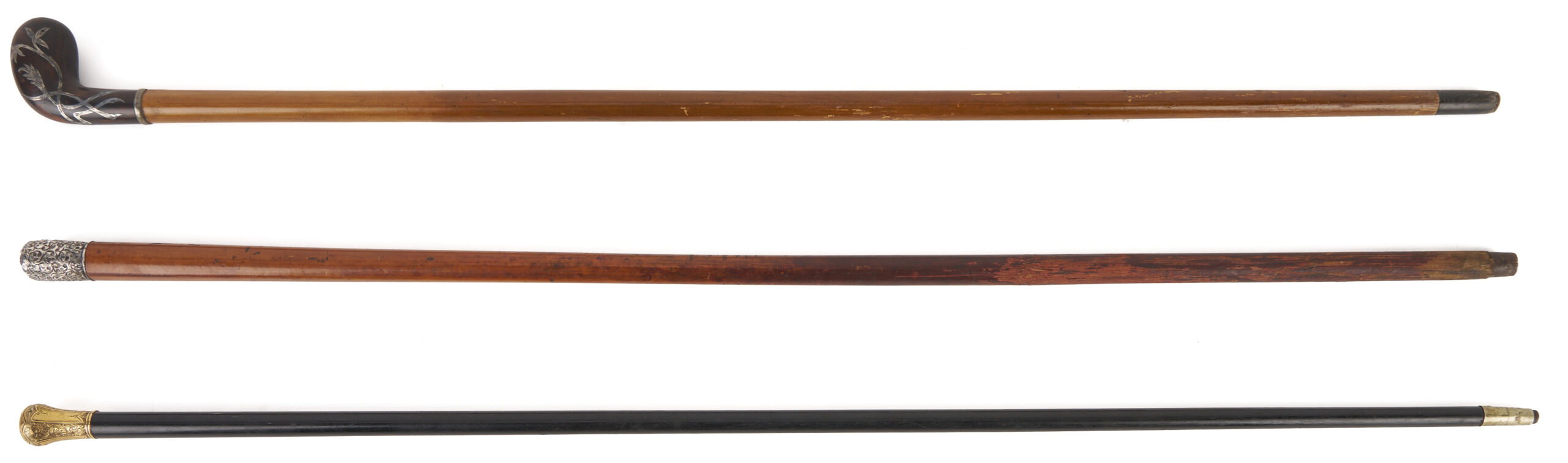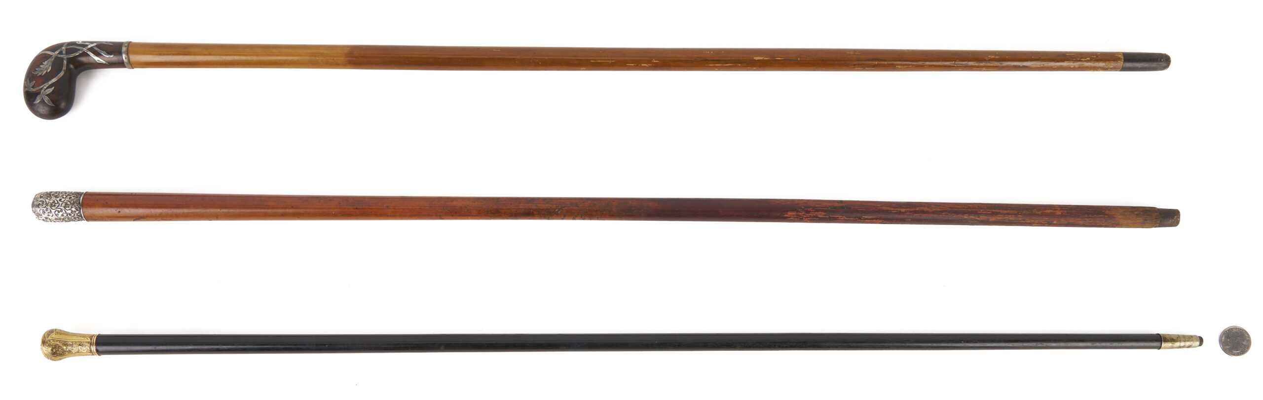 Group of three (3) walking sticks or canes with tapering shafts, including: one ebonized cane having a gold topper (XRF tested 14K) with inscription reading “F. L. Fischer from J. E. L. Dec. 25, 79,” 35 in. L; one rosewood cane with repousse silver topper, 35 in. L; and one rosewood or mahogany shaft cane with inlaid silver handle, 35 1/4 in. L. All canes late 19th century.