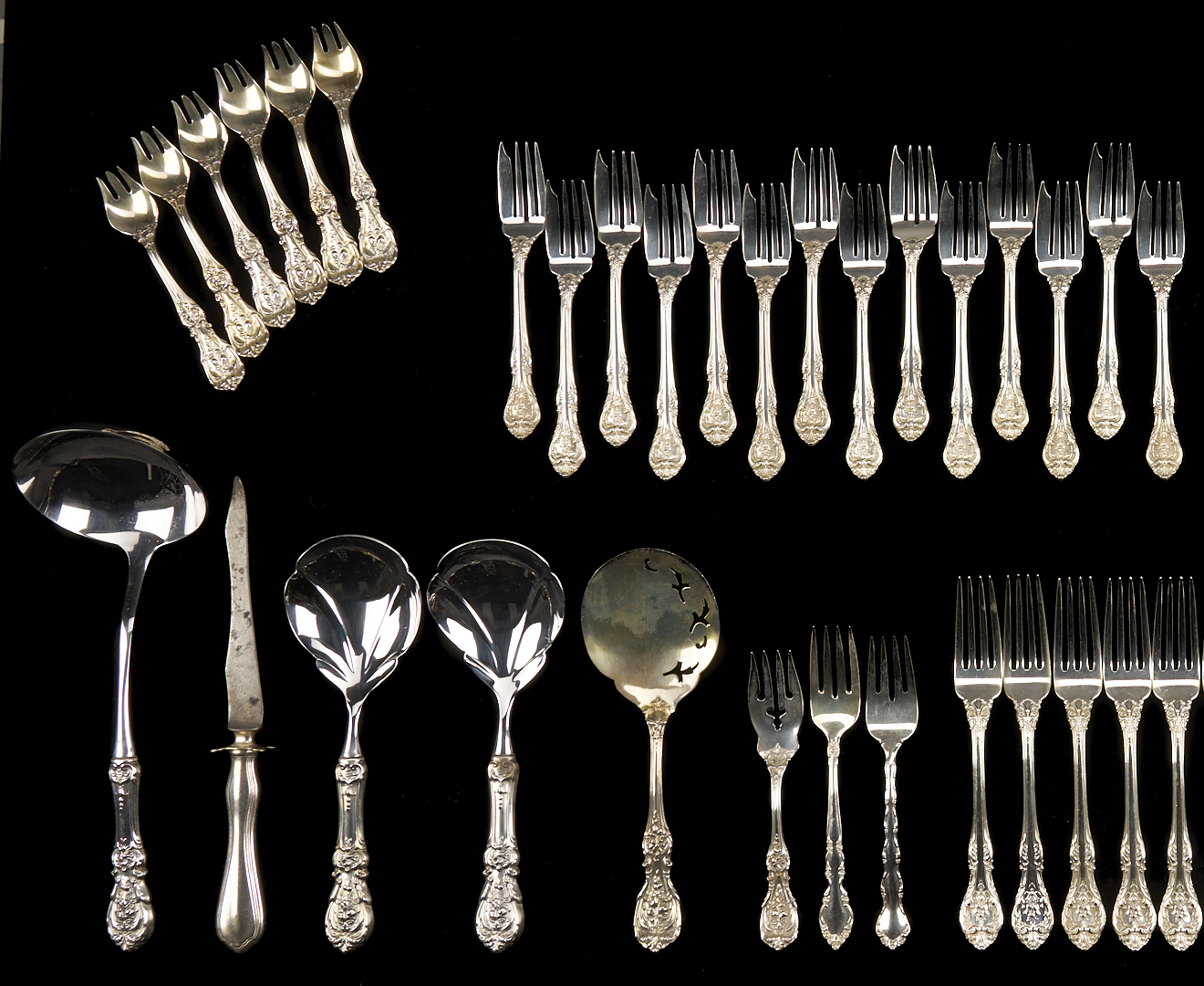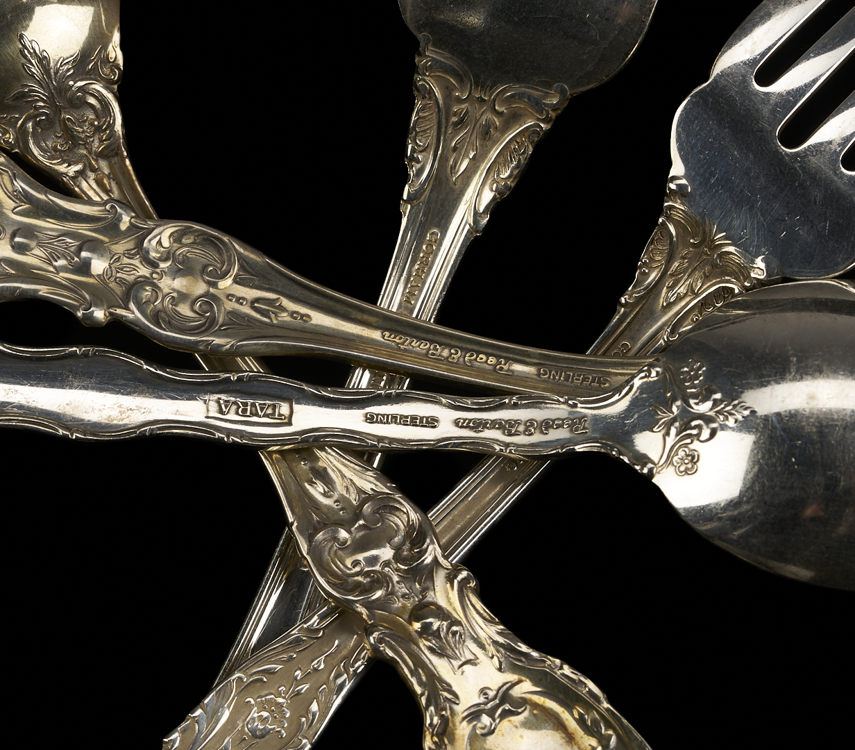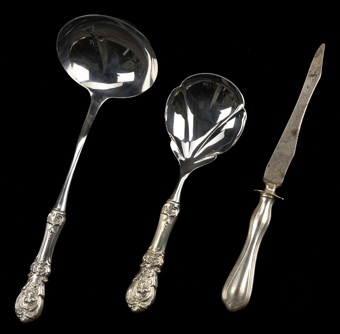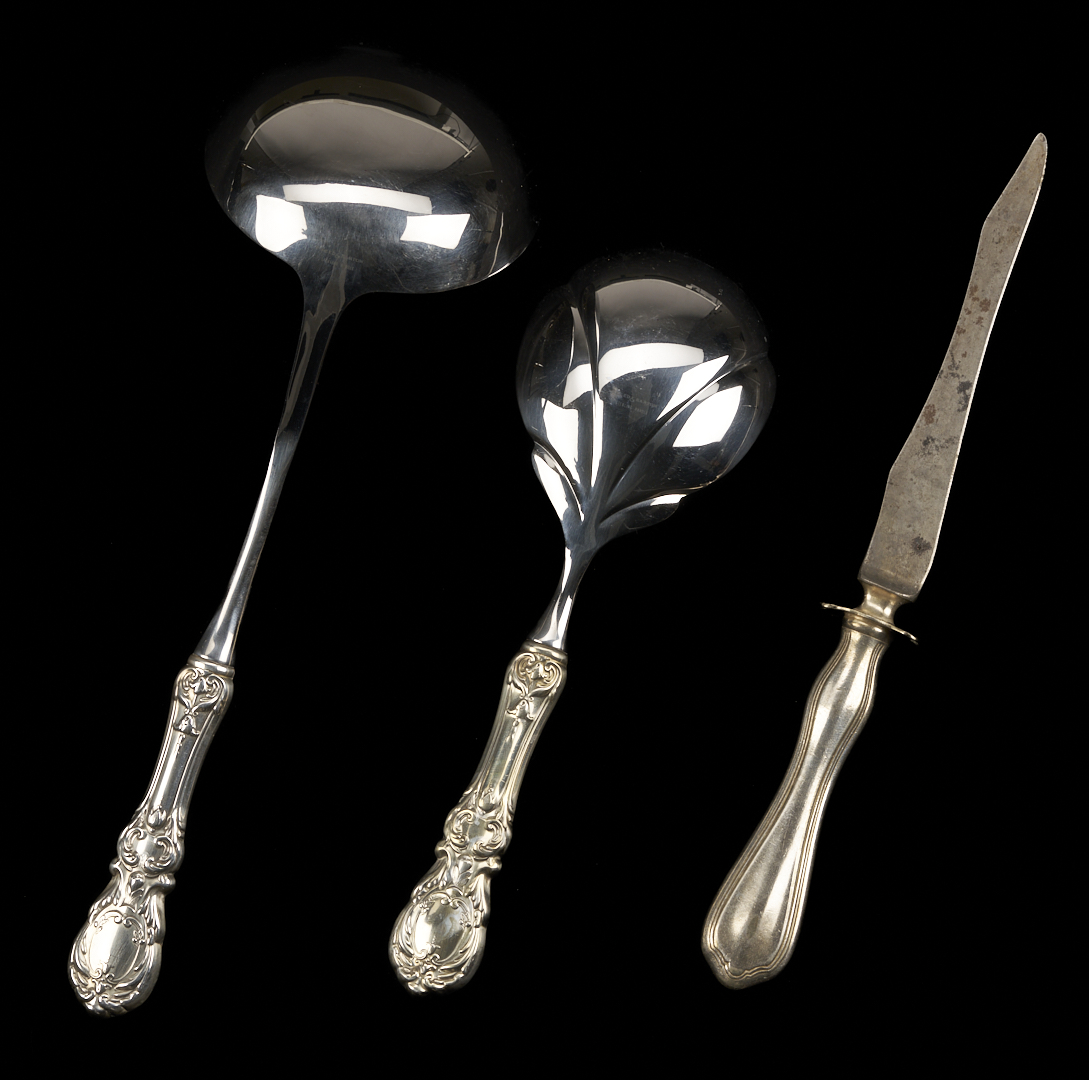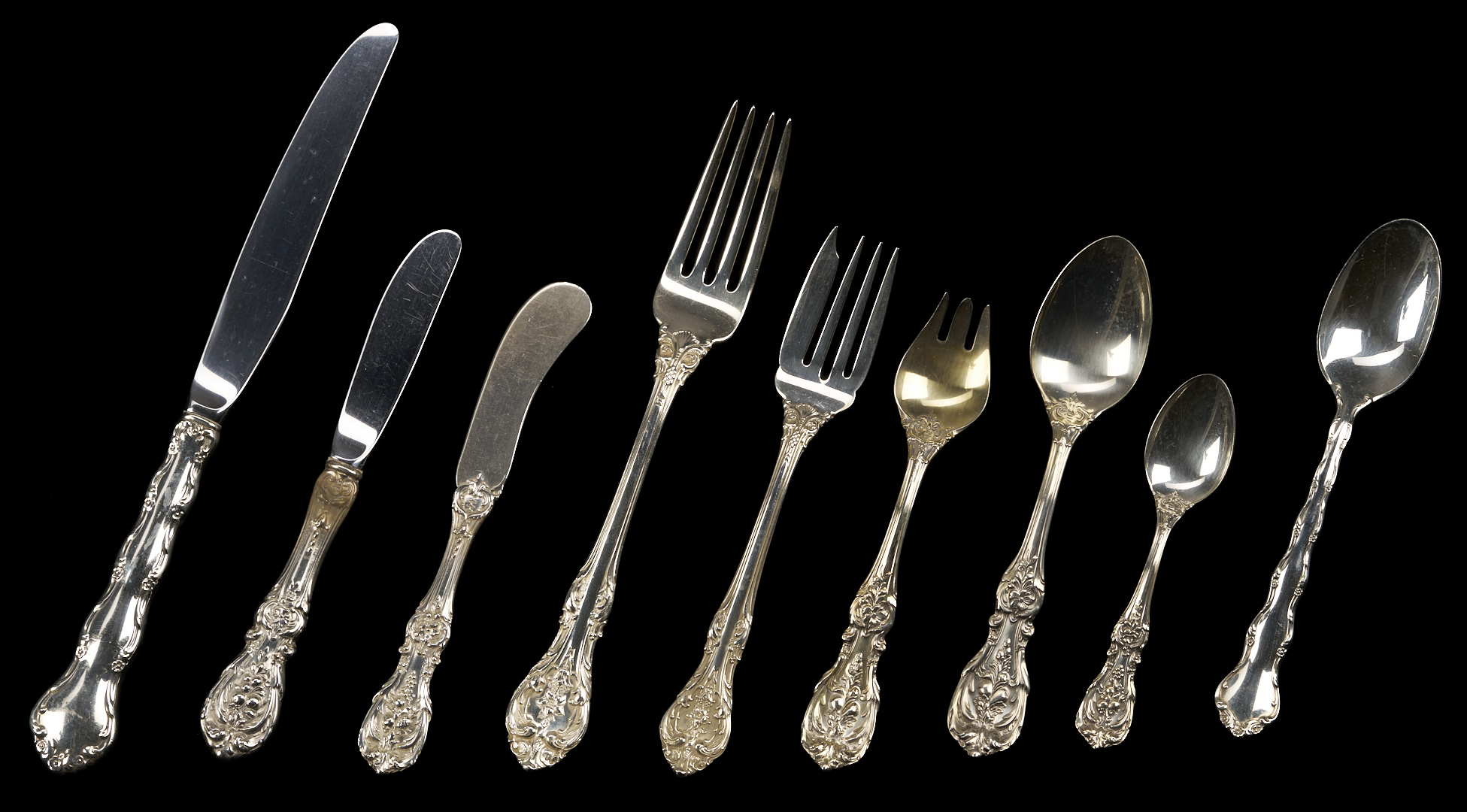 Sixty-three (63) assorted sterling silver flatware pieces, including: 23 pieces of Reed & Barton Francis 1st pattern including 3 teaspoons, 2 individual butter knives, 1 salad fork, 6 ice cream forks, 6 5 o’clock spoons, 1 tomato server, 1 master butter with stainless blade, 2 casserole spoons with scalloped stainless bowls, and 1 punch ladle; 26 Gorham King Edward pattern including 14 salad forks and 12 dinner forks; 10 pieces Reed & Barton Tara pattern including 1 salad fork, 3 dinner forks, 3 teaspoons, 3 dinner knives; and 1 Heirloom sugar spoon, 1 Heirloom salad fork, 1 Whiting bon bon spoon, and 1 carving spoon. 72.04 total weighable troy ounces.