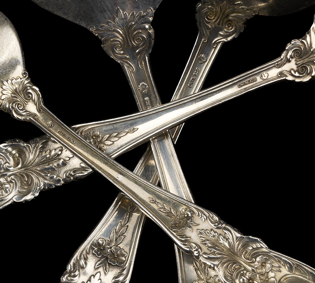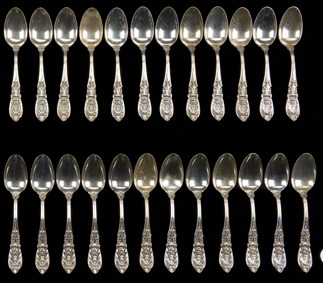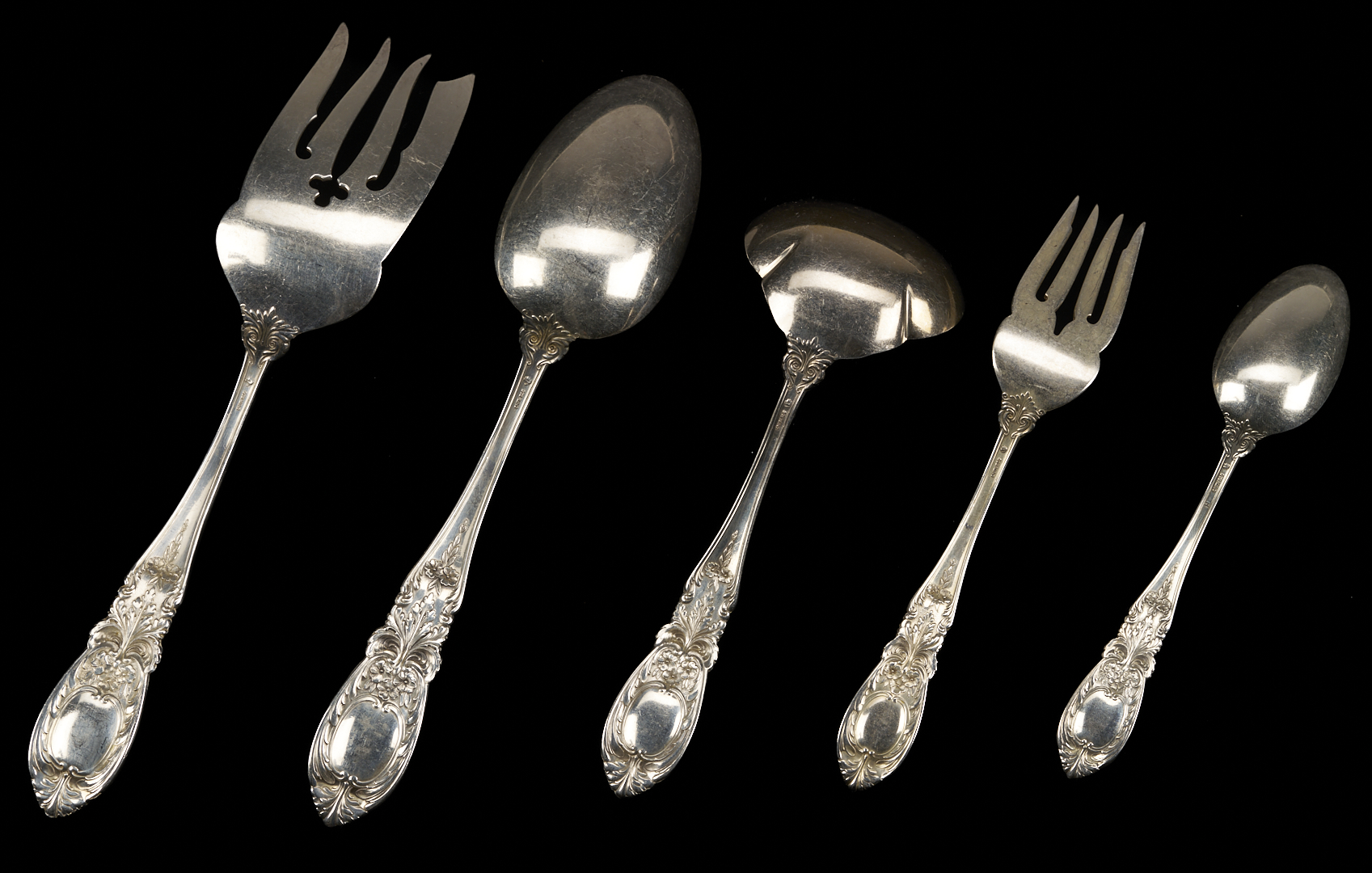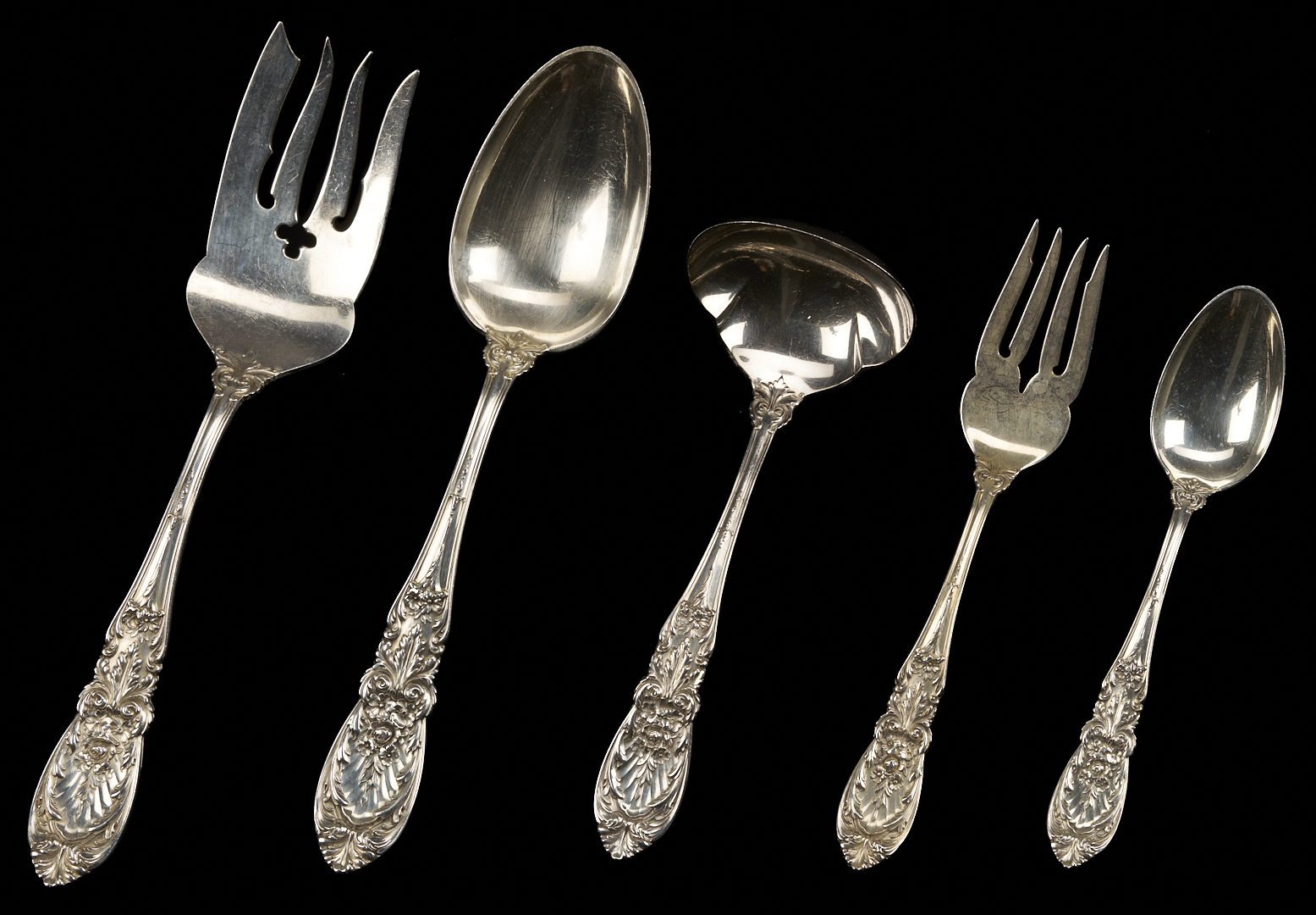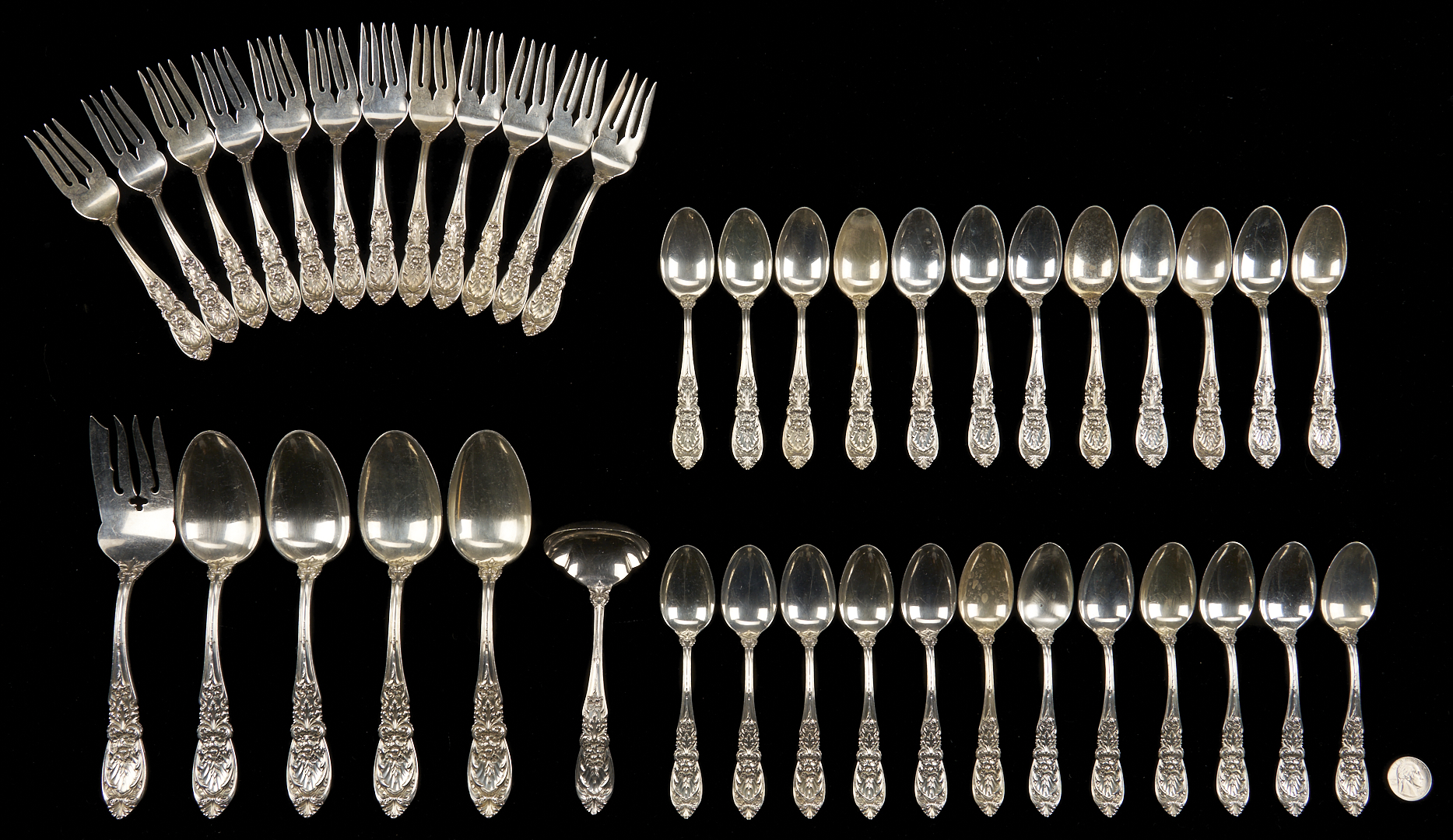 42 pieces International Sterling Silver flatware in the Richelieu pattern (introduced 1935). Includes 12 salad/dessert forks, 24 teaspoons, 4 tablespoons, 1 meat serving fork (8 7/8 in. L), and 1 gravy ladle. Combined weight: 69.31 oz troy. No monograms. Note: a sterling tea set in this pattern is also for sale in this auction.