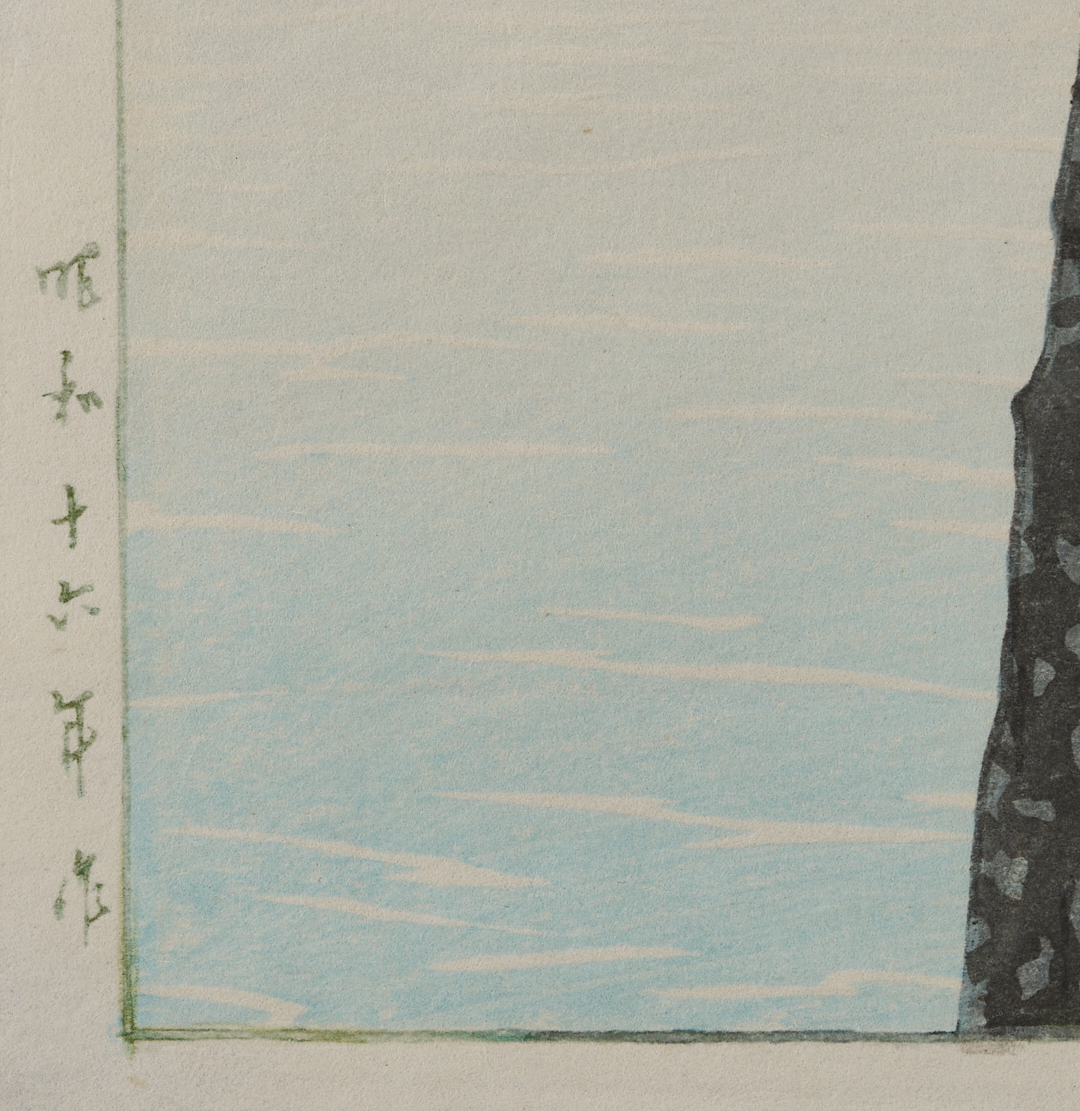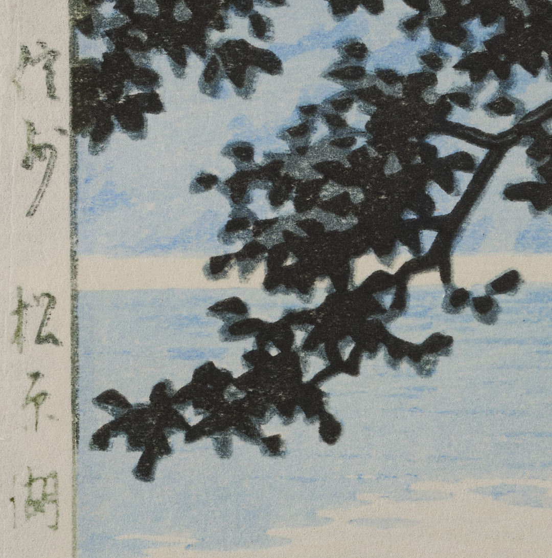 Kawase Hasui (Japan, 1883-1957) oban shin-hanga woodblock print, “Shinshu Matsubarako (Lake Matsubara in Shinano Province),” 1941. A fisherman holds a rod and sits beneath the branches of a tree, with the blue water of Lake Matsubara before him. Published by Shozaburo Watanabe with postwar approximately 6mm publisher’s seal, lower right. With Hasui’s signature and seal in image, lower right. Unframed. Sheet: 10 1/2 in. H x 15 1/2 in. W.