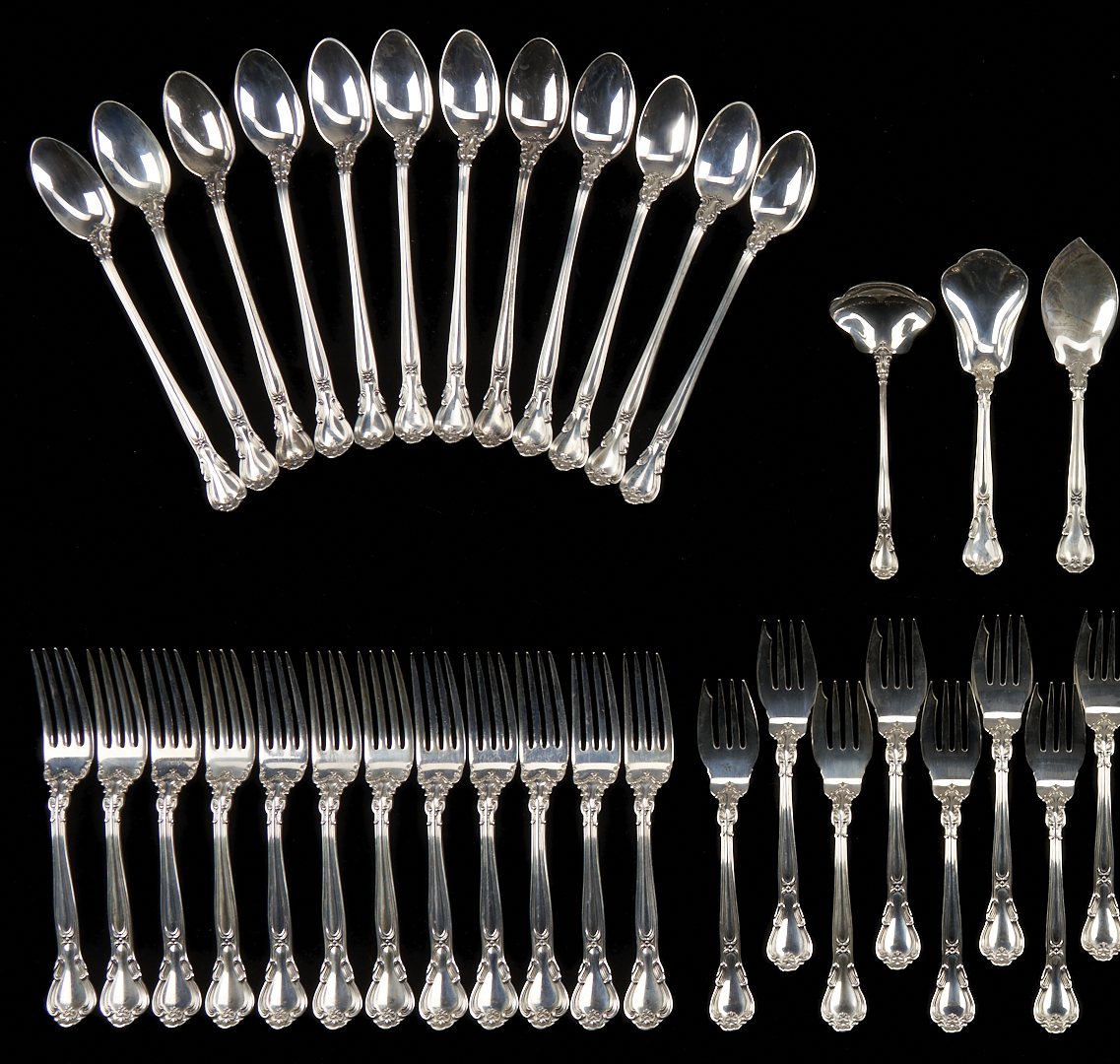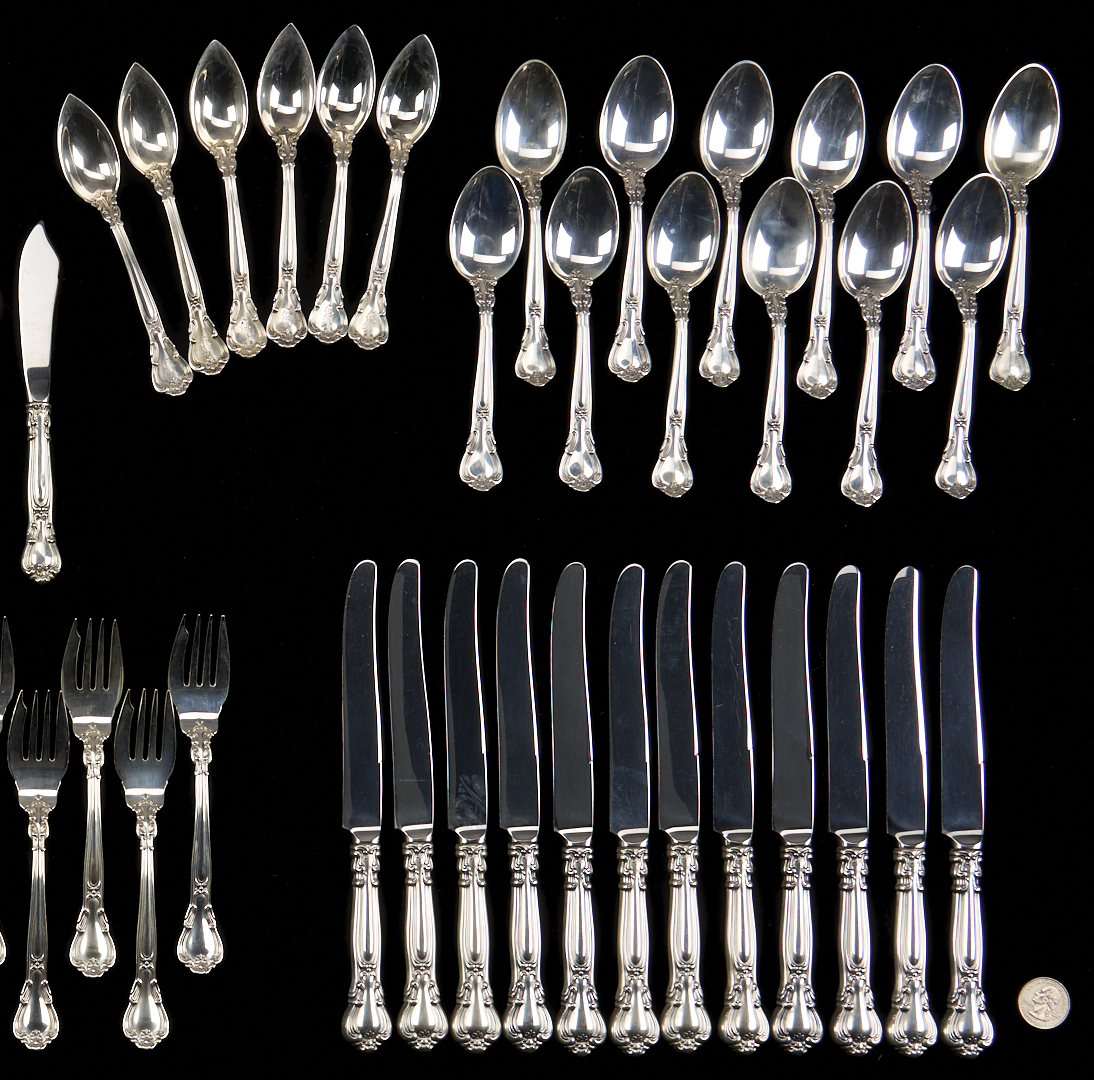 Seventy (70) pieces of Gorham Chantilly pattern sterling flatware including 12 dinner knives (8 7/8 in. L), 12 dinner forks (7 in. L), 12 salad forks, 12 teaspoons, 12 iced tea spoons, 6 fruit spoons, 1 sugar spoon, 1 jelly server, 1 cream ladle, and 1 master butter knife. 62.61 total weighable troy ounces.