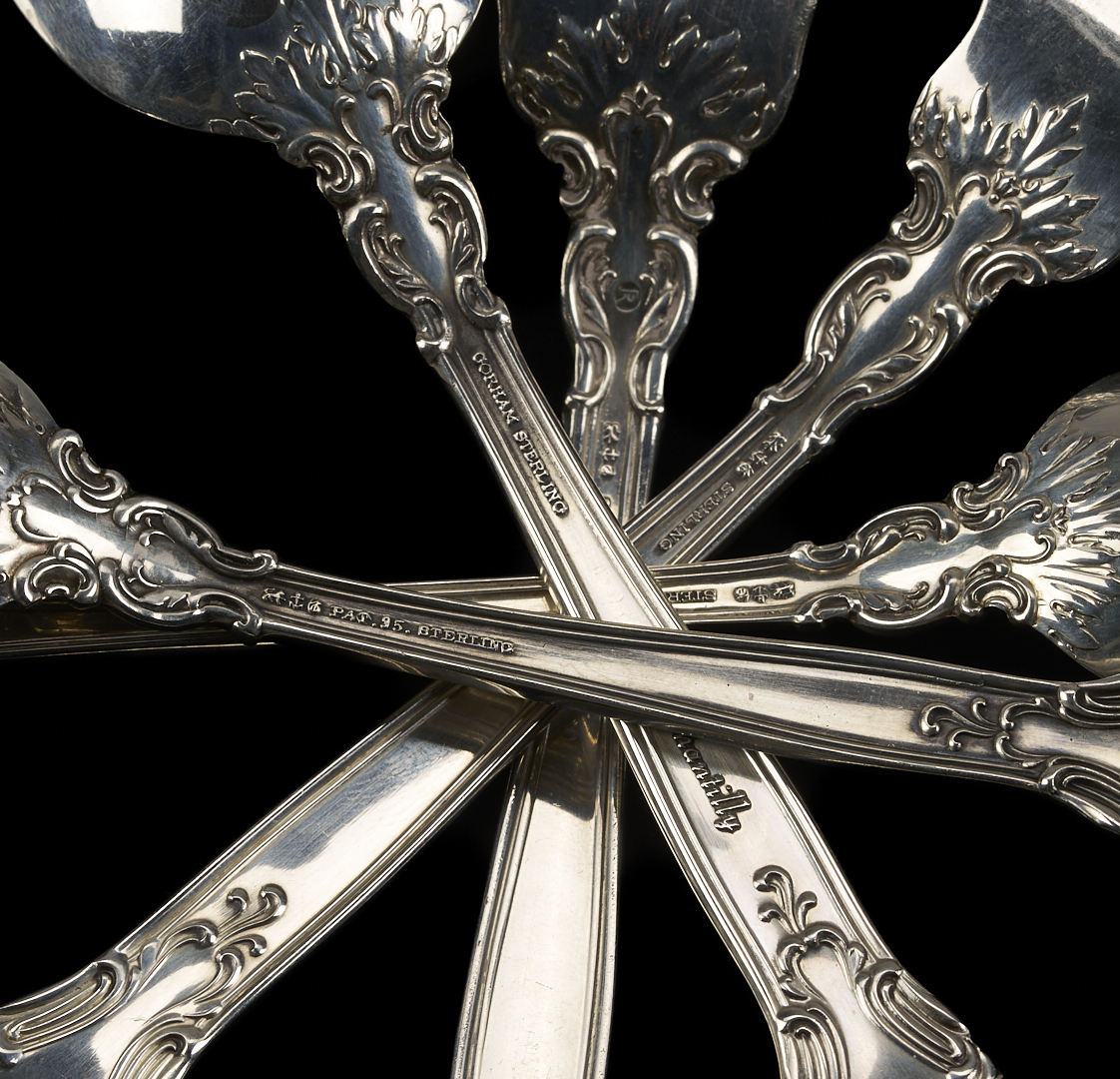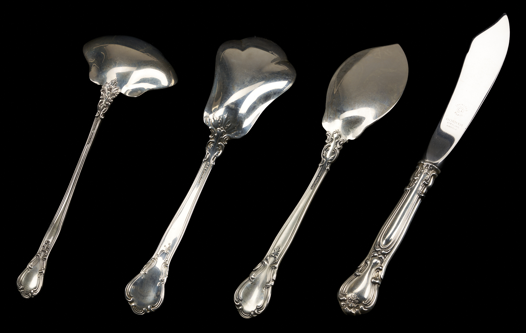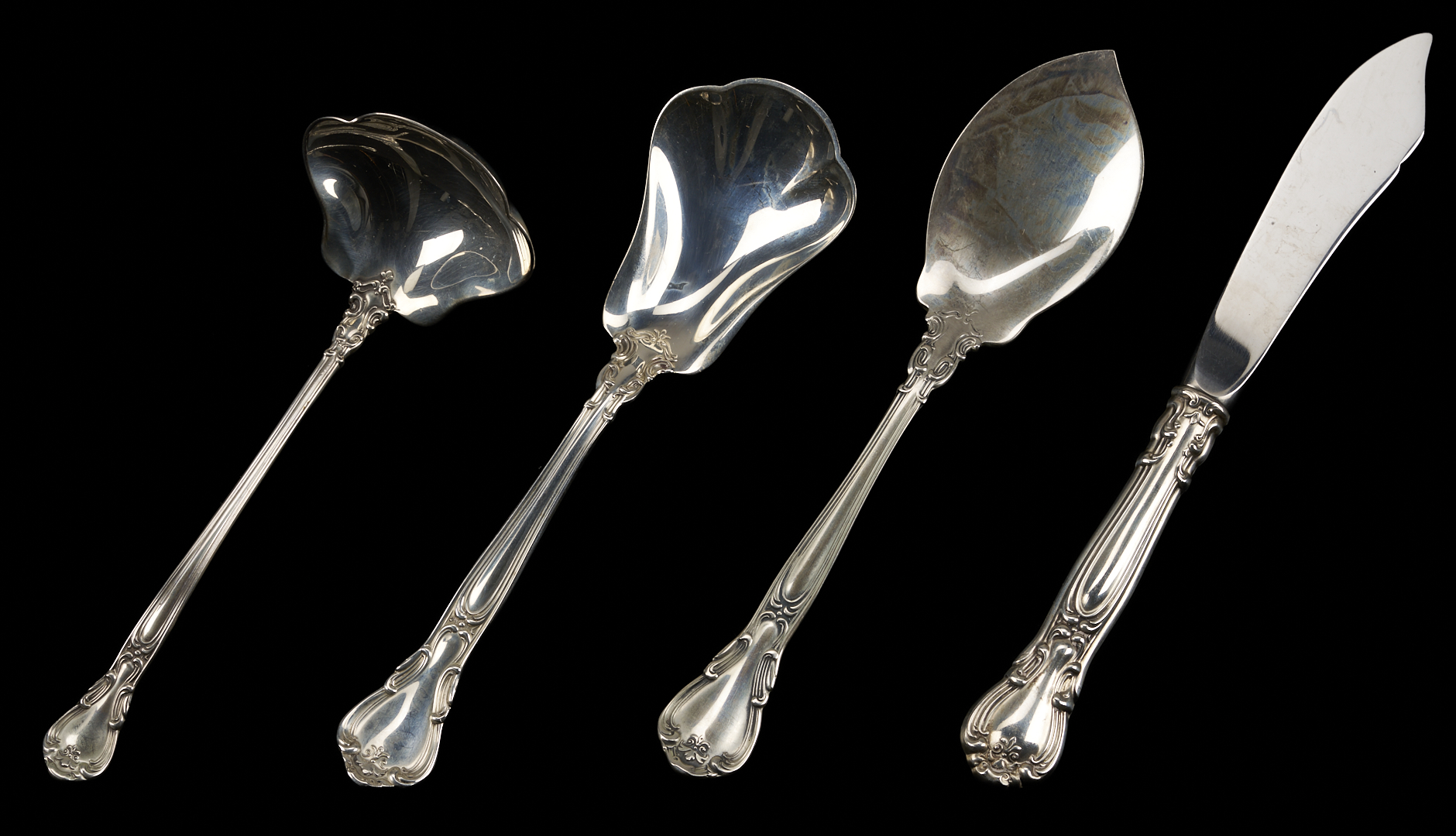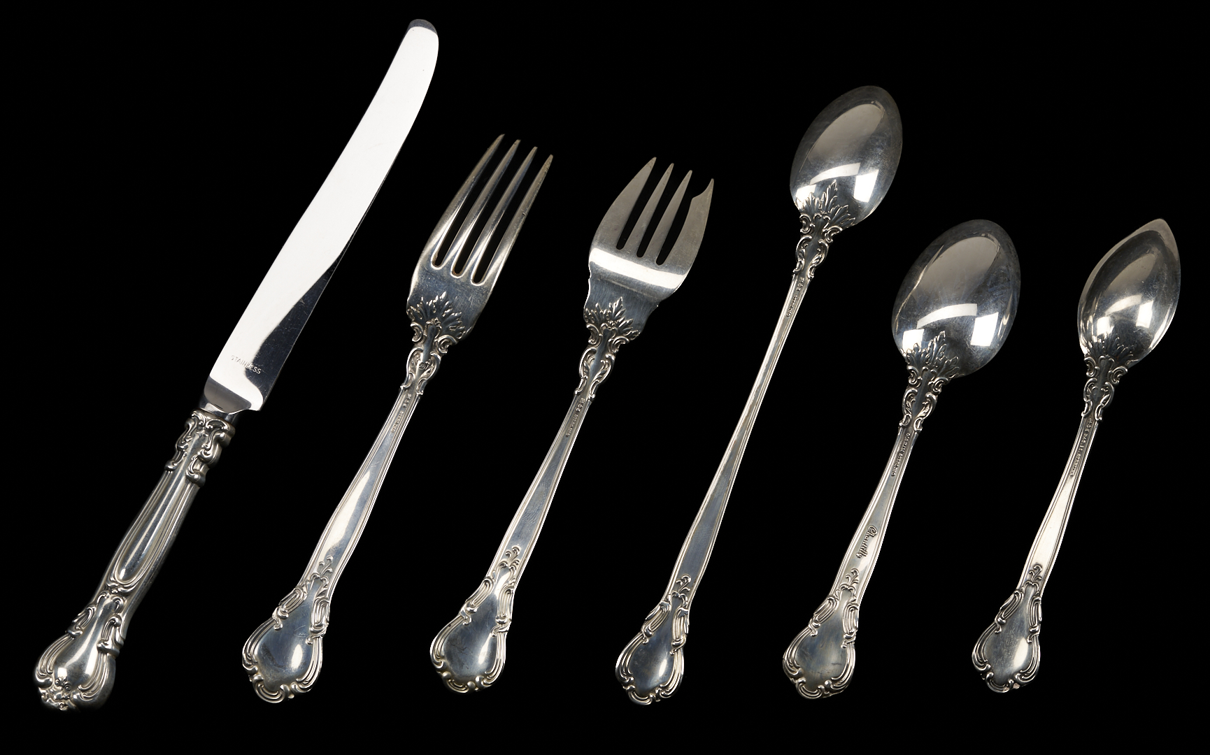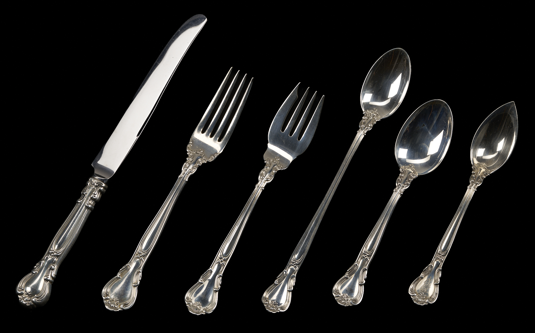 All pieces are in very good condition. All pieces without monograms except the 6 fruit spoons.