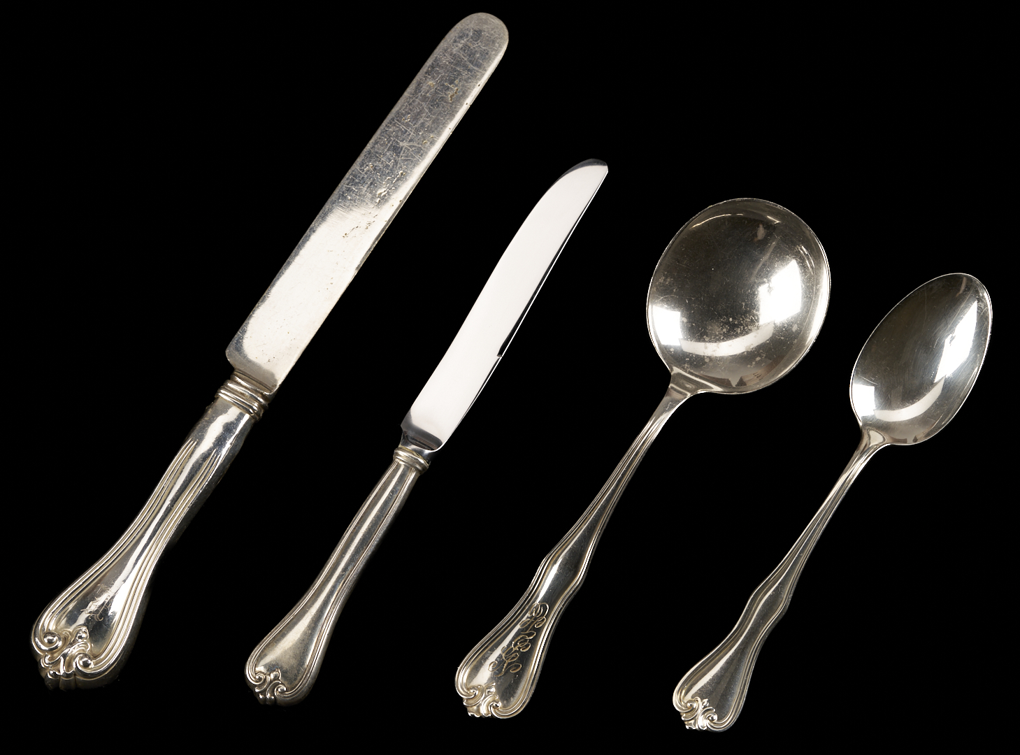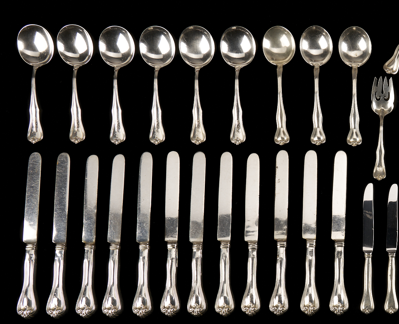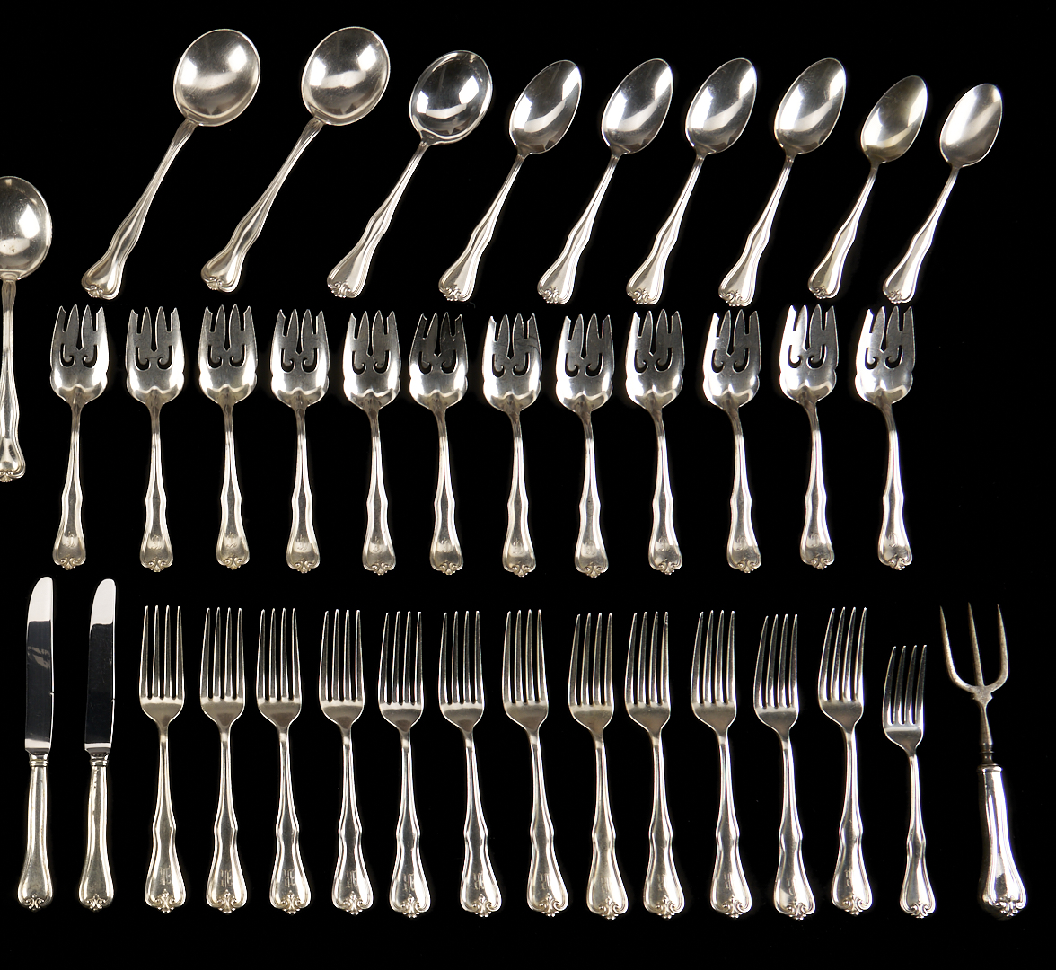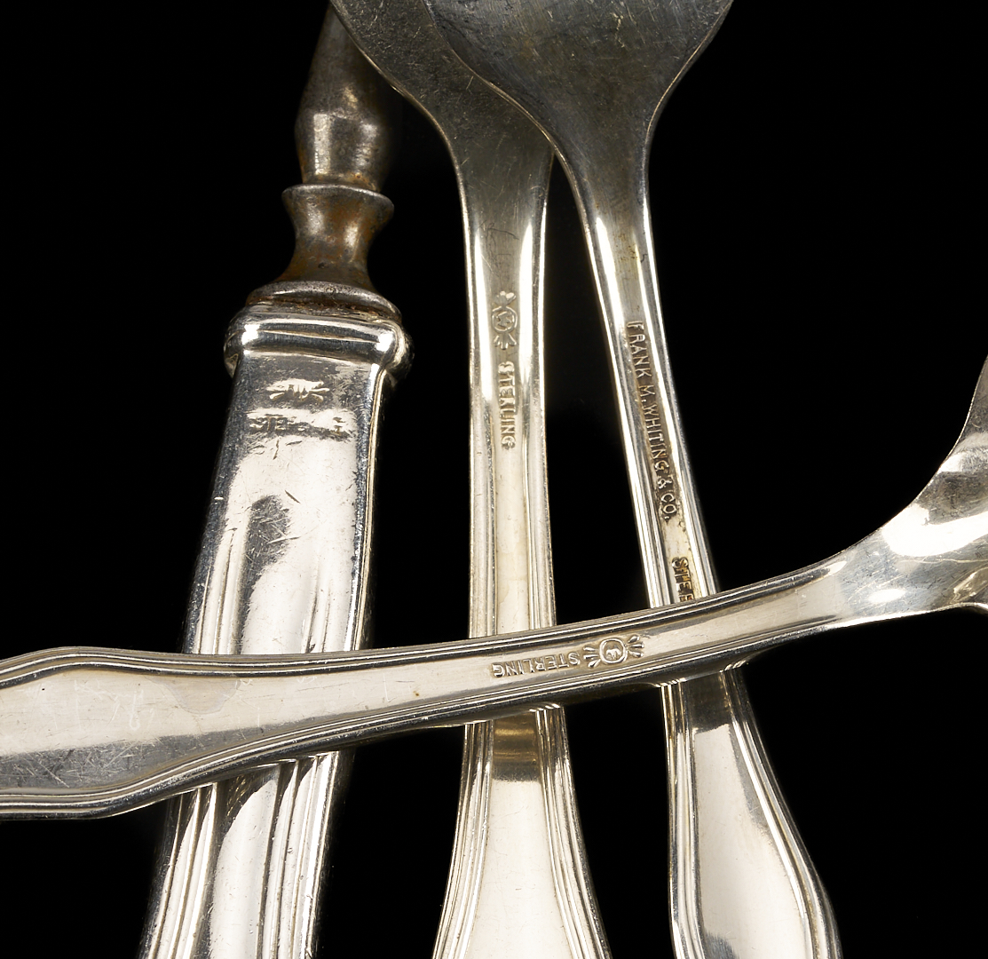 58 pieces sterling silver flatware, most in the Puritan pattern by Frank M. Whiting (introduced 1905). Includes 12 dinner knives (9 1/4 in. L), 12 luncheon or dessert forks (6 5/8 in. L), 12 salad/dessert/fish forks (6 in. L), 4 teaspoons (6 in. L), 2 coffee spoons (5 1/2 in. L), 2 youth knives, 1 youth fork, 1 three-pronged beef fork, and 6 gumbo soup spoons, plus 1 round bowl cream soup spoon, all in the Whiting Puritan pattern, together with 5 gumbo soup spoons by Watson in the very similar Mt. Vernon pattern (introduced 1907). Various monograms. Combined weighable sterling: 57.88 oz troy.