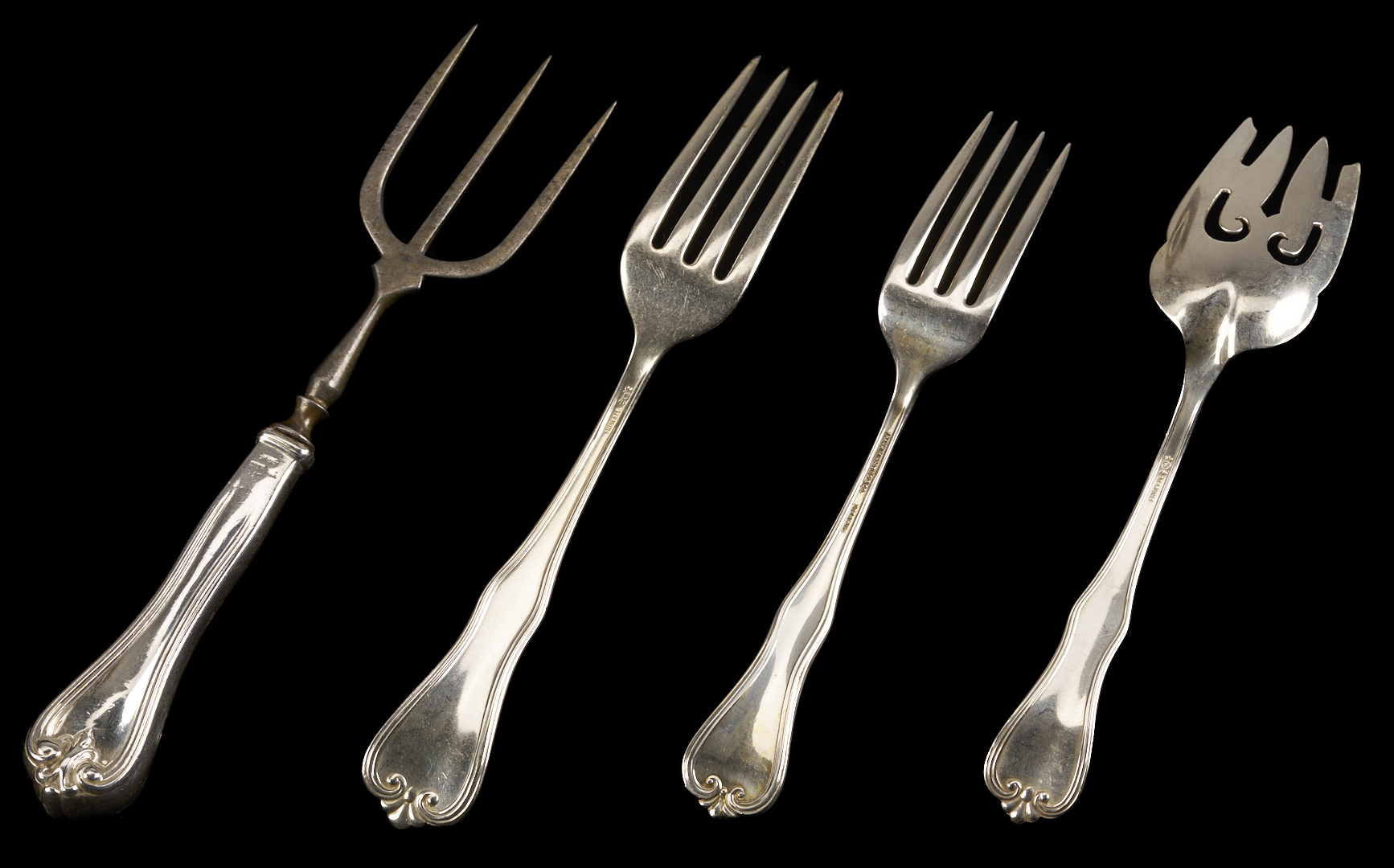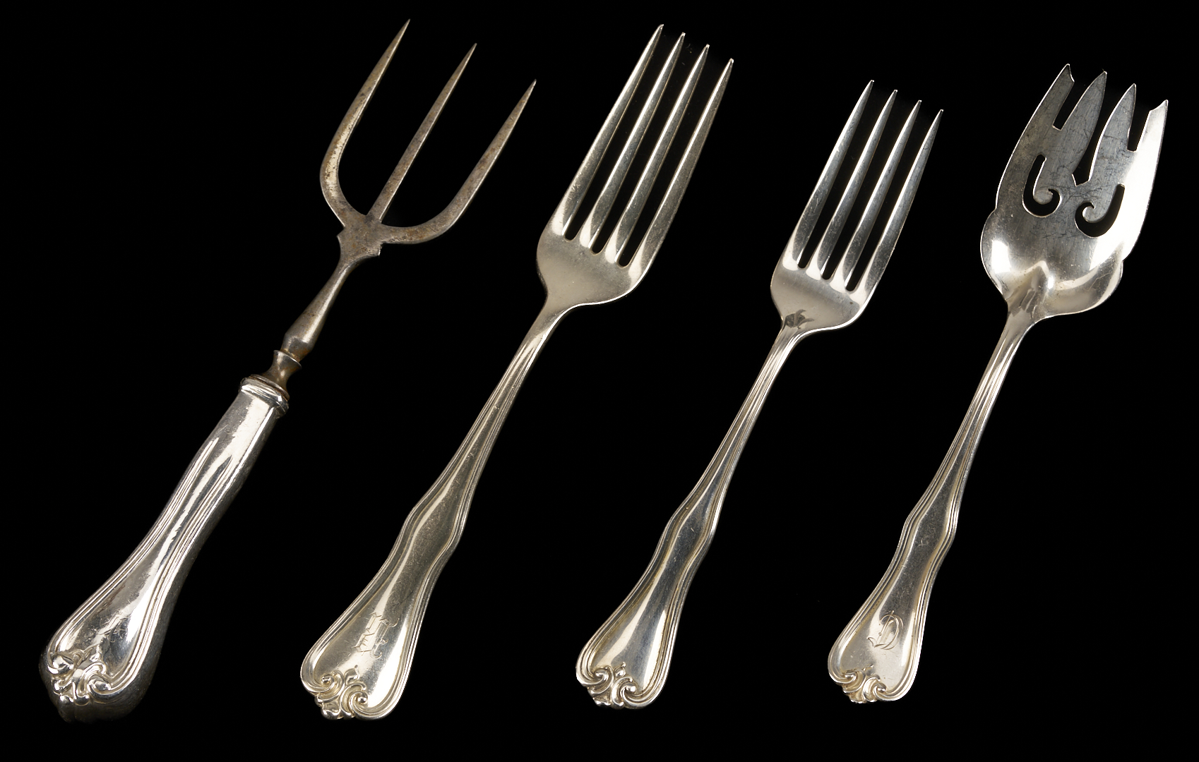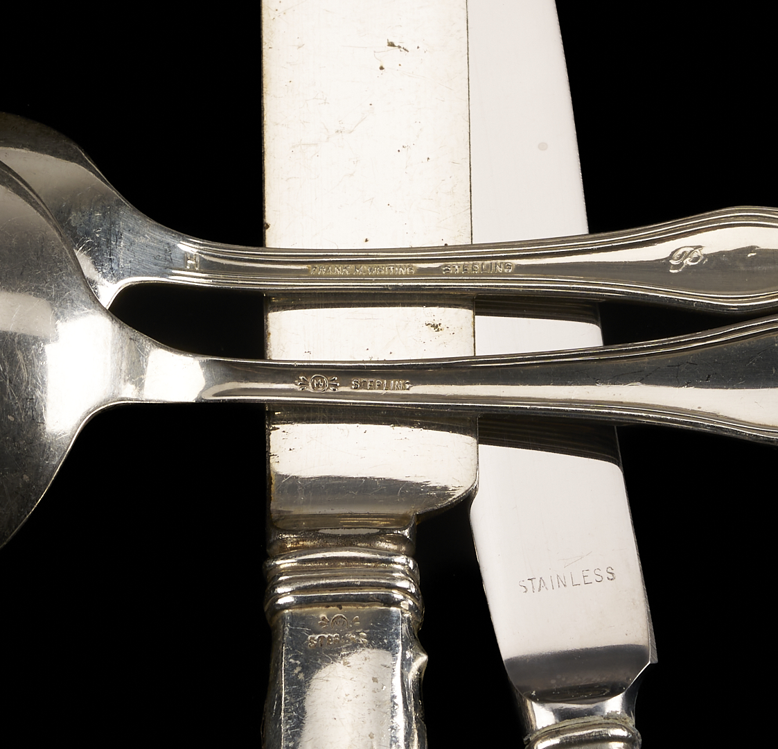 58 pieces sterling silver flatware, most in the Puritan pattern by Frank M. Whiting (introduced 1905). Includes 12 dinner knives (9 1/4 in. L), 12 luncheon or dessert forks (6 5/8 in. L), 12 salad/dessert/fish forks (6 in. L), 4 teaspoons (6 in. L), 2 coffee spoons (5 1/2 in. L), 2 youth knives, 1 youth fork, 1 three-pronged beef fork, and 6 gumbo soup spoons, plus 1 round bowl cream soup spoon, all in the Whiting Puritan pattern, together with 5 gumbo soup spoons by Watson in the very similar Mt. Vernon pattern (introduced 1907). Various monograms. Combined weighable sterling: 57.88 oz troy.