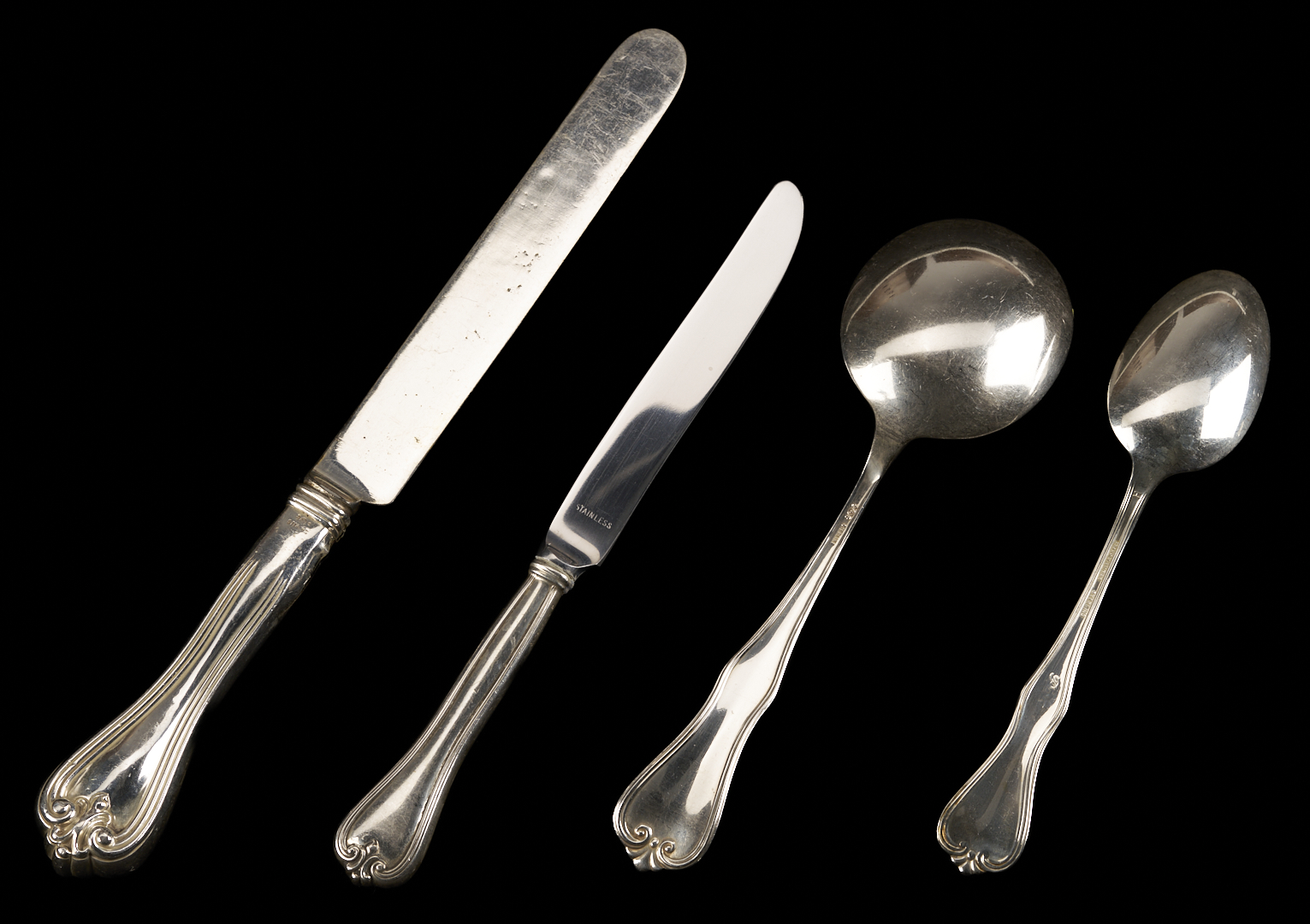 Some oxidation to knife blades and small dents/wear to knife handles. Otherwise very good condition. About half of the pieces have various monograms and differing Whiting marks.