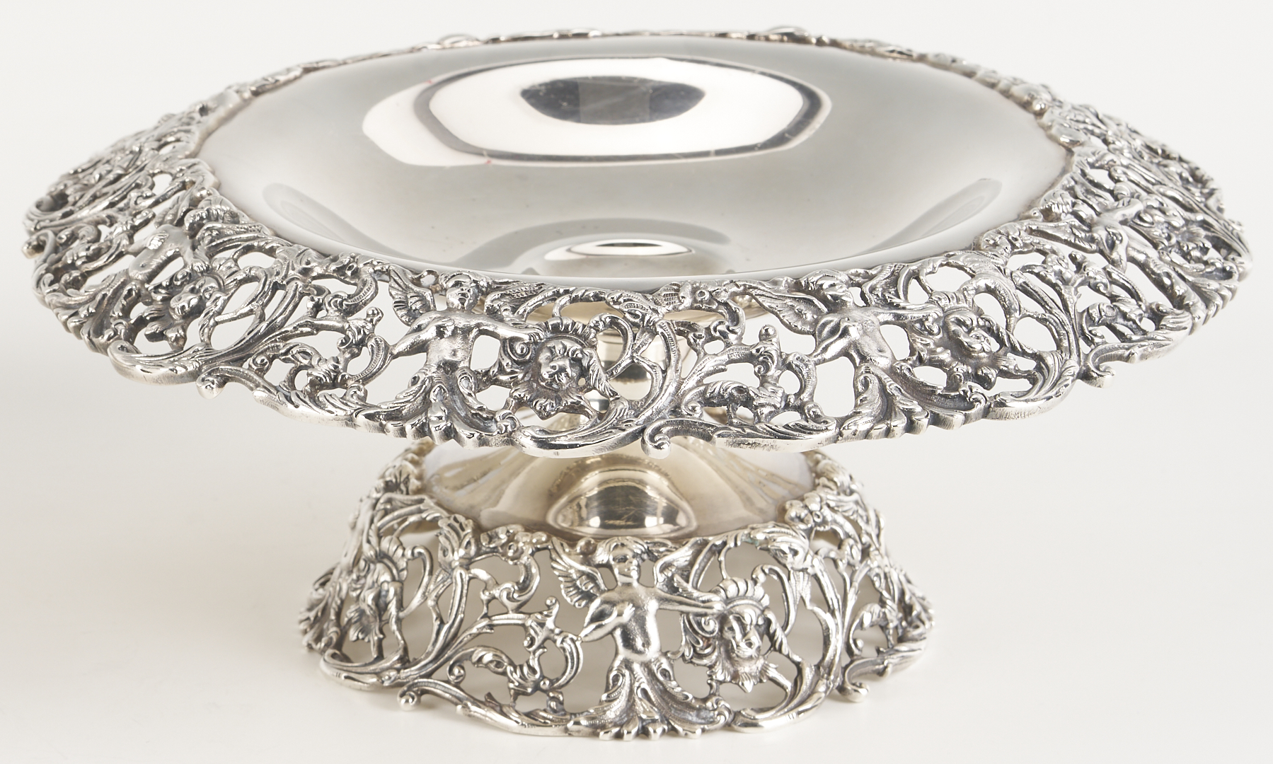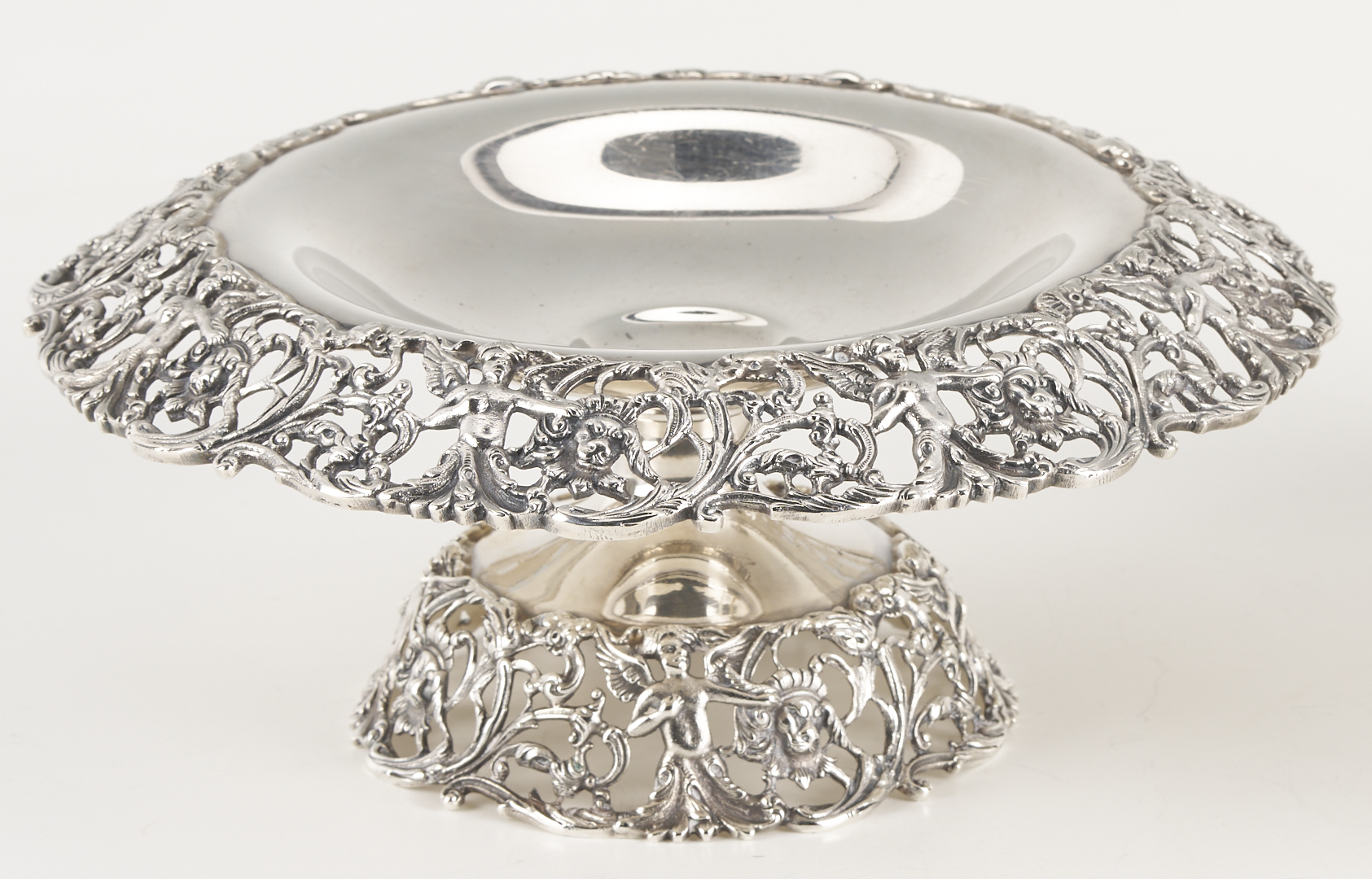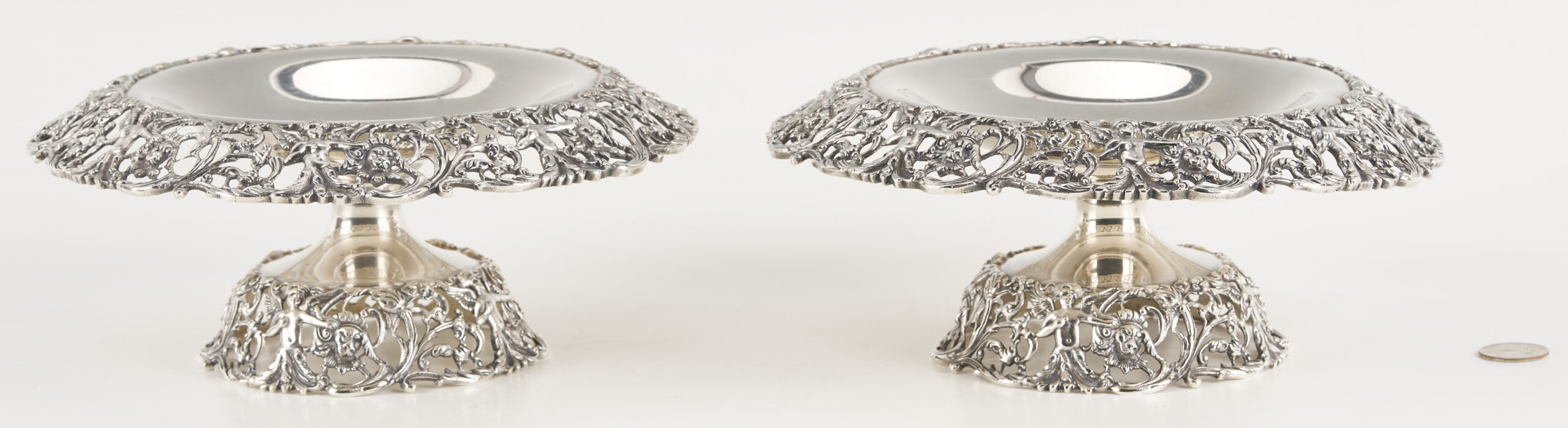 Pair of Durham Silver Company sterling silver tazzas with reticulated rims and bases with scrolling foliate, putti, and lion mask designs. Marked “Durham” on the base. 3 3/4 in. H x 9 1/4 in. dia. 50.1 total troy ounces.