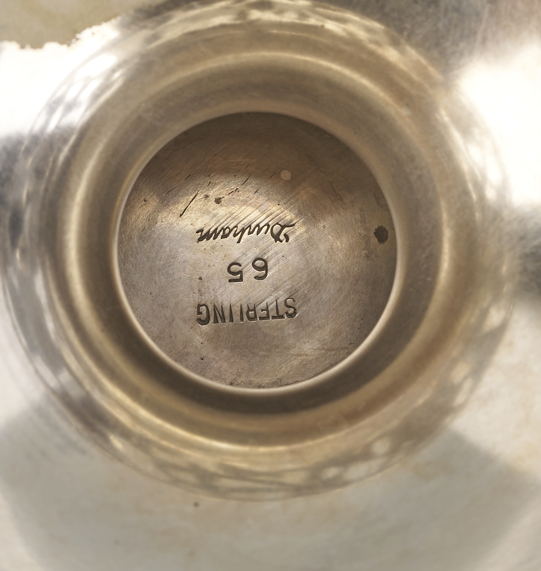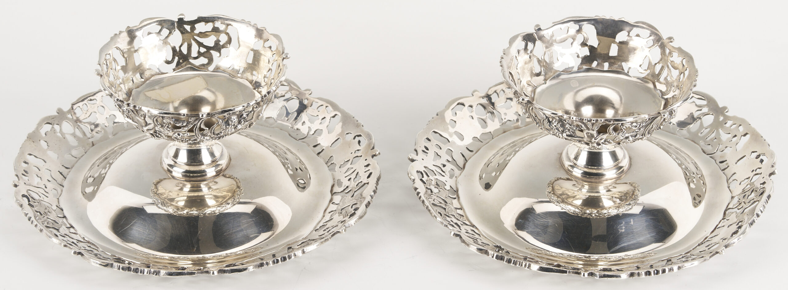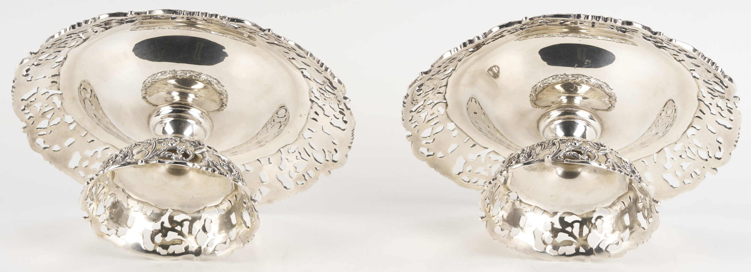 Pair of Durham Silver Company sterling silver tazzas with reticulated rims and bases with scrolling foliate, putti, and lion mask designs. Marked “Durham” on the base. 3 3/4 in. H x 9 1/4 in. dia. 50.1 total troy ounces.
