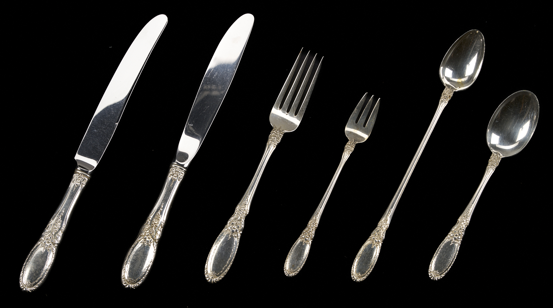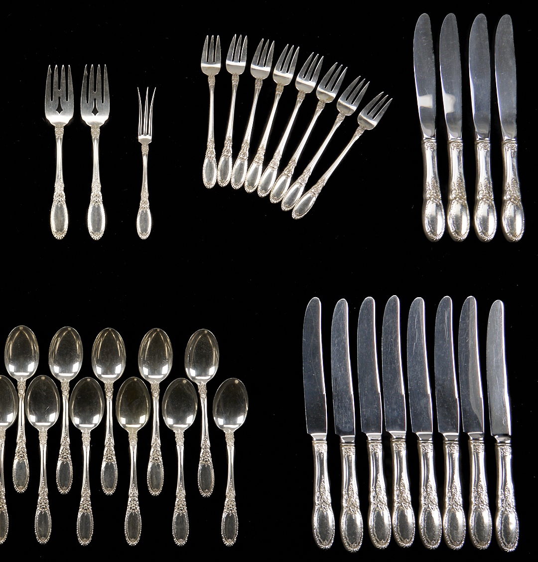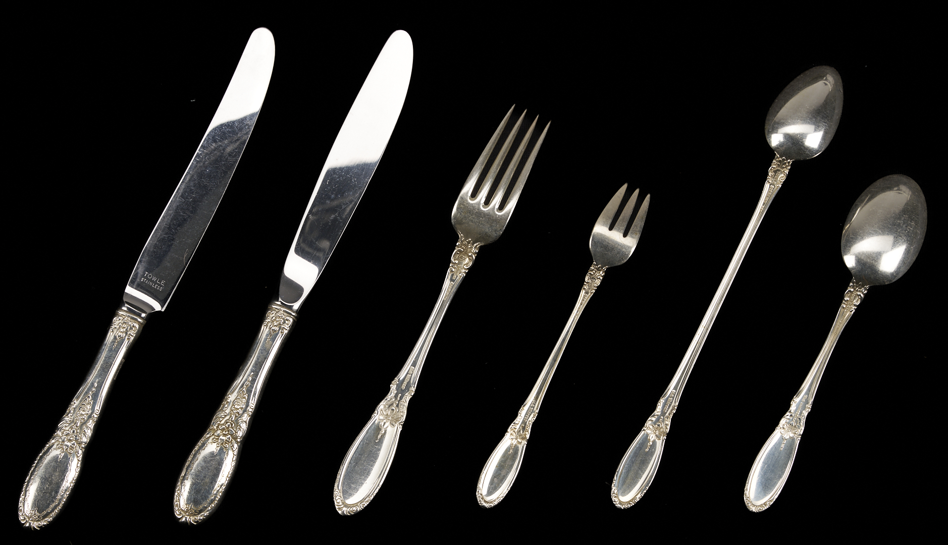 61 pcs Towle sterling silver flatware in the Old Mirror pattern, including 12 knives (8 7/8 in.), 12 forks (7 in.), 13 teaspoons, 2 salad/dessert forks, 8 cocktail/seafood forks, 8 iced tea spoons, 1 sugar spoon, 1 lemon fork, 1 gravy ladle, 1 butter spreader, 1 master butter knife, and 2 large table/serving spoons. Combined weighable sterling: 54.66 oz troy.