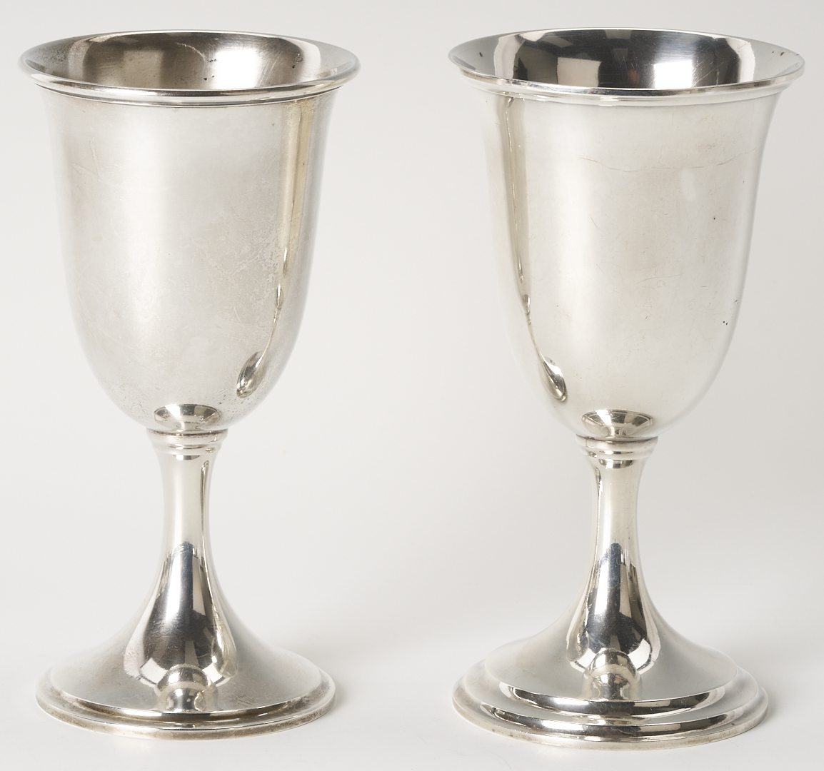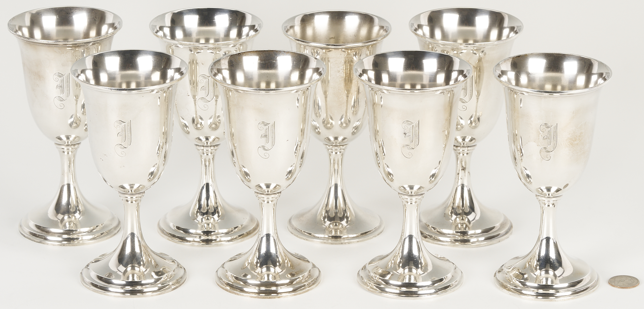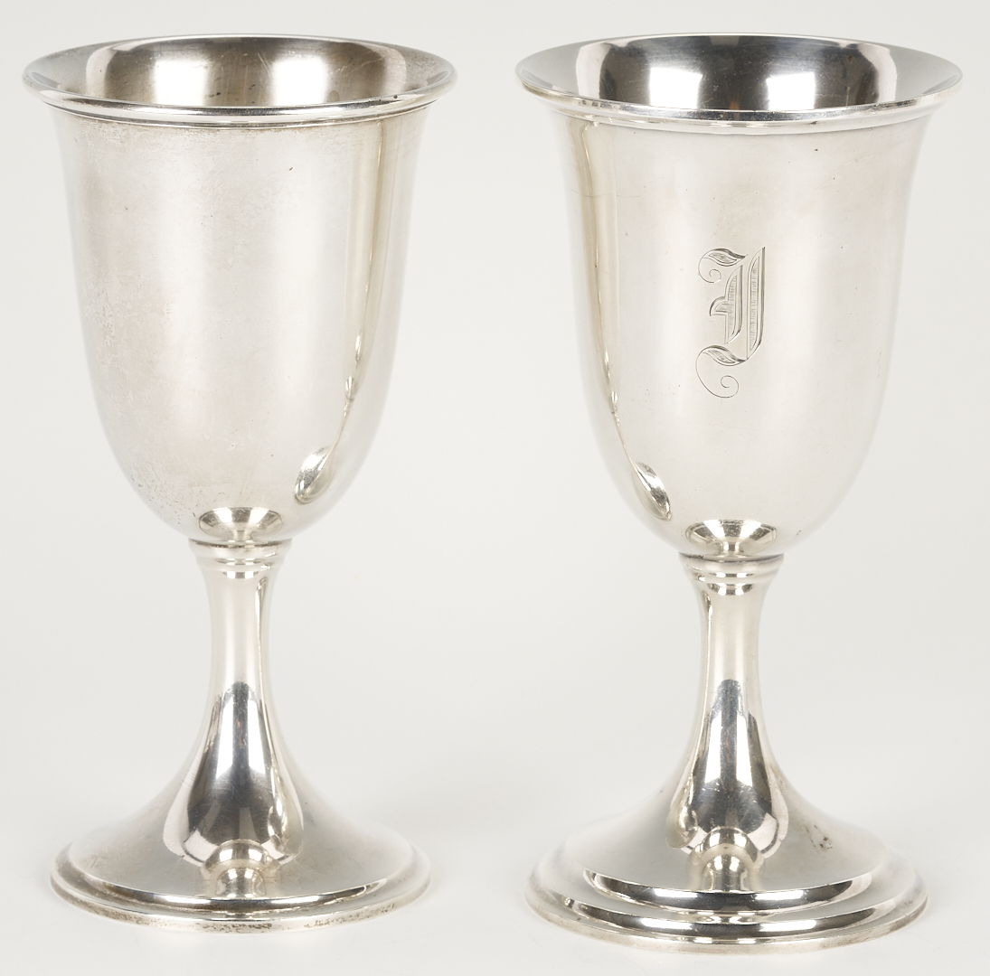 Set of eight (8) S. Kirk & Son and S. Kirk & Son, Inc. sterling silver goblets, including 1 S. Kirk & Son pattern #72 goblet and 7 S. Kirk & Son, Inc. pattern #4105 goblets. All with maker’s mark, sterling, and pattern number to the base. 6 5/8 in. H and 6 3/4 in. H. 44.22 total troy ounces.