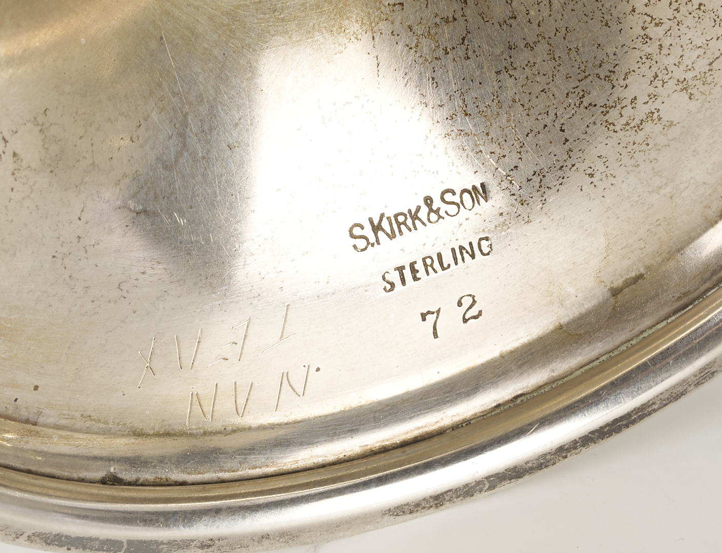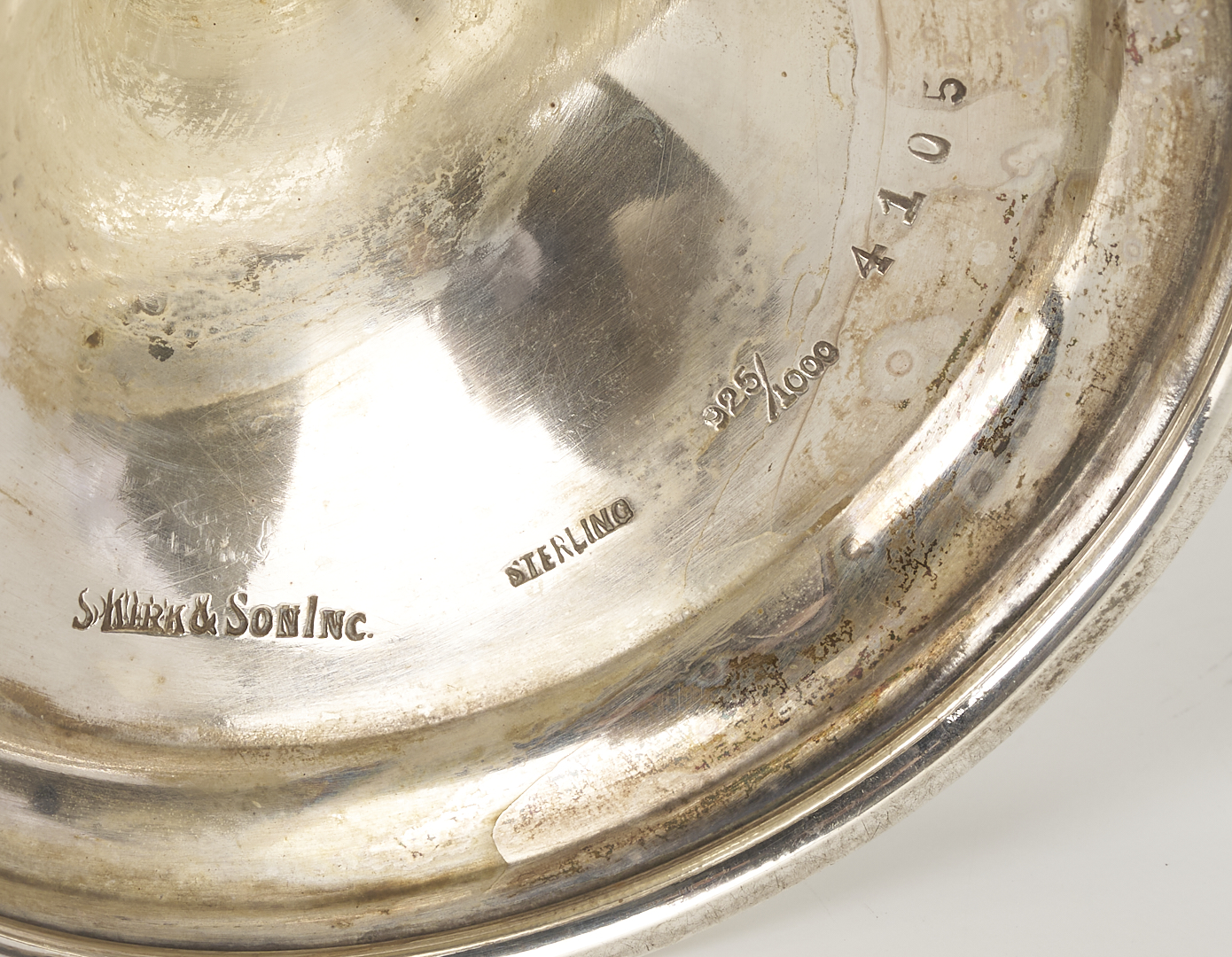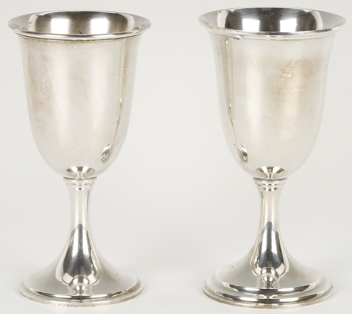Set of eight (8) S. Kirk & Son and S. Kirk & Son, Inc. sterling silver goblets, including 1 S. Kirk & Son pattern #72 goblet and 7 S. Kirk & Son, Inc. pattern #4105 goblets. All with maker’s mark, sterling, and pattern number to the base. 6 5/8 in. H and 6 3/4 in. H. 44.22 total troy ounces.
