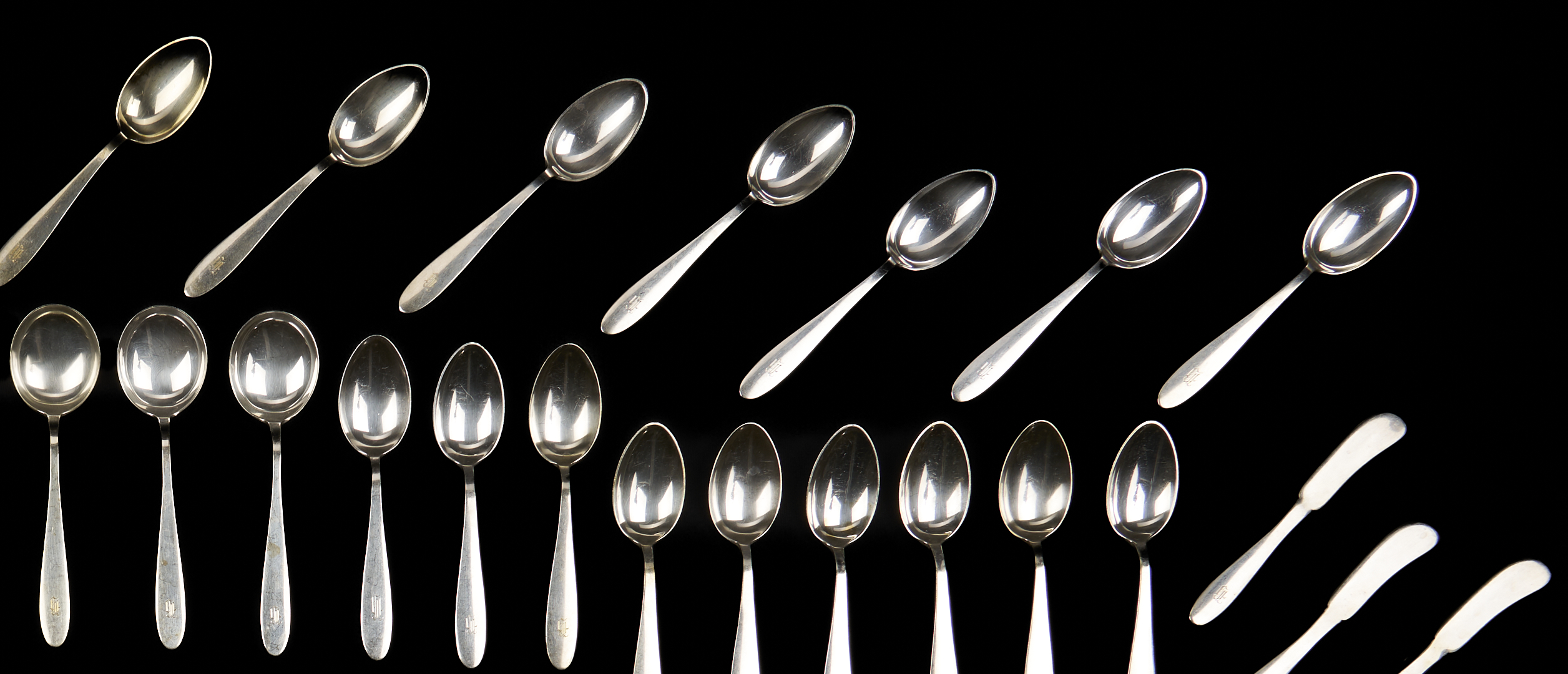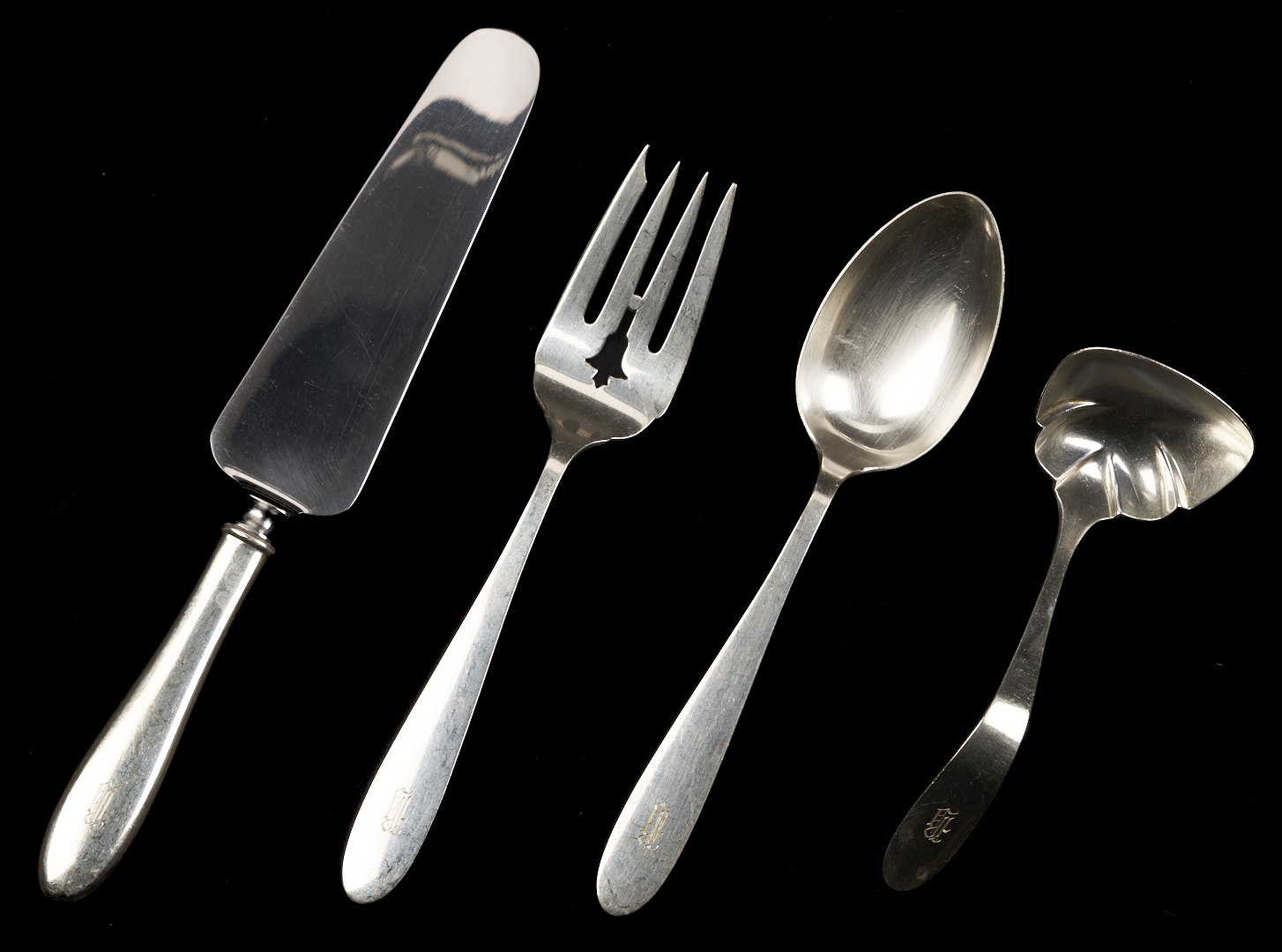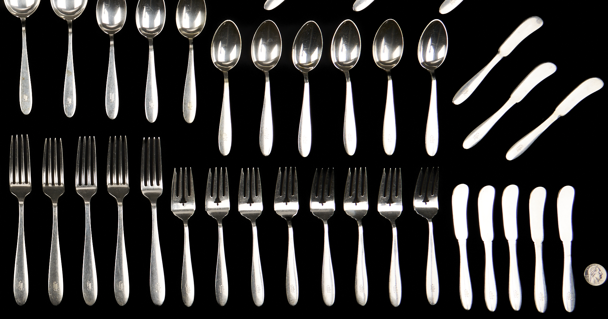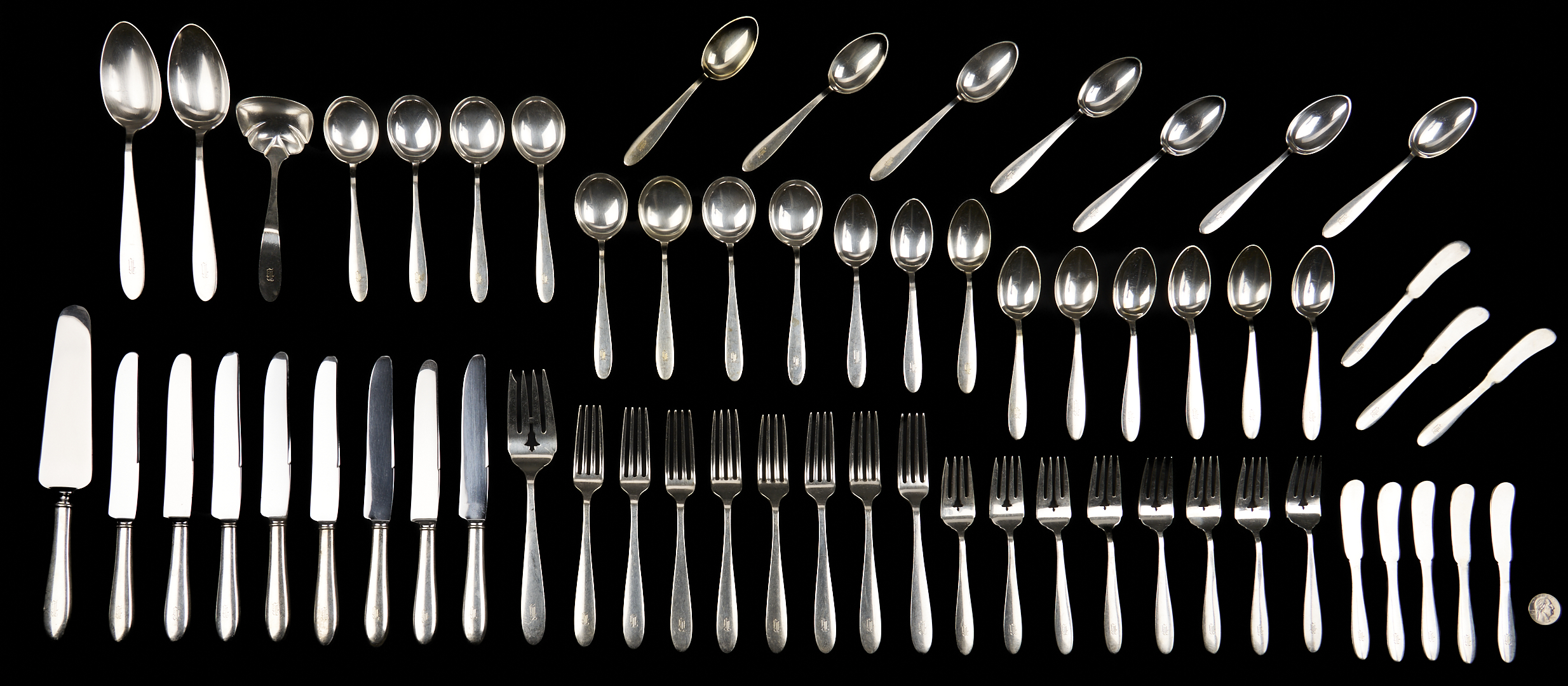 70 pieces Sterling silver flatware in the Pilgrim pattern by Manchester Silver Co.(pattern introduced 1932, discontinued), service for 8 including 8 knives (8 1/2 in.), 8 dinner forks (7 1/4 in.), 8 salad/dessert forks, 8 round bowl soup spoons, 8 flat handle butter spreaders, 16 teaspoons, 2 table serving spoons, 1 meat fork, 1 gravy ladle, and 1 pie or pastry server. All pieces monogrammed B or R. Combined weight: 54.94 oz troy.
