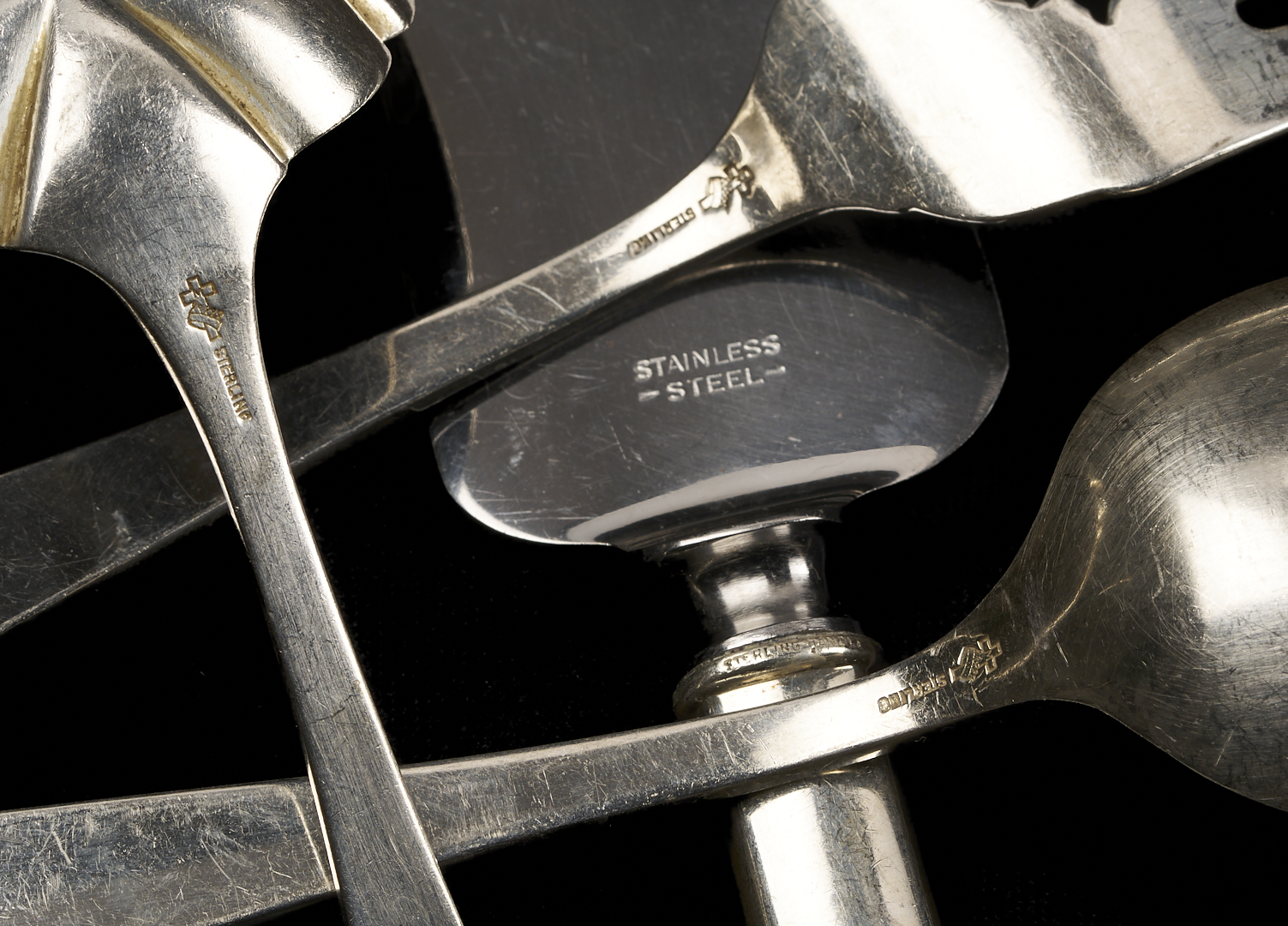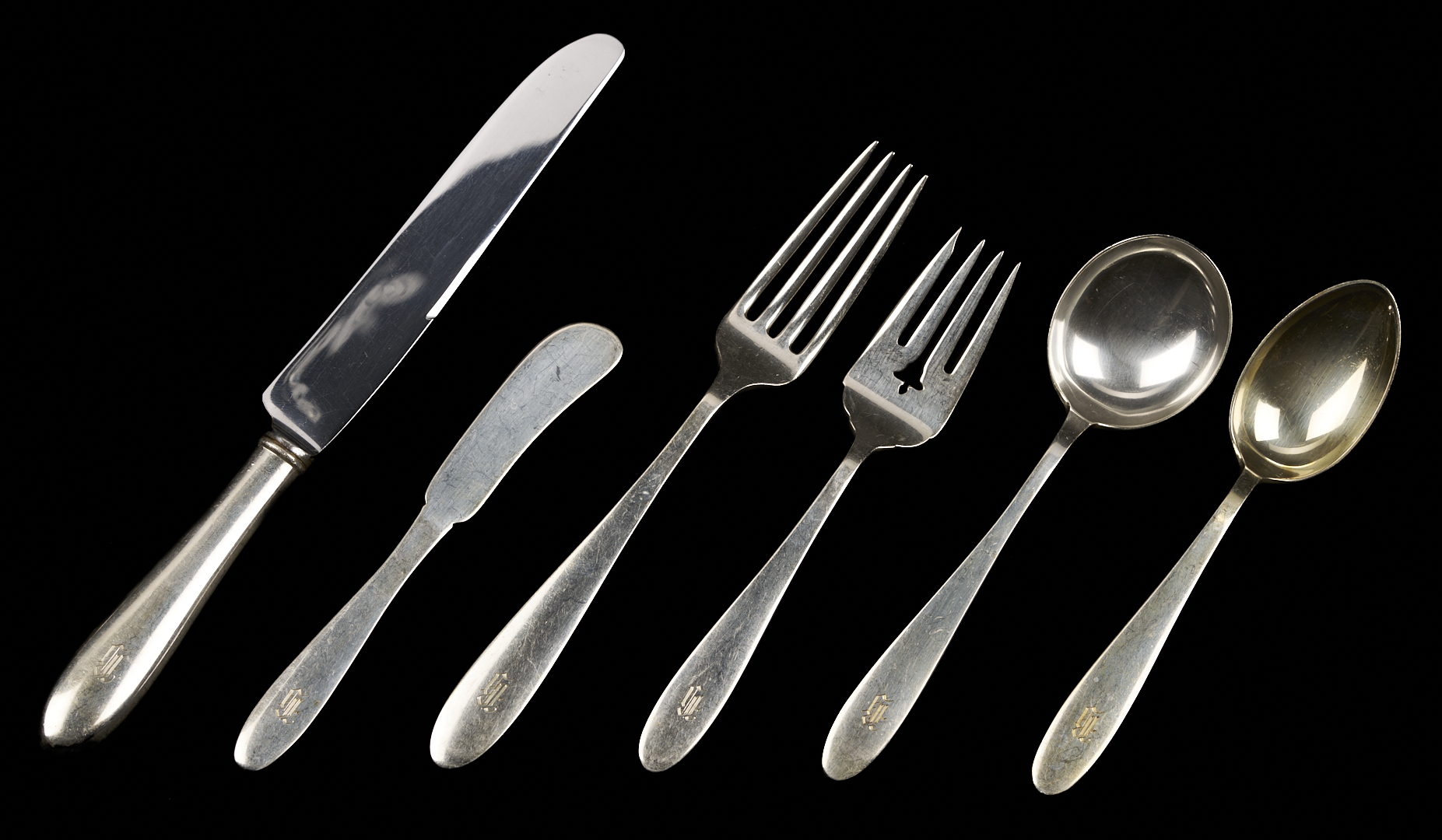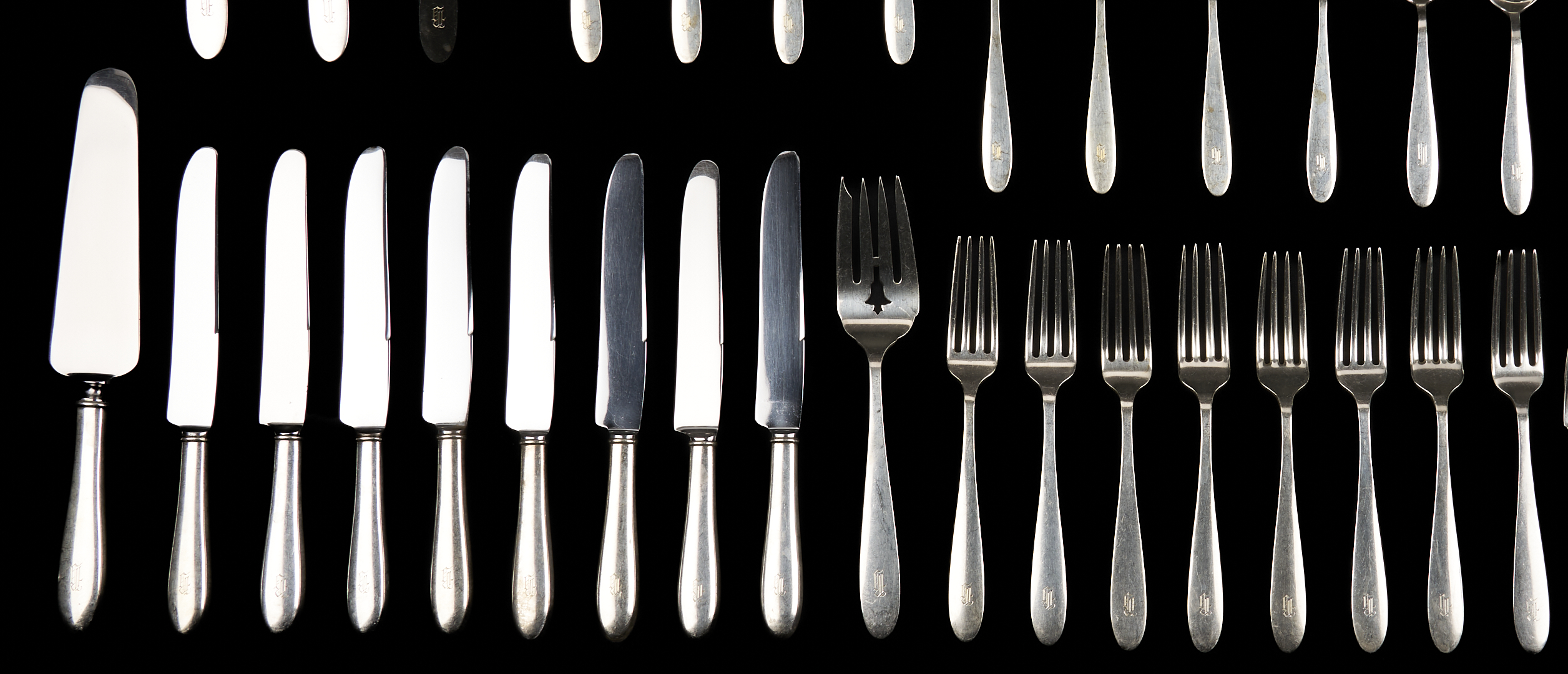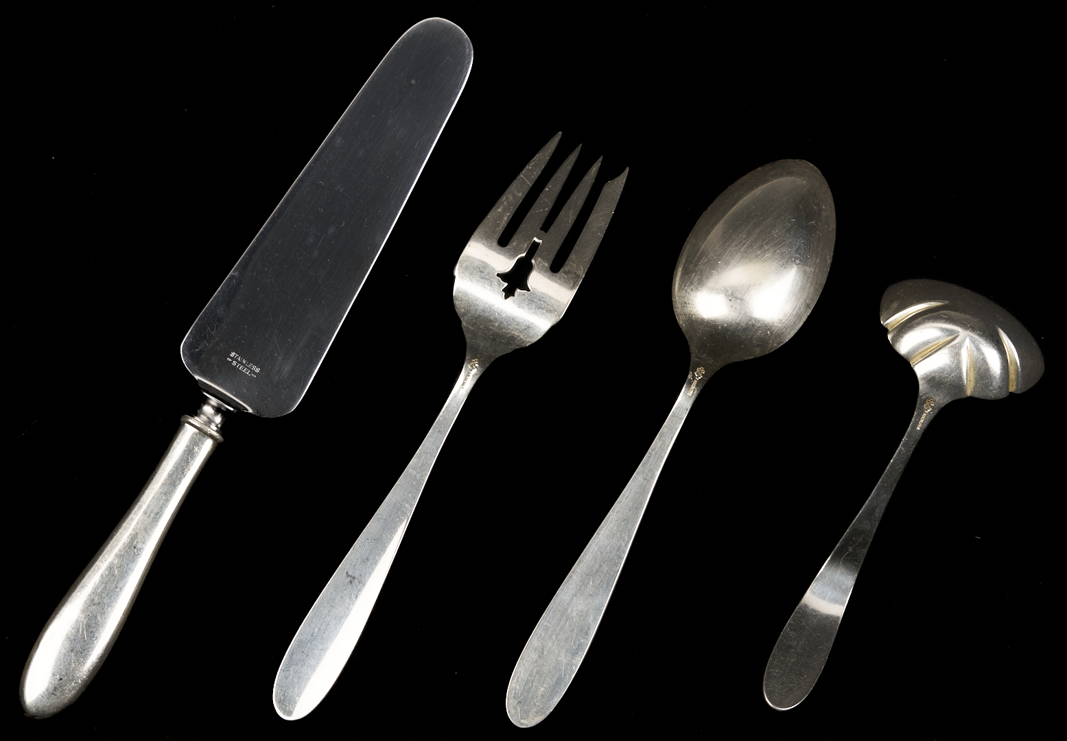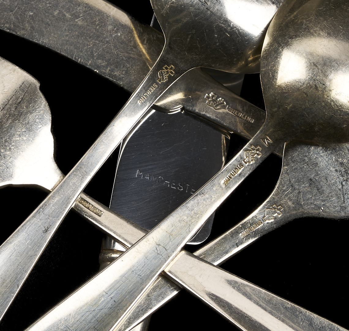 70 pieces Sterling silver flatware in the Pilgrim pattern by Manchester Silver Co.(pattern introduced 1932, discontinued), service for 8 including 8 knives (8 1/2 in.), 8 dinner forks (7 1/4 in.), 8 salad/dessert forks, 8 round bowl soup spoons, 8 flat handle butter spreaders, 16 teaspoons, 2 table serving spoons, 1 meat fork, 1 gravy ladle, and 1 pie or pastry server. All pieces monogrammed B or R. Combined weight: 54.94 oz troy.