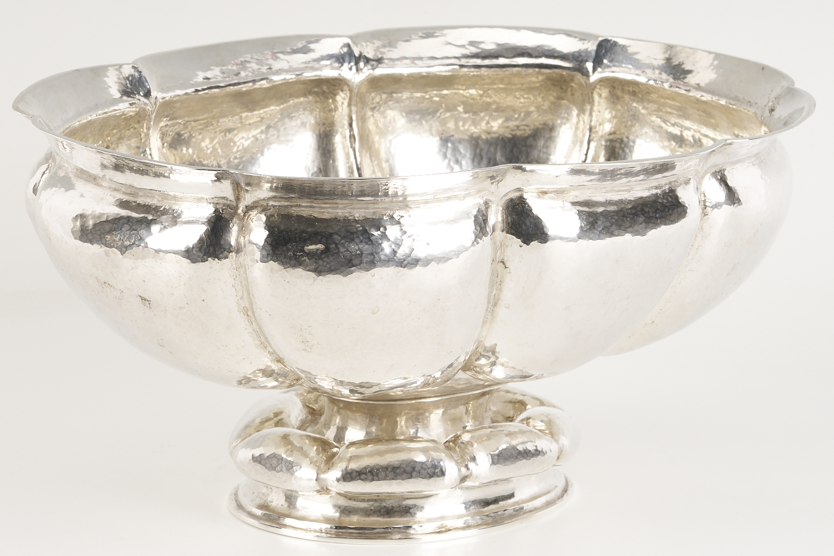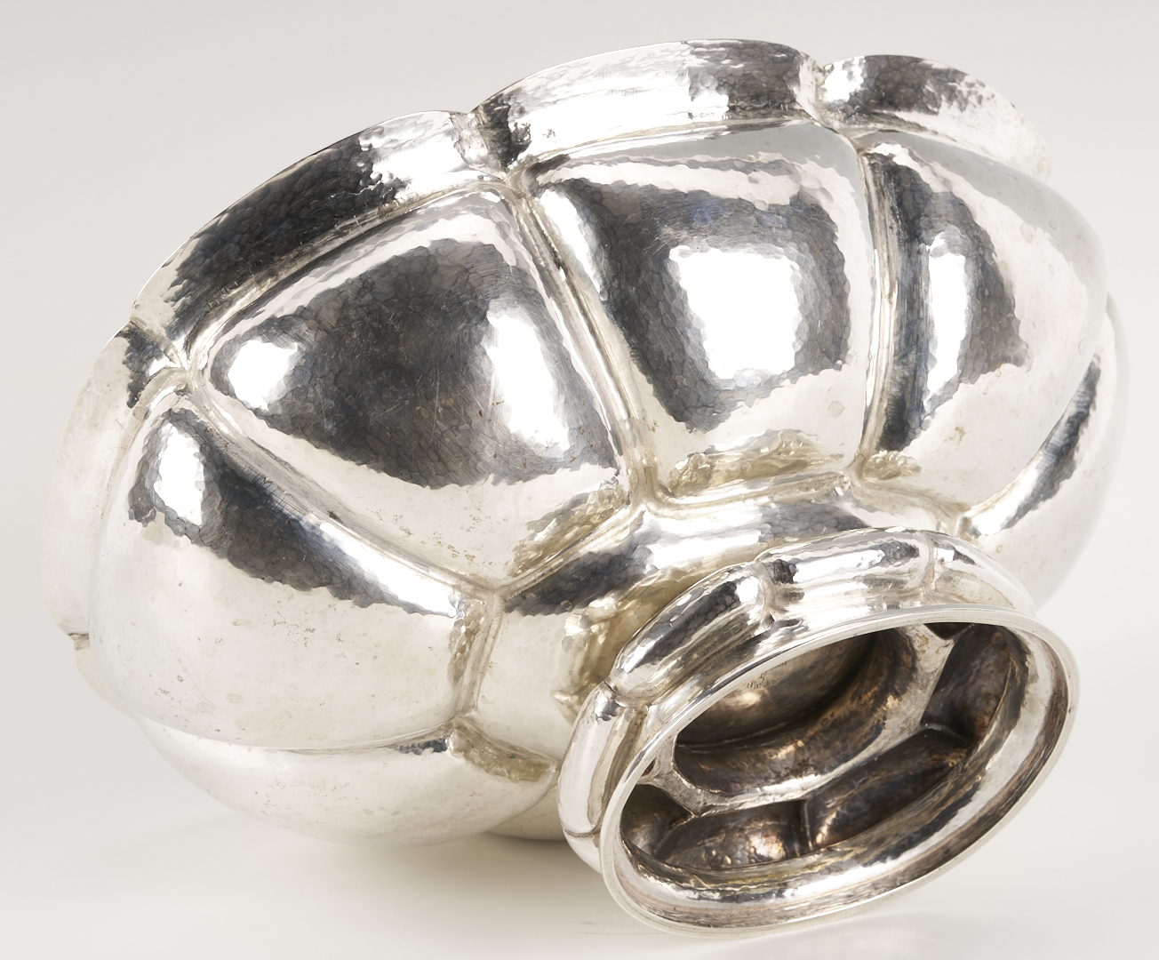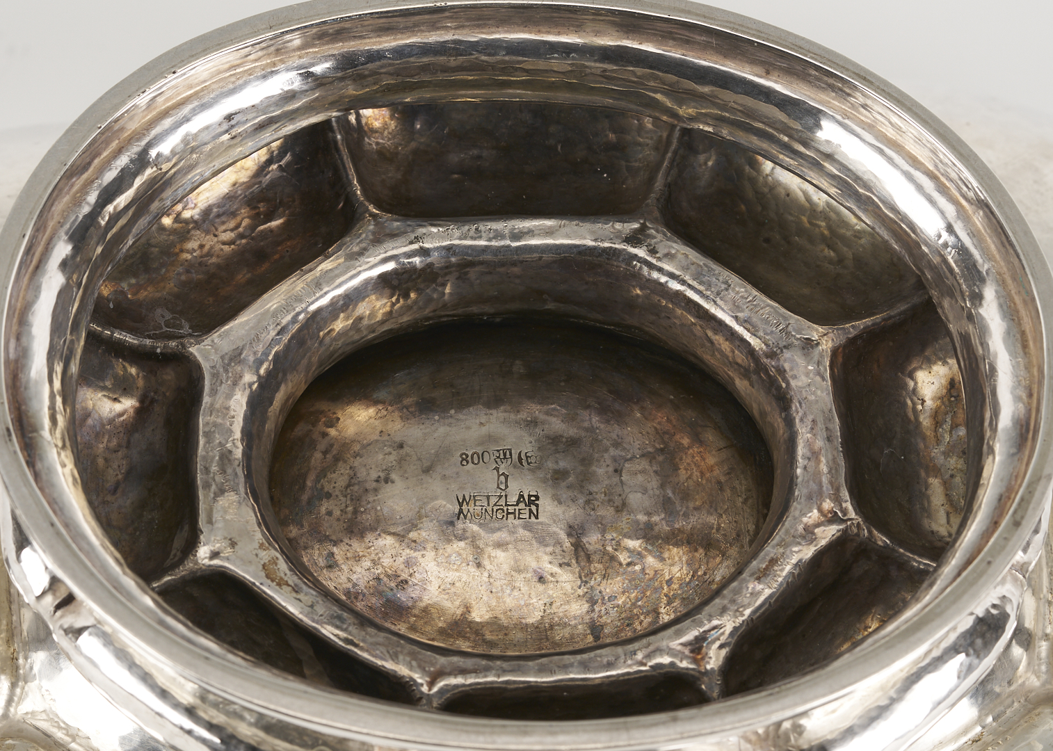 M.T. Wetzlar, Munich, .800 silver centerpiece bowl, Art Deco oval form with lobed and hand-hammered sides, raised on a conforming foot. Stamped with German fineness marks to underside. 12 3/4 in. W x 10 in. D x 6 in. H. 34.36 oz troy. Note: The Jewish Wetzlar family of Munich had a renowned silverware store and workshop, founded in 1875. Their work was based on their own as well as artists’ designs. As Hitler rose to power, the Wetzlars were forced to abandon their business in 1938 and flee to London, escaping the Holocaust but losing their livelihood. From that point, the brothers Friedrich and Leonhard Kleemann carried on the shop and the workshop into the post-war era. Source: Florian Dering, “M.T. Wetzlar: Silversmithery in Munich,” Arnoldsche Verlagsanstalt, 2014.