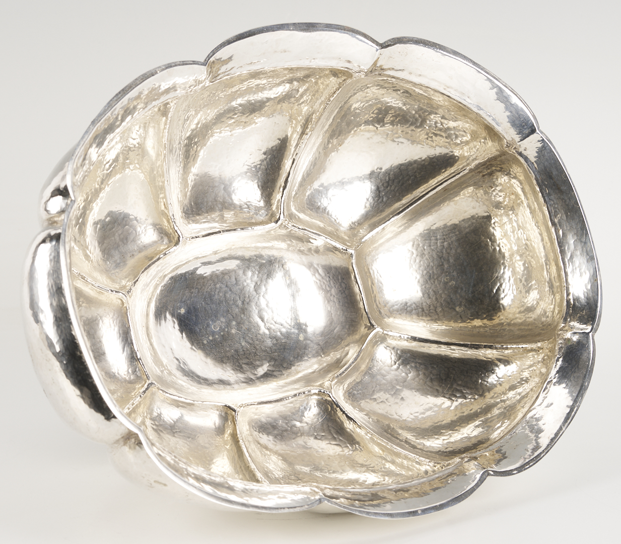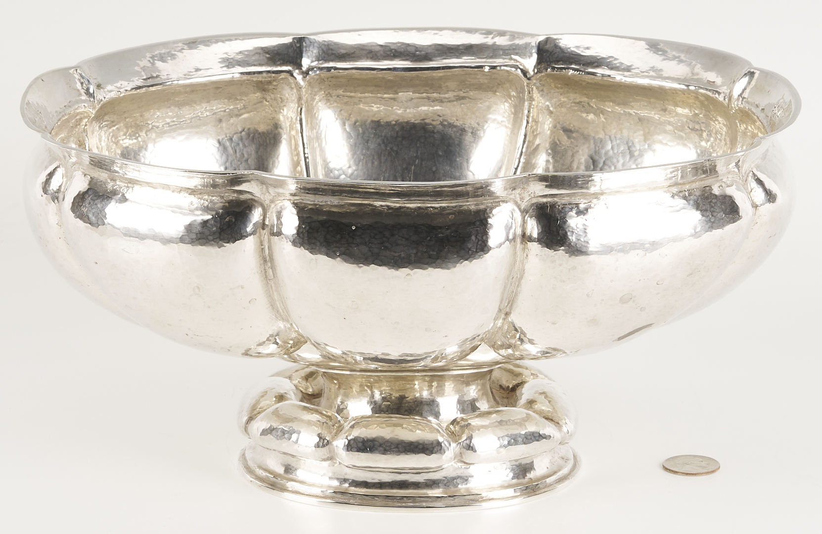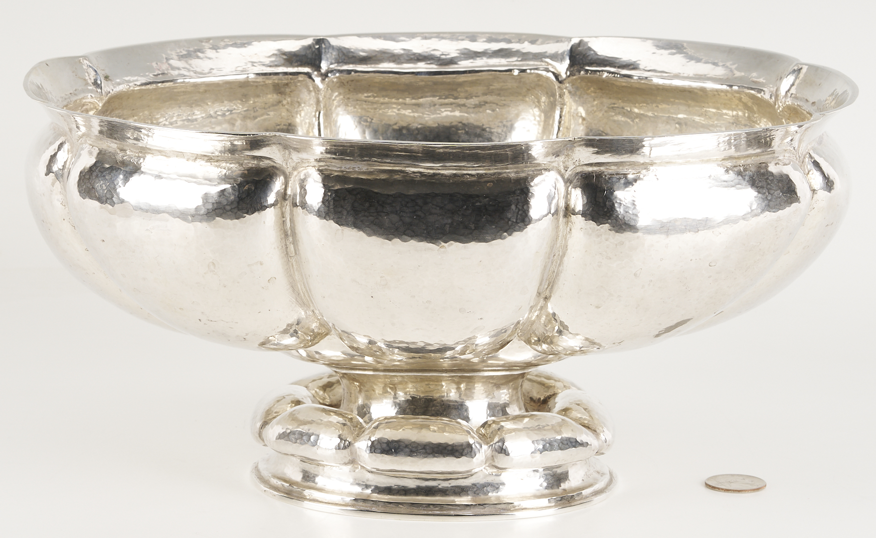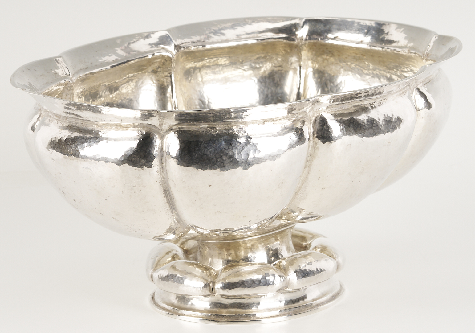 M.T. Wetzlar, Munich, .800 silver centerpiece bowl, Art Deco oval form with lobed and hand-hammered sides, raised on a conforming foot. Stamped with German fineness marks to underside. 12 3/4 in. W x 10 in. D x 6 in. H. 34.36 oz troy. Note: The Jewish Wetzlar family of Munich had a renowned silverware store and workshop, founded in 1875. Their work was based on their own as well as artists’ designs. As Hitler rose to power, the Wetzlars were forced to abandon their business in 1938 and flee to London, escaping the Holocaust but losing their livelihood. From that point, the brothers Friedrich and Leonhard Kleemann carried on the shop and the workshop into the post-war era. Source: Florian Dering, “M.T. Wetzlar: Silversmithery in Munich,” Arnoldsche Verlagsanstalt, 2014.