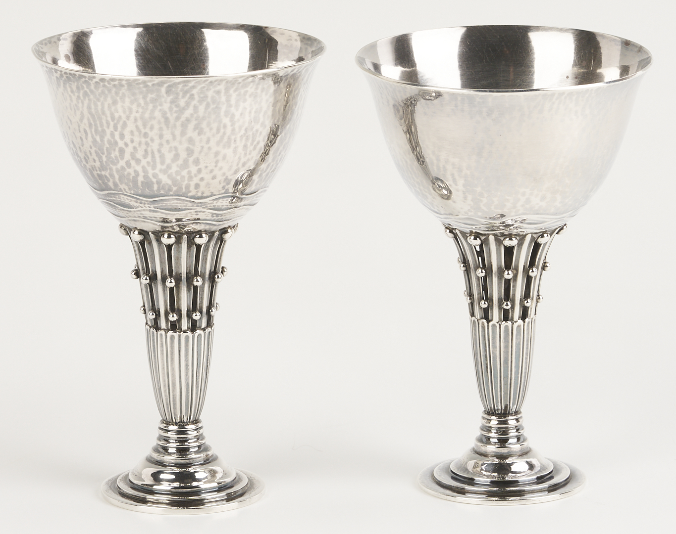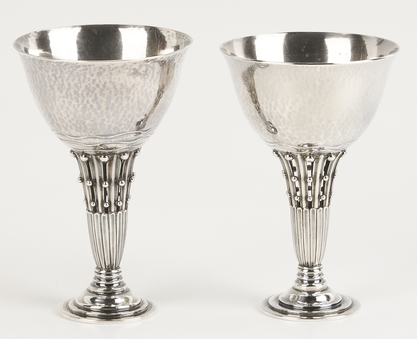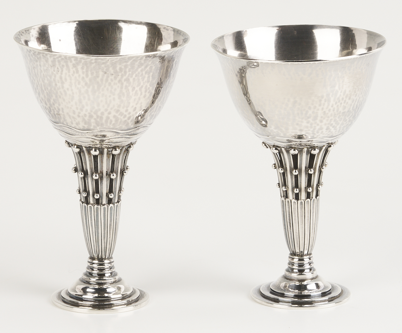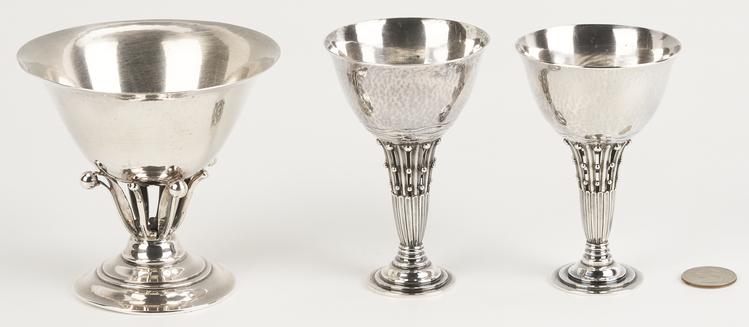 Two (2) Georg Jensen sterling silver goblets and one (1) compote after designs by Johan Rohde, featuring openwork stems with beaded tendrils and circular stepped feet. 1st and 2nd items: Pair of Georg Jensen sterling silver goblets with hammered bowls, #309B, 4 in. H, one with Johan Rohde and Jensen marks and monogram to underside of foot “John Price Jones August 12, 1935”; the other goblet with only the Georg Jensen mark used 1933-1944. 3rd item: Georg Jensen sterling silver small compote or tazza, #17A, 4 in. H x 4 1/2 in. diam. Circa 1950. Combined weight: 11.73 oz troy.