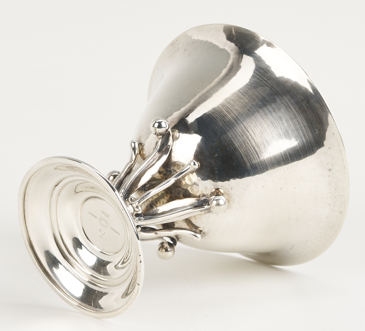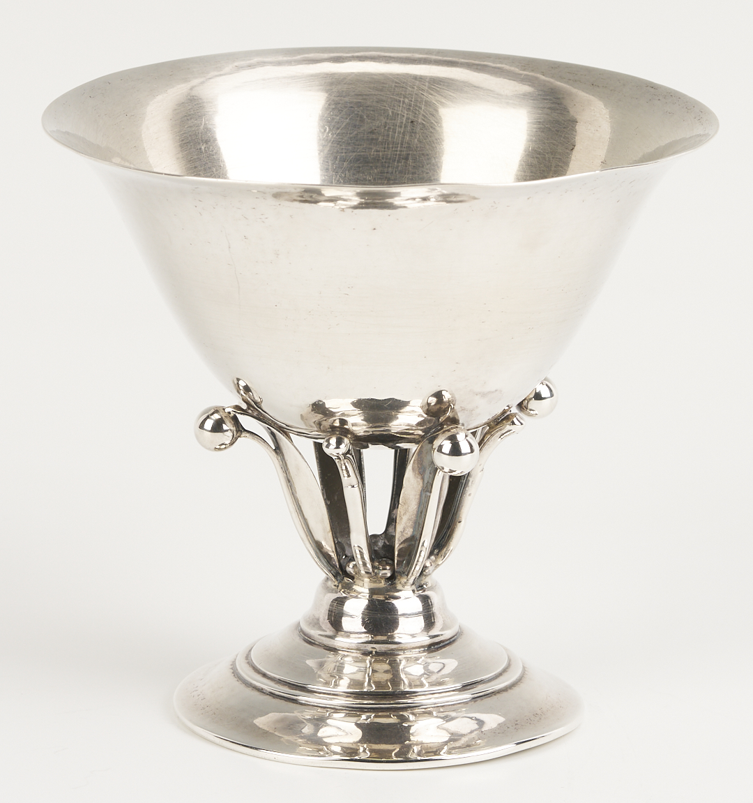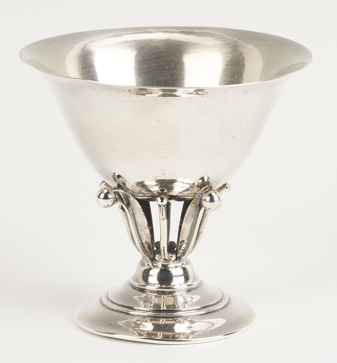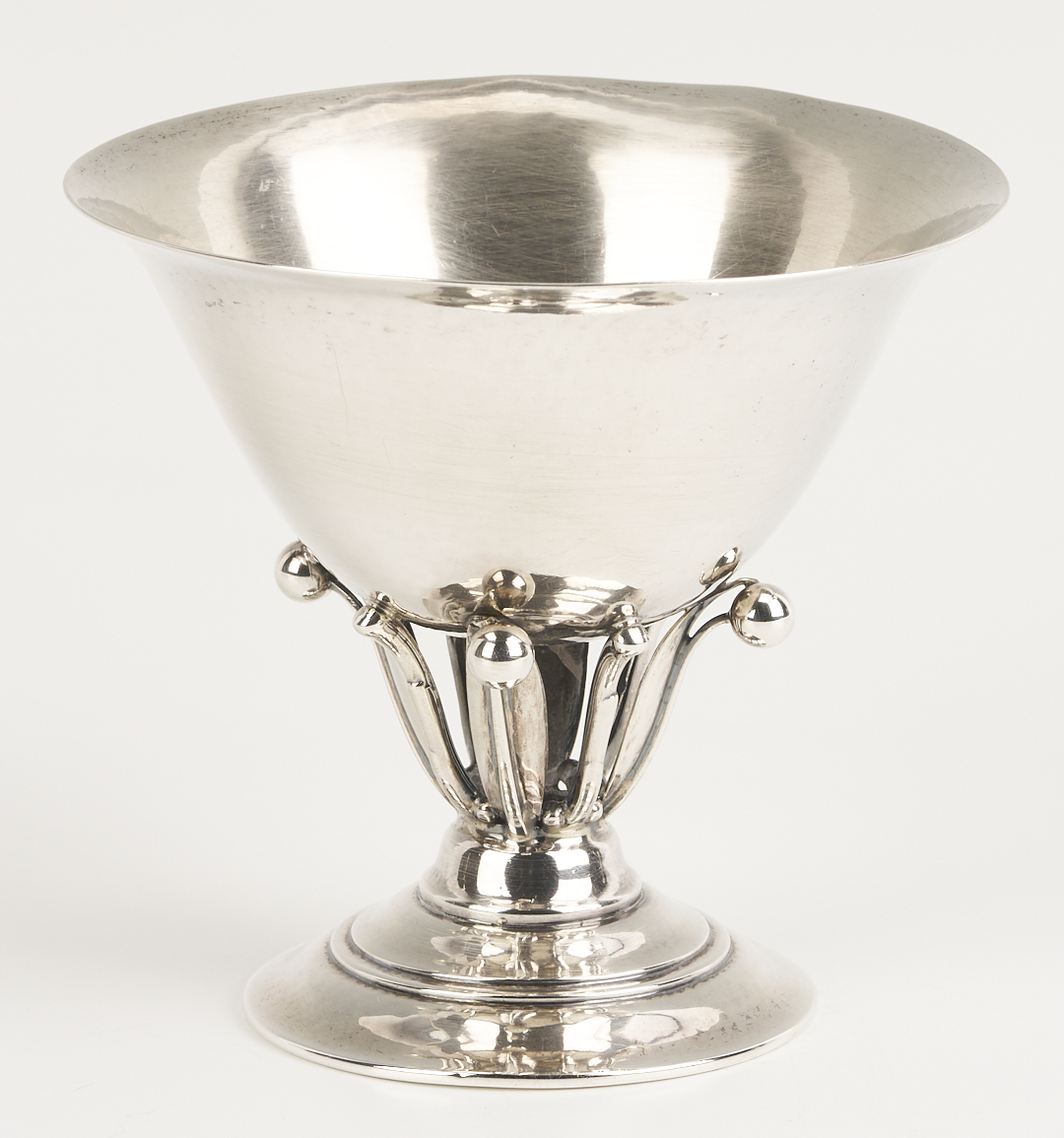 Two (2) Georg Jensen sterling silver goblets and one (1) compote after designs by Johan Rohde, featuring openwork stems with beaded tendrils and circular stepped feet. 1st and 2nd items: Pair of Georg Jensen sterling silver goblets with hammered bowls, #309B, 4 in. H, one with Johan Rohde and Jensen marks and monogram to underside of foot “John Price Jones August 12, 1935”; the other goblet with only the Georg Jensen mark used 1933-1944. 3rd item: Georg Jensen sterling silver small compote or tazza, #17A, 4 in. H x 4 1/2 in. diam. Circa 1950. Combined weight: 11.73 oz troy.