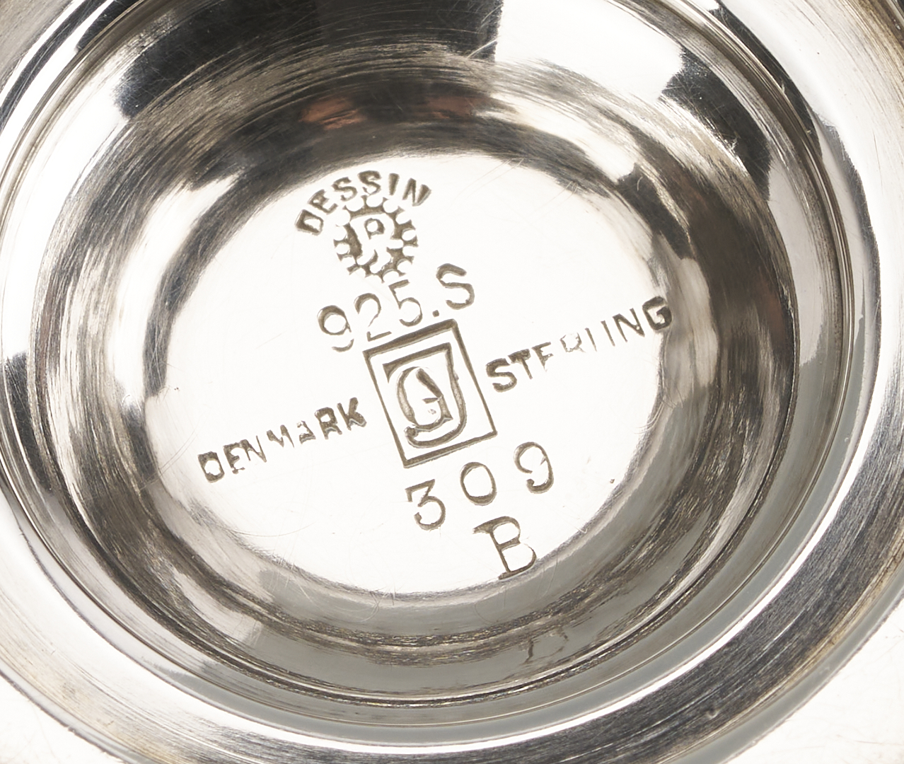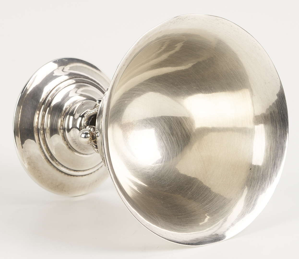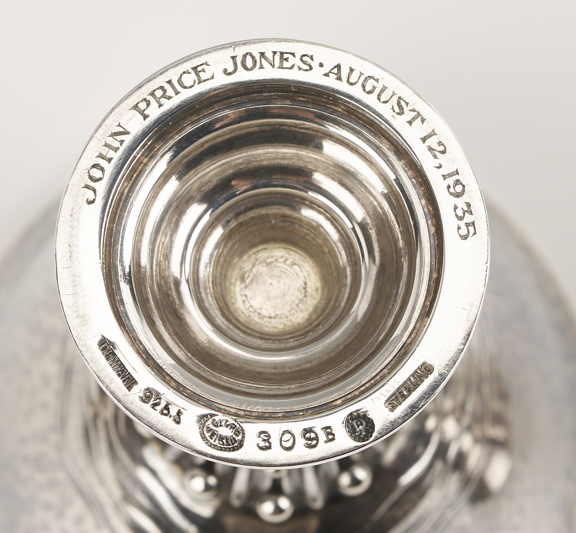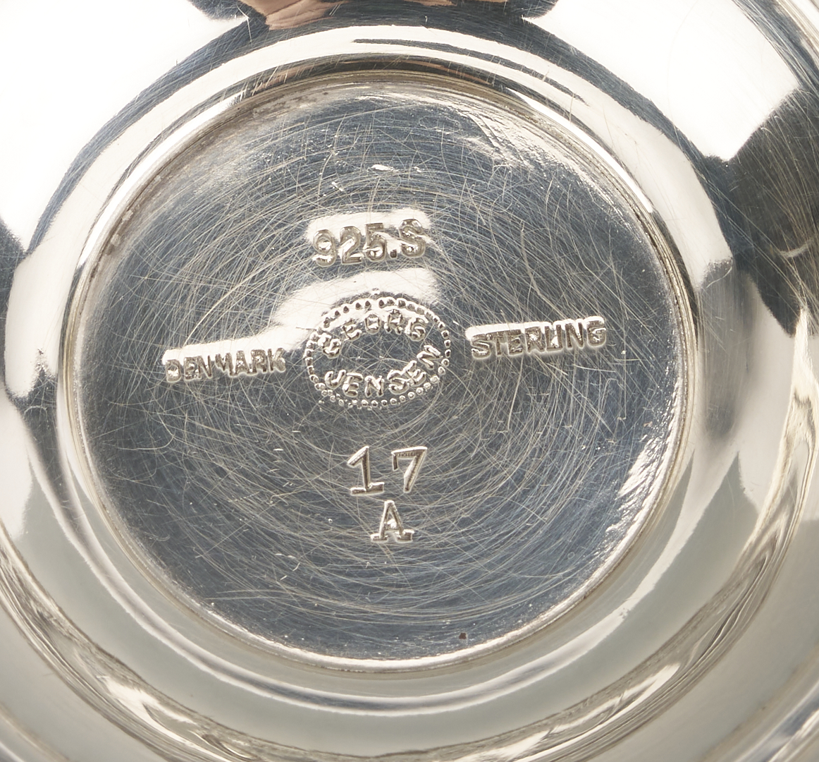 Two (2) Georg Jensen sterling silver goblets and one (1) compote after designs by Johan Rohde, featuring openwork stems with beaded tendrils and circular stepped feet. 1st and 2nd items: Pair of Georg Jensen sterling silver goblets with hammered bowls, #309B, 4 in. H, one with Johan Rohde and Jensen marks and monogram to underside of foot “John Price Jones August 12, 1935”; the other goblet with only the Georg Jensen mark used 1933-1944. 3rd item: Georg Jensen sterling silver small compote or tazza, #17A, 4 in. H x 4 1/2 in. diam. Circa 1950. Combined weight: 11.73 oz troy.