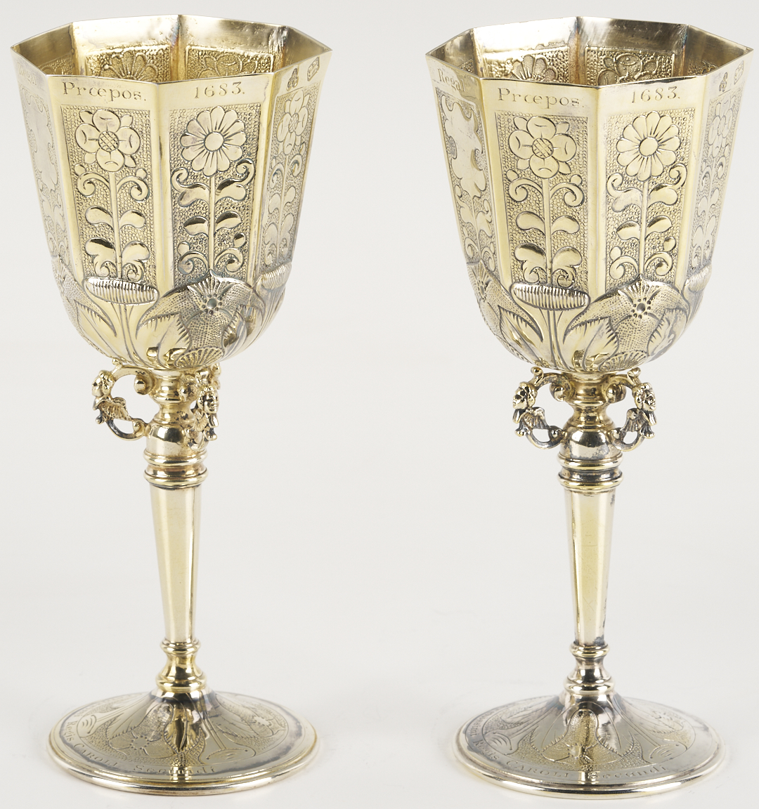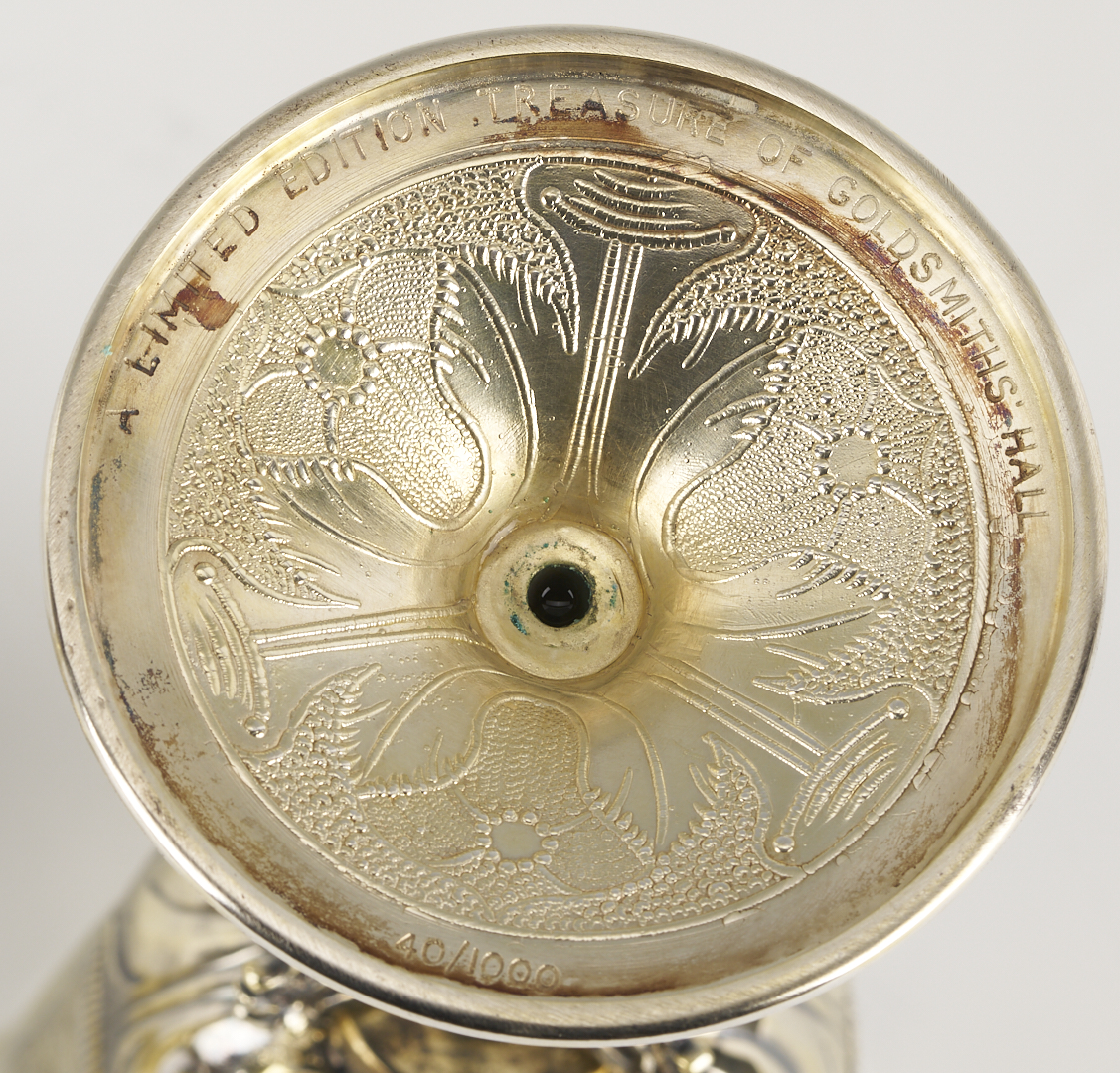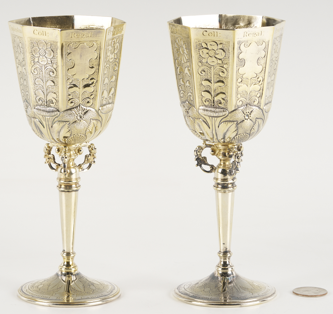 A pair of two (2) English sterling silver wine goblets, replicas of the vermeil original known as the Grace Cup, made in 1683 for Johannes Copleston. (Copleston was provost of King’s College, Cambridge and Vice Chancellor of the University). These 20th-century copies are hallmarked for Wakely and Wheeler, London, 1972, additionally marked on the bottom: “A Limited Edition Treasure of Goldsmiths Hall,” and numbered 40/1000 and 51/1000. 7 1/2 in. H. 14.69 oz troy. Note: Another edition of these replica cups was made in 1981 for Harrod’s of London, as souvenirs of the Royal Wedding of Prince Charles and Lady Diana, however, those examples were silverplated.