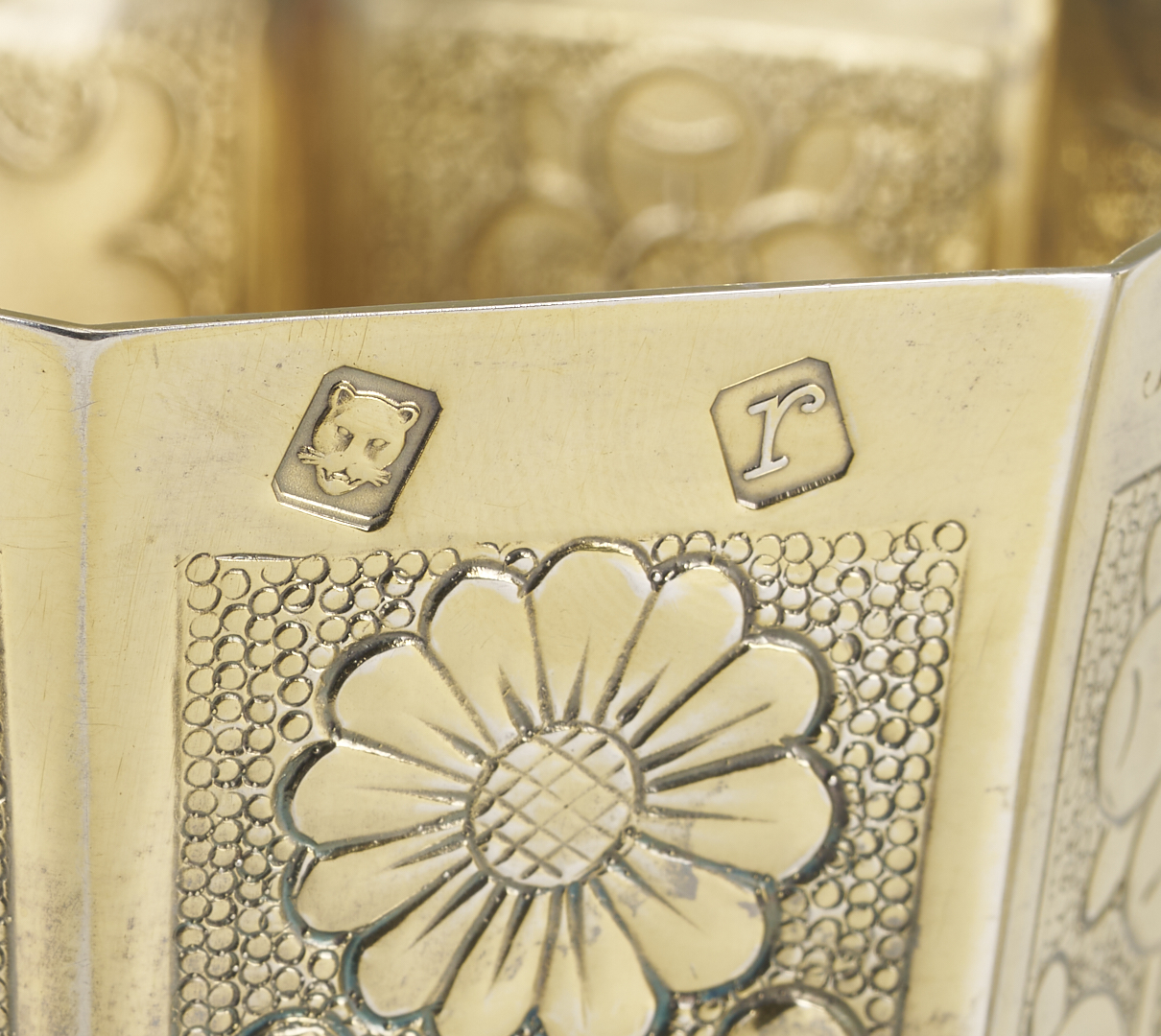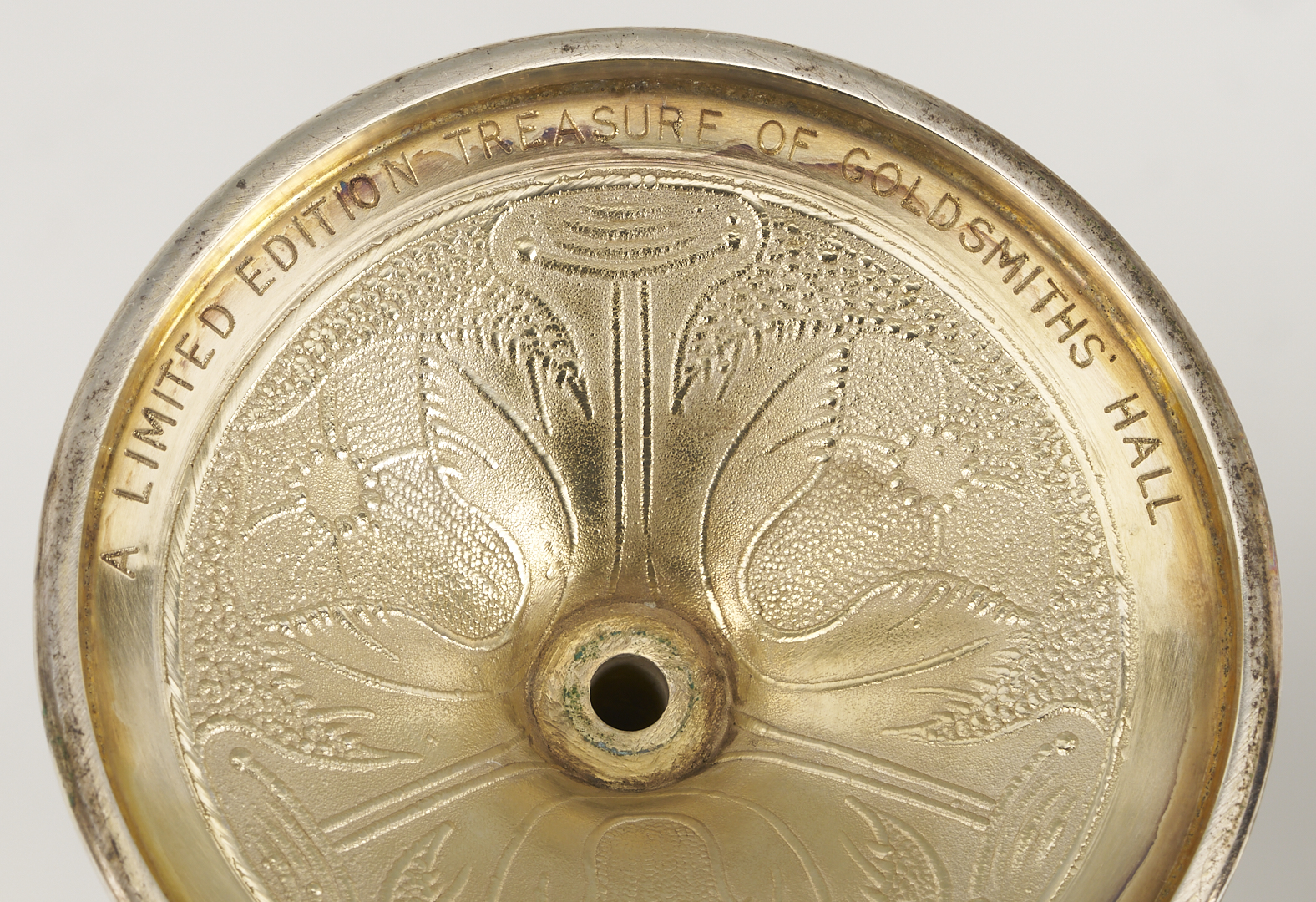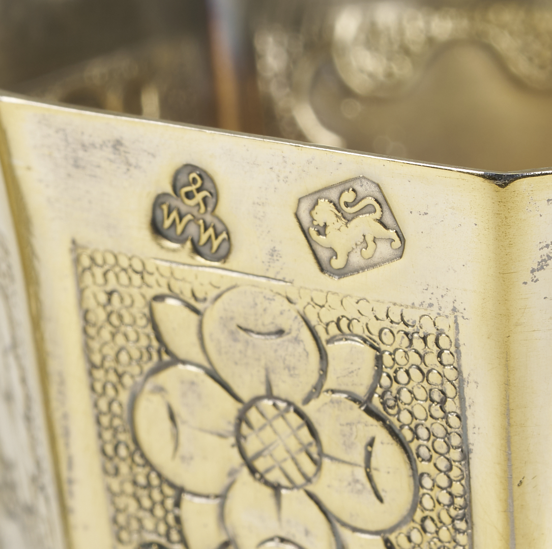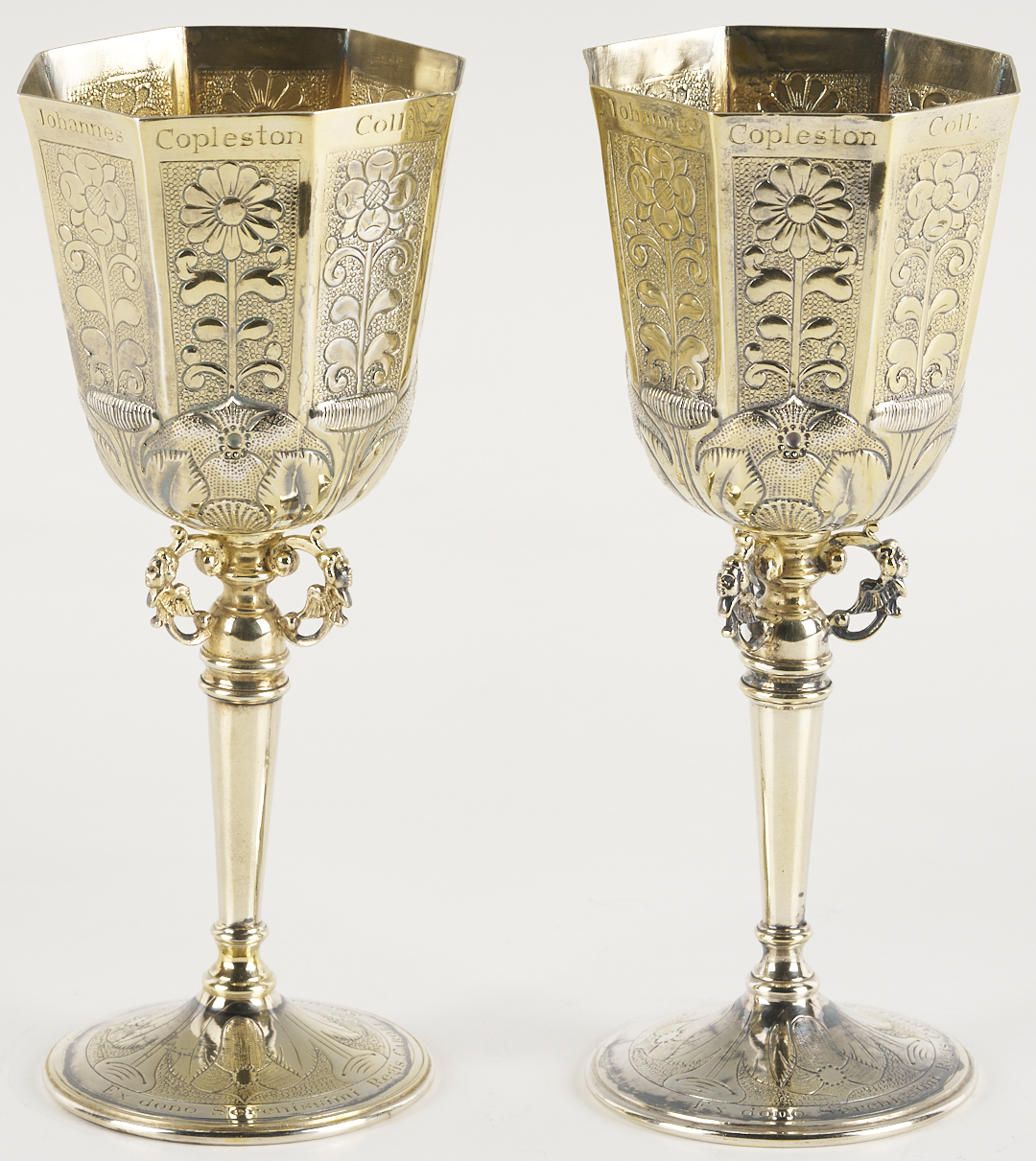 A pair of two (2) English sterling silver wine goblets, replicas of the vermeil original known as the Grace Cup, made in 1683 for Johannes Copleston. (Copleston was provost of King’s College, Cambridge and Vice Chancellor of the University). These 20th-century copies are hallmarked for Wakely and Wheeler, London, 1972, additionally marked on the bottom: “A Limited Edition Treasure of Goldsmiths Hall,” and numbered 40/1000 and 51/1000. 7 1/2 in. H. 14.69 oz troy. Note: Another edition of these replica cups was made in 1981 for Harrod’s of London, as souvenirs of the Royal Wedding of Prince Charles and Lady Diana, however, those examples were silverplated.
