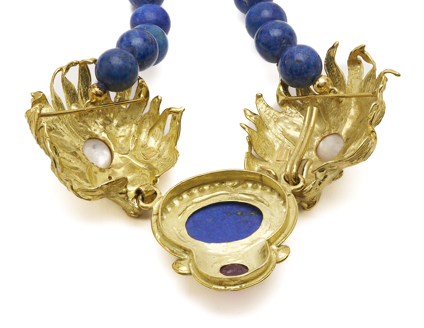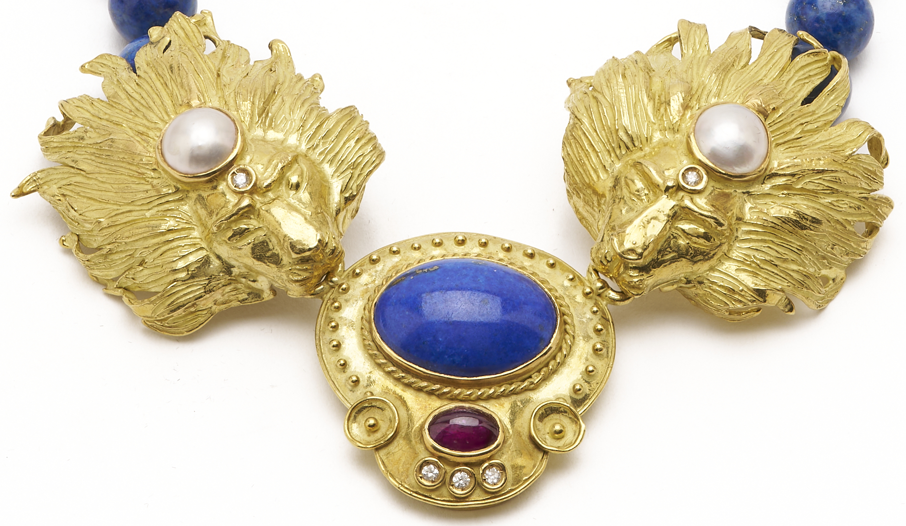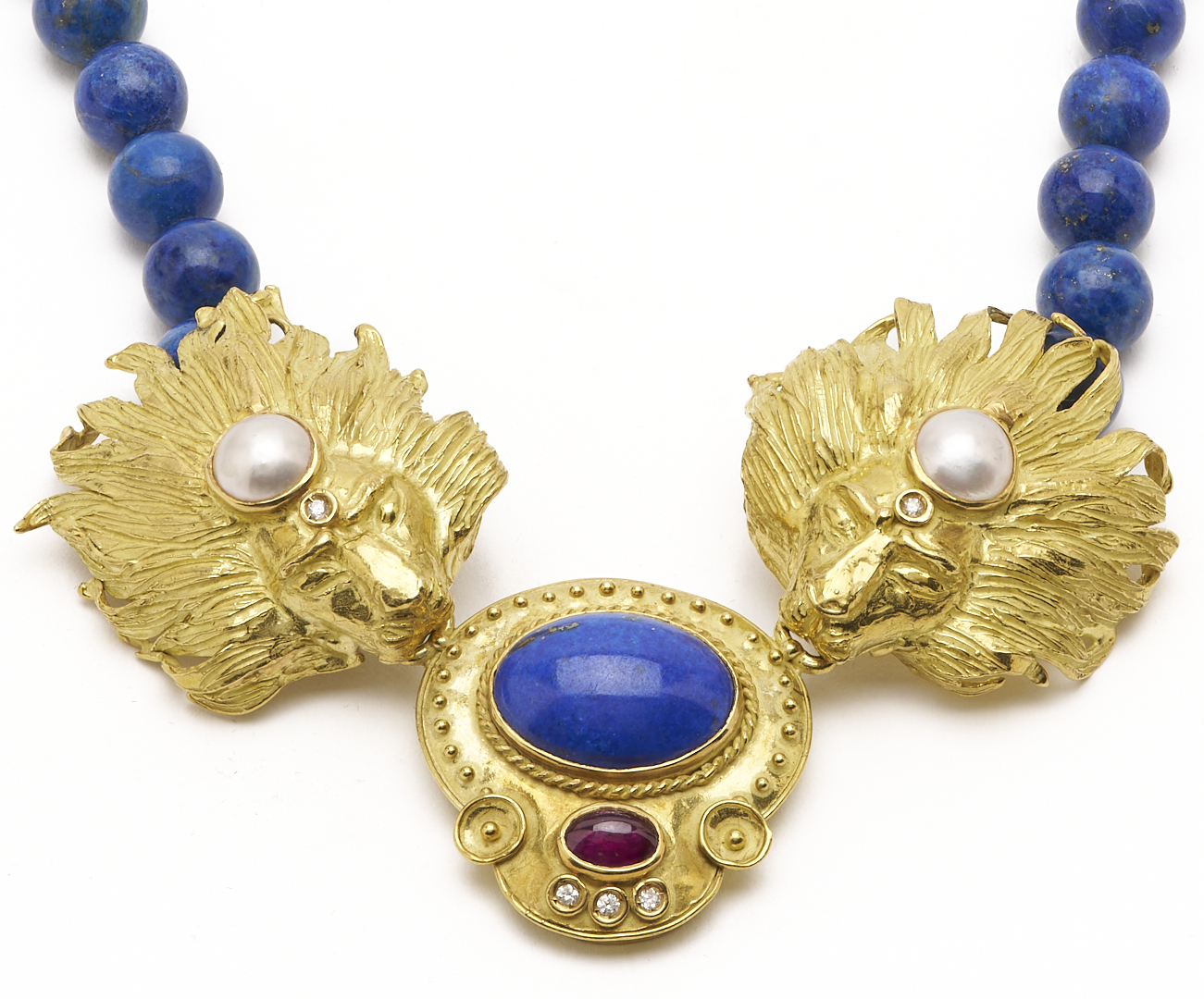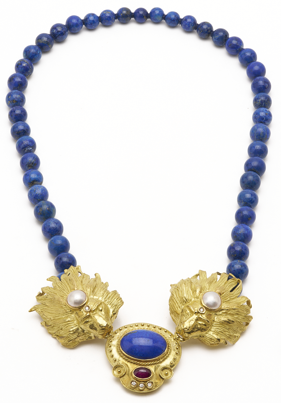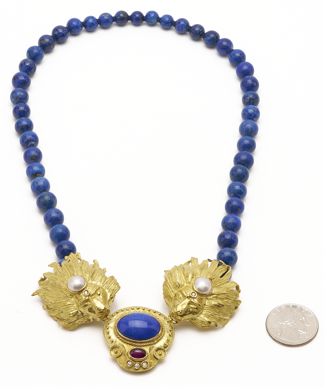 Ladies’ lapis lazuli bead necklace featuring forty-three (43) lapis beads and one (1) oval cabochon lapis as well as two (2) cultured pearls, five (5) melee diamonds, and one (1) natural cabochon ruby all mounted in three (3) pieces of 18K yellow gold. The gold is marked “750 566 ROMA” and XRF tests 18K gold. The necklace is 19 in. L. and has a gross weight of 89.44 grams.