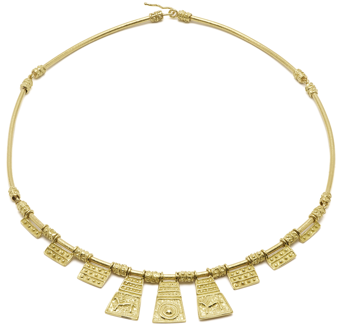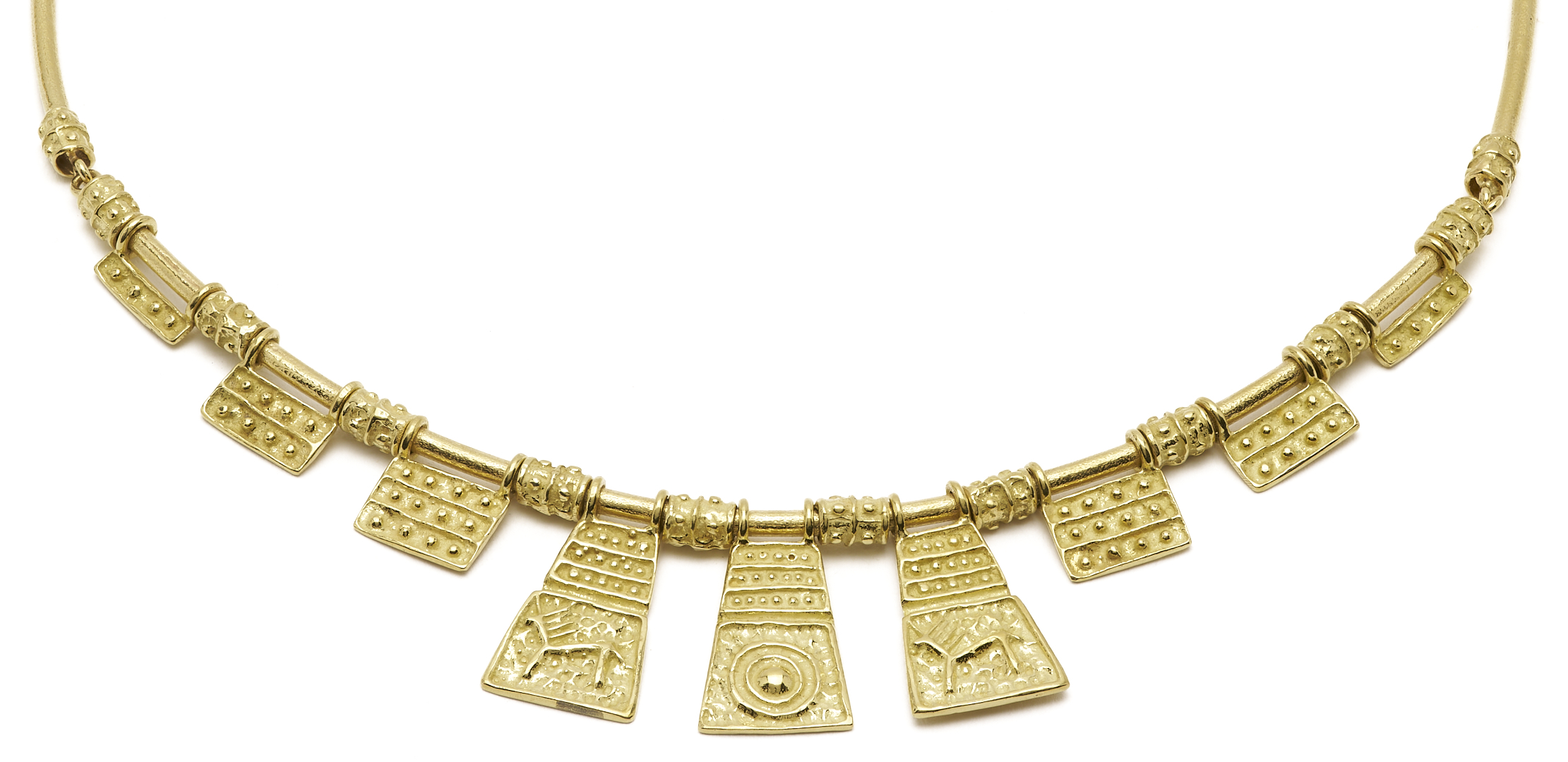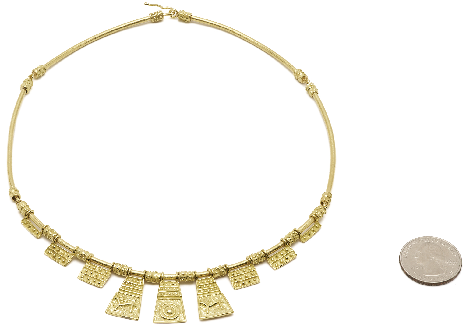 Ladies’ 18K yellow gold Etruscan revival style necklace. The necklace is marked “750” and XRF tests 18K gold, The necklace is 16 in. L. and has a weight of 34.25 grams.