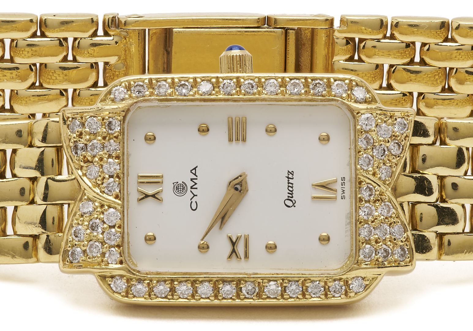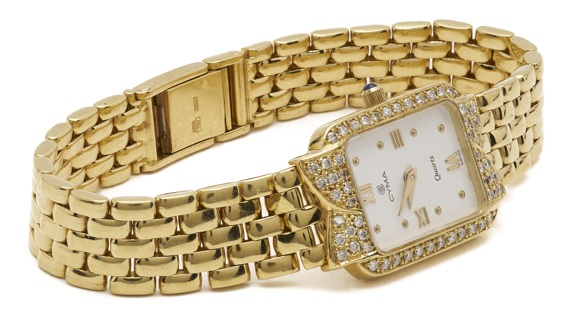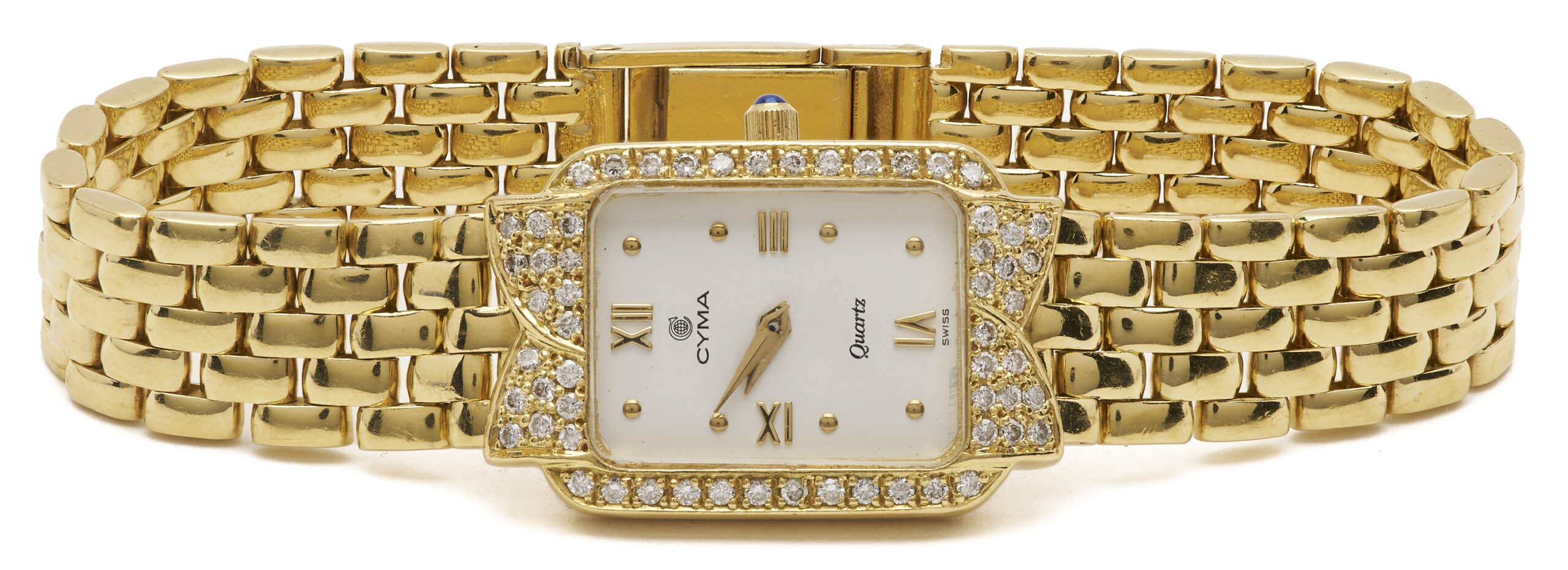 Ladies 18K yellow gold wrist watch by CYMA featuring fifty-six (56) round brilliant cut diamonds approximately 1.12 carats together, Clarity-VS2, Color-I. The watch is marked “18K 750” and XRF tests 18K gold. The watch is 6 1/2 in. L. and has a gross weight of 50.07 grams.