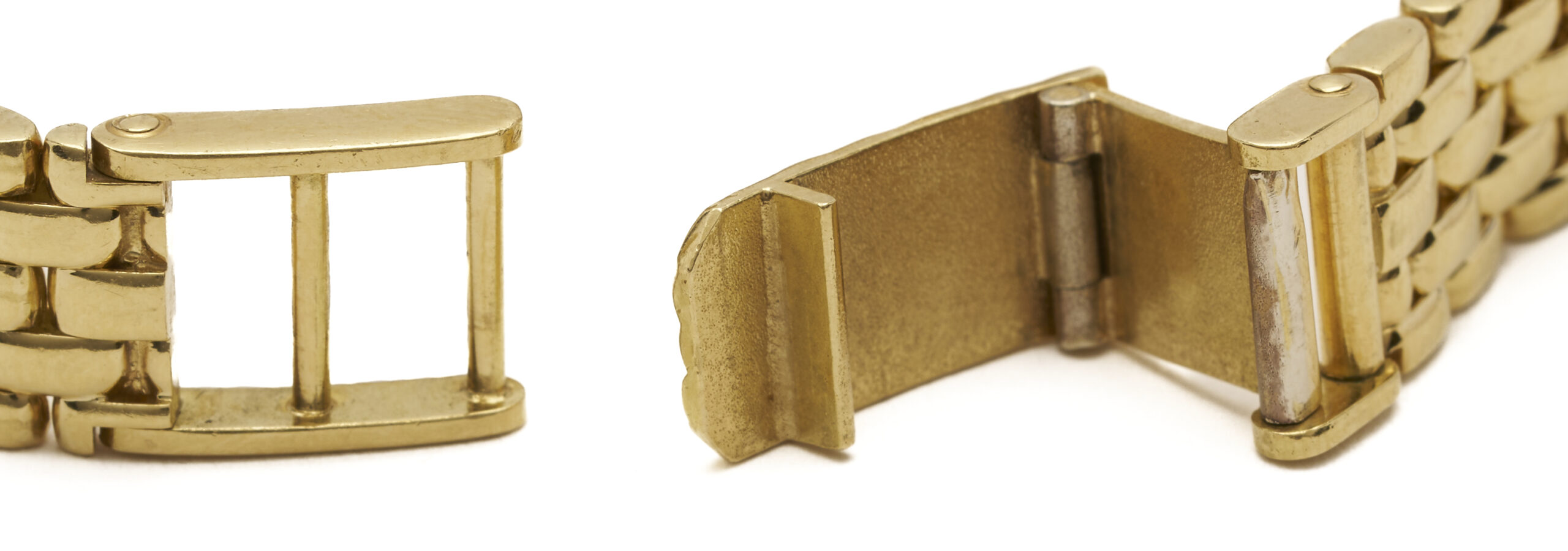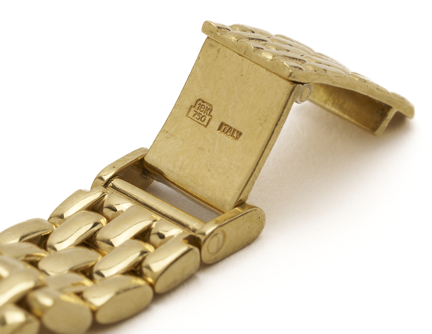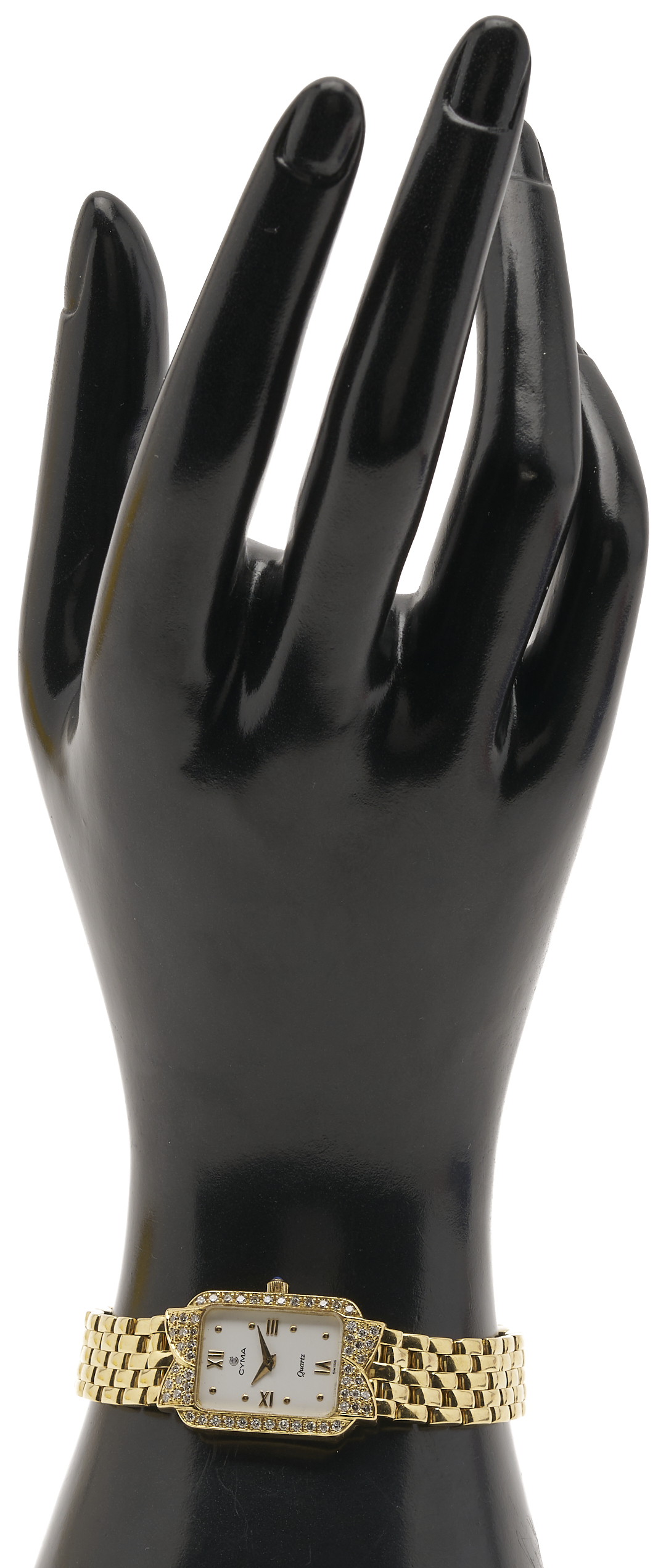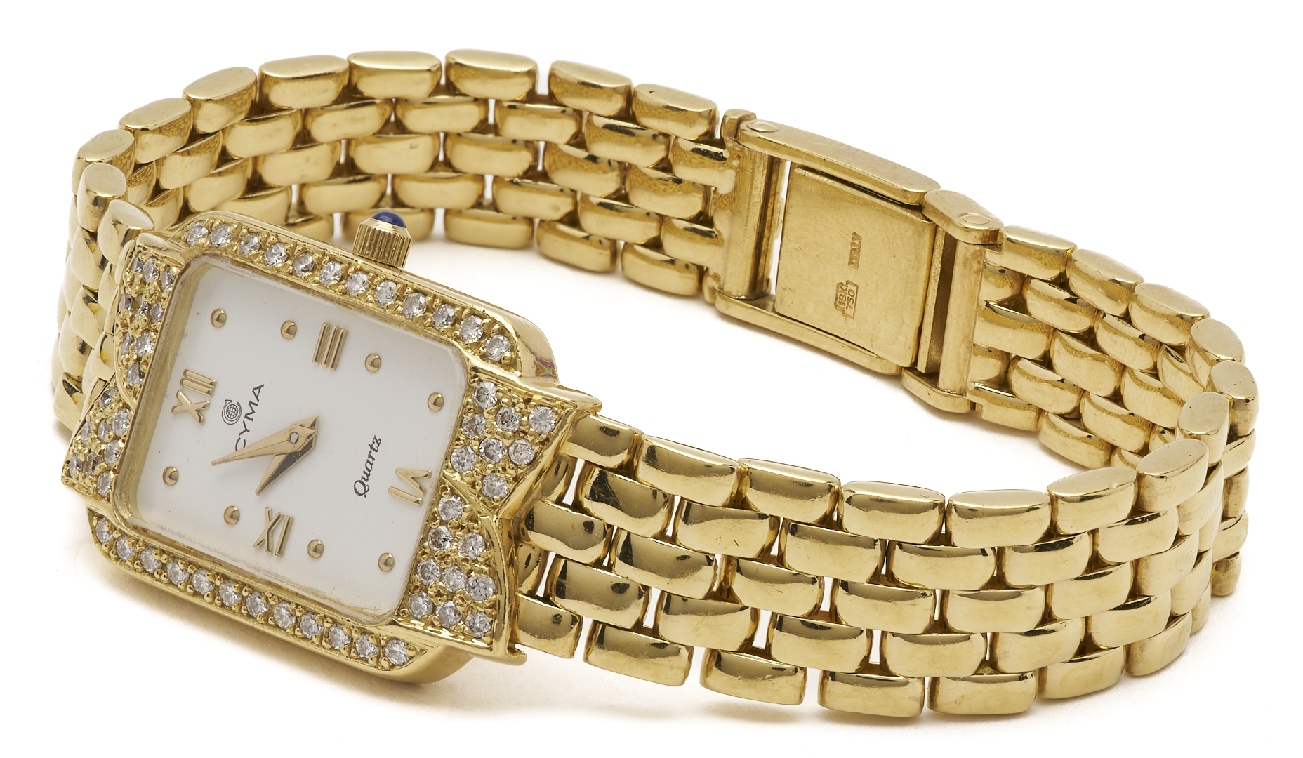 Ladies 18K yellow gold wrist watch by CYMA featuring fifty-six (56) round brilliant cut diamonds approximately 1.12 carats together, Clarity-VS2, Color-I. The watch is marked “18K 750” and XRF tests 18K gold. The watch is 6 1/2 in. L. and has a gross weight of 50.07 grams.