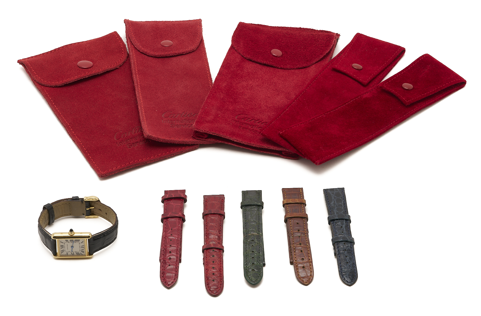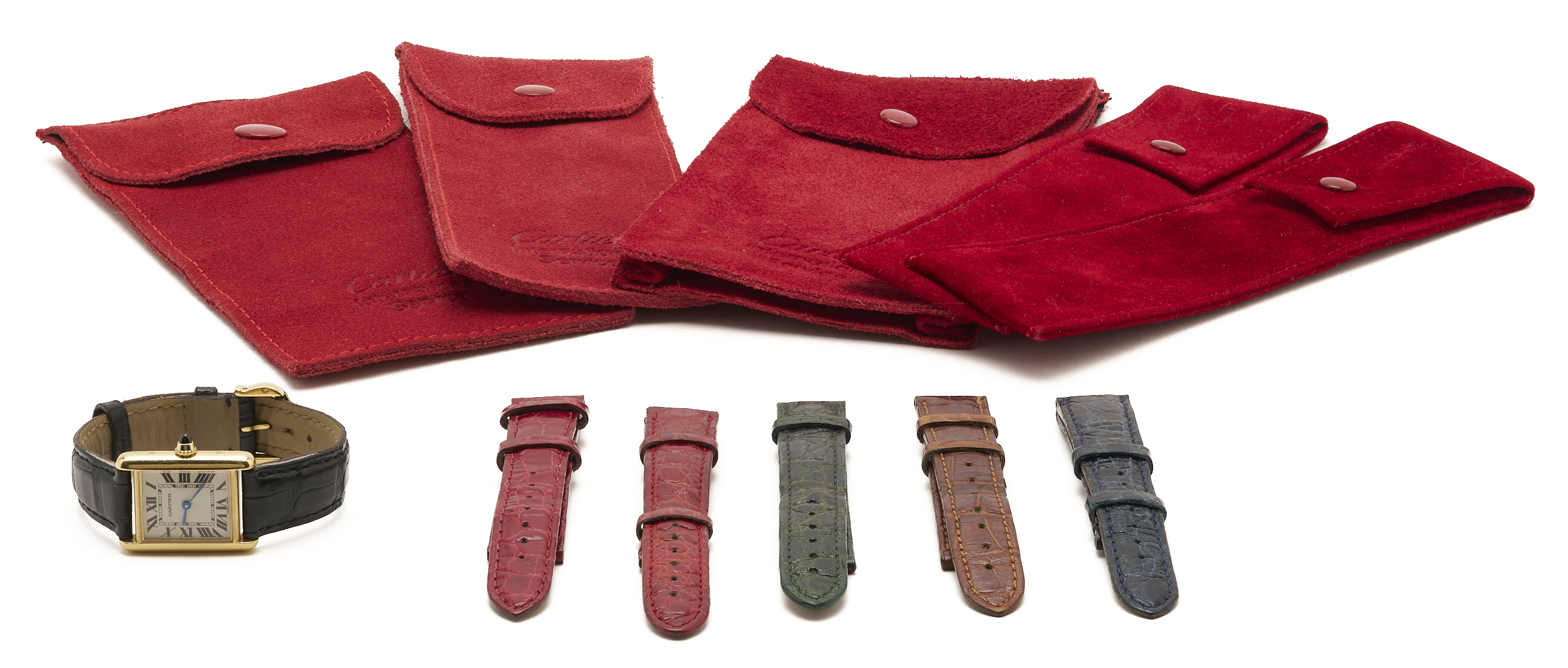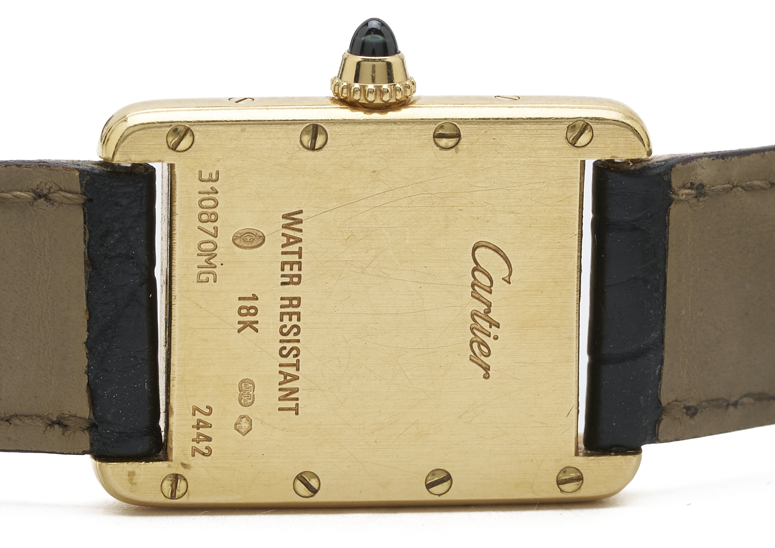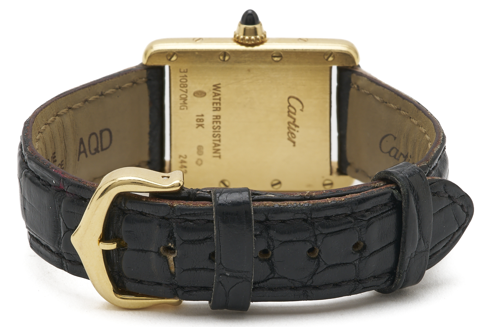 Ladies’ Cartier 18K Tank Watch, small model (22 mm x 29 mm), 18K yellow gold case and buckle. White dial with Roman numeral markers, blued steel hands, and a beaded crown set with a cabochon sapphire. Reference #2442, Serial number 310870MG, battery quartz movement. 8 1/2 in. total L. Fitted with a black alligator band and retains 5 additional alligator bands in various colors. Watch retains the International Limited Warranty Certificate and some service receipts.
