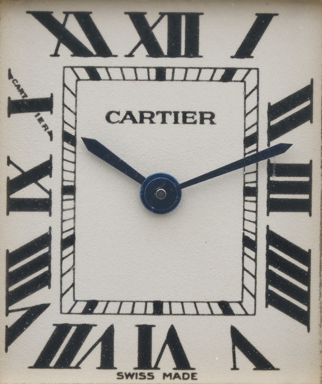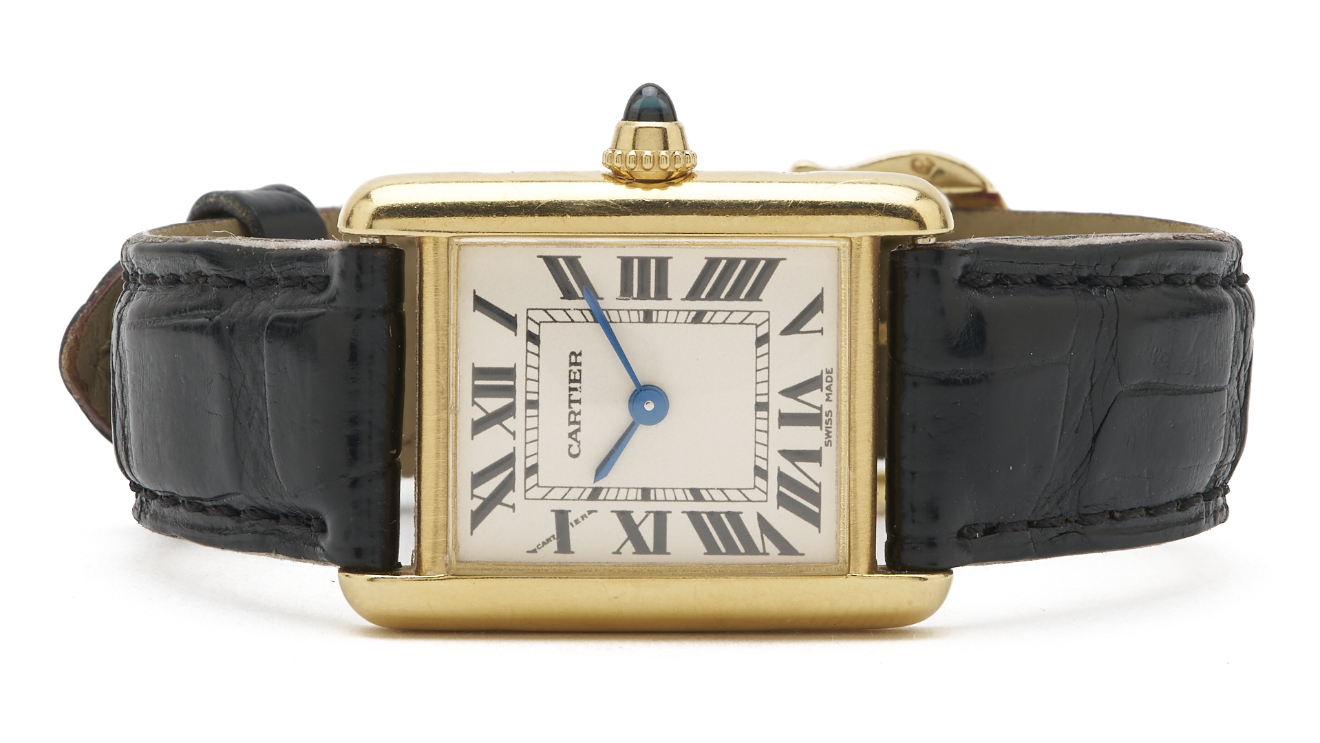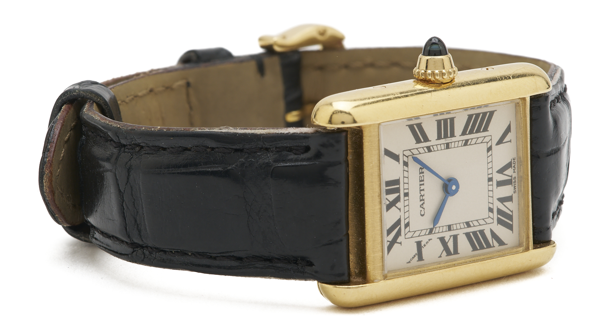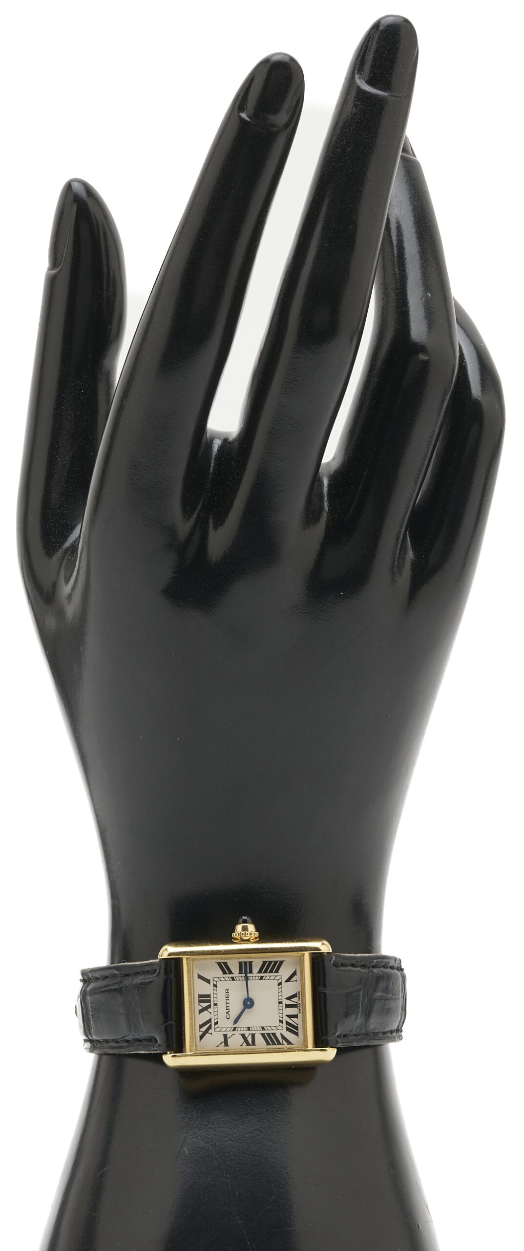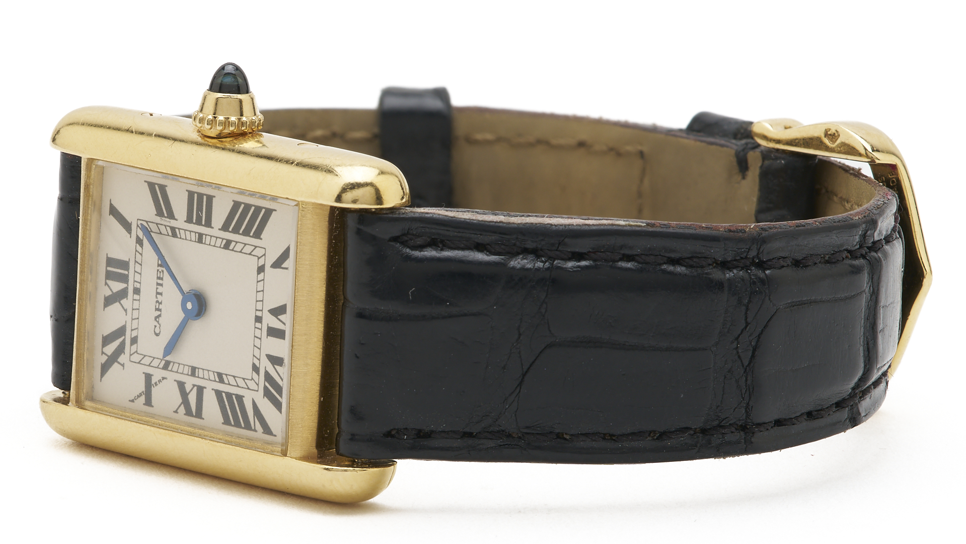 Ladies’ Cartier 18K Tank Watch, small model (22 mm x 29 mm), 18K yellow gold case and buckle. White dial with Roman numeral markers, blued steel hands, and a beaded crown set with a cabochon sapphire. Reference #2442, Serial number 310870MG, battery quartz movement. 8 1/2 in. total L. Fitted with a black alligator band and retains 5 additional alligator bands in various colors. Watch retains the International Limited Warranty Certificate and some service receipts.