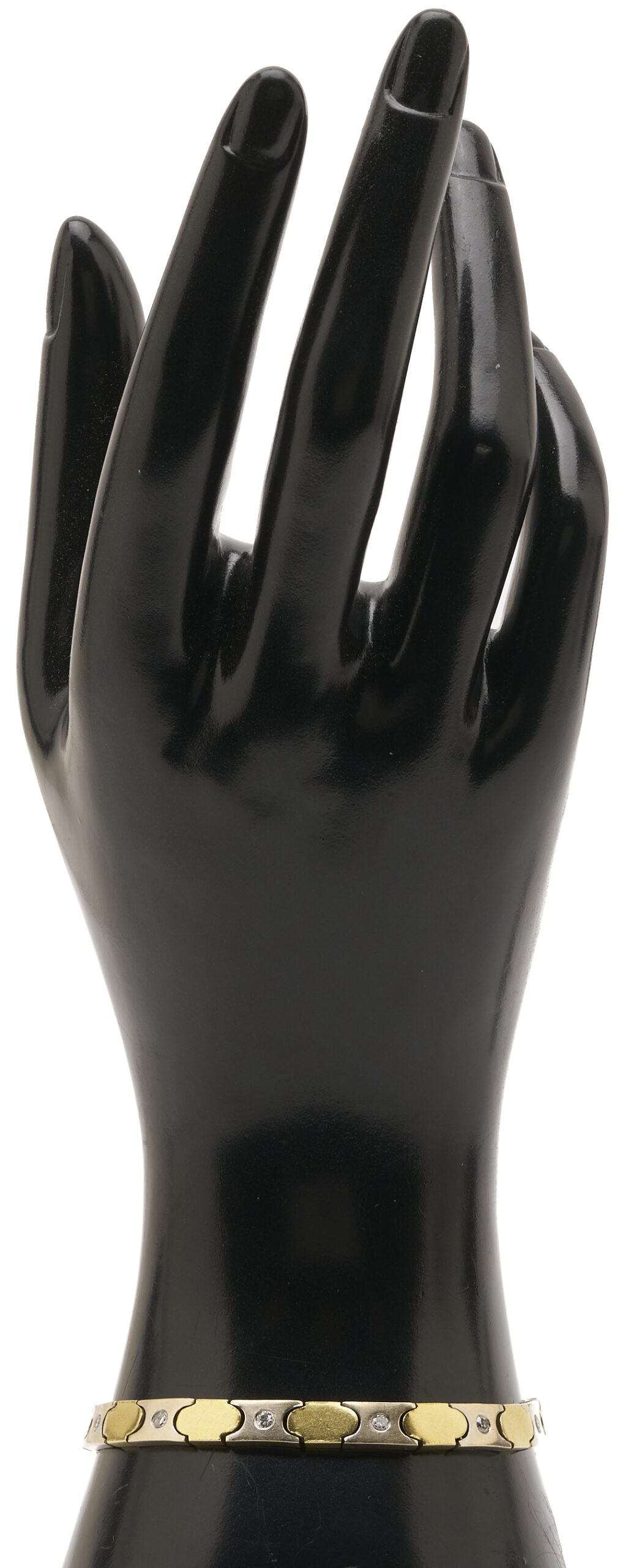 Ladies’ 18K yellow and white gold X and O bracelet featuring eleven (11) round brilliant cut diamonds approximately 0.44 carats together, Clarity-SI2, Color-I. The bracelet is marked “18K” and XRF tests 18K gold. The bracelet is 7 in. L. and has a gross weight of 30.07 grams.