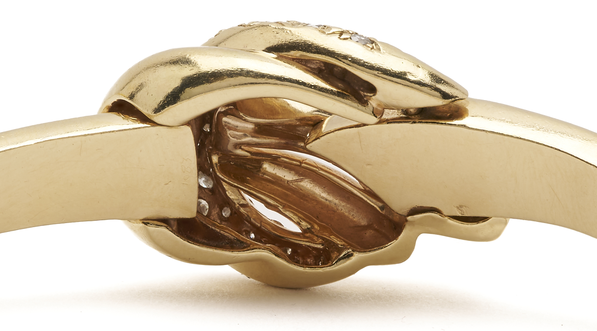 Ladies’ 14K yellow gold knot bracelet featuring forty-one (41) round brilliant diamonds approximately 1.02 carats together, Clarity-VS2, Color-H. The bracelet XRF tests 14K gold. The bracelet is 7 in. L. and has a gross weight of 30.04 grams.