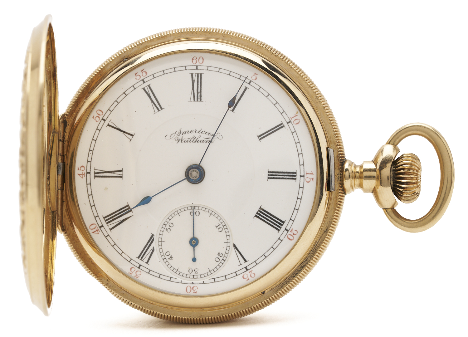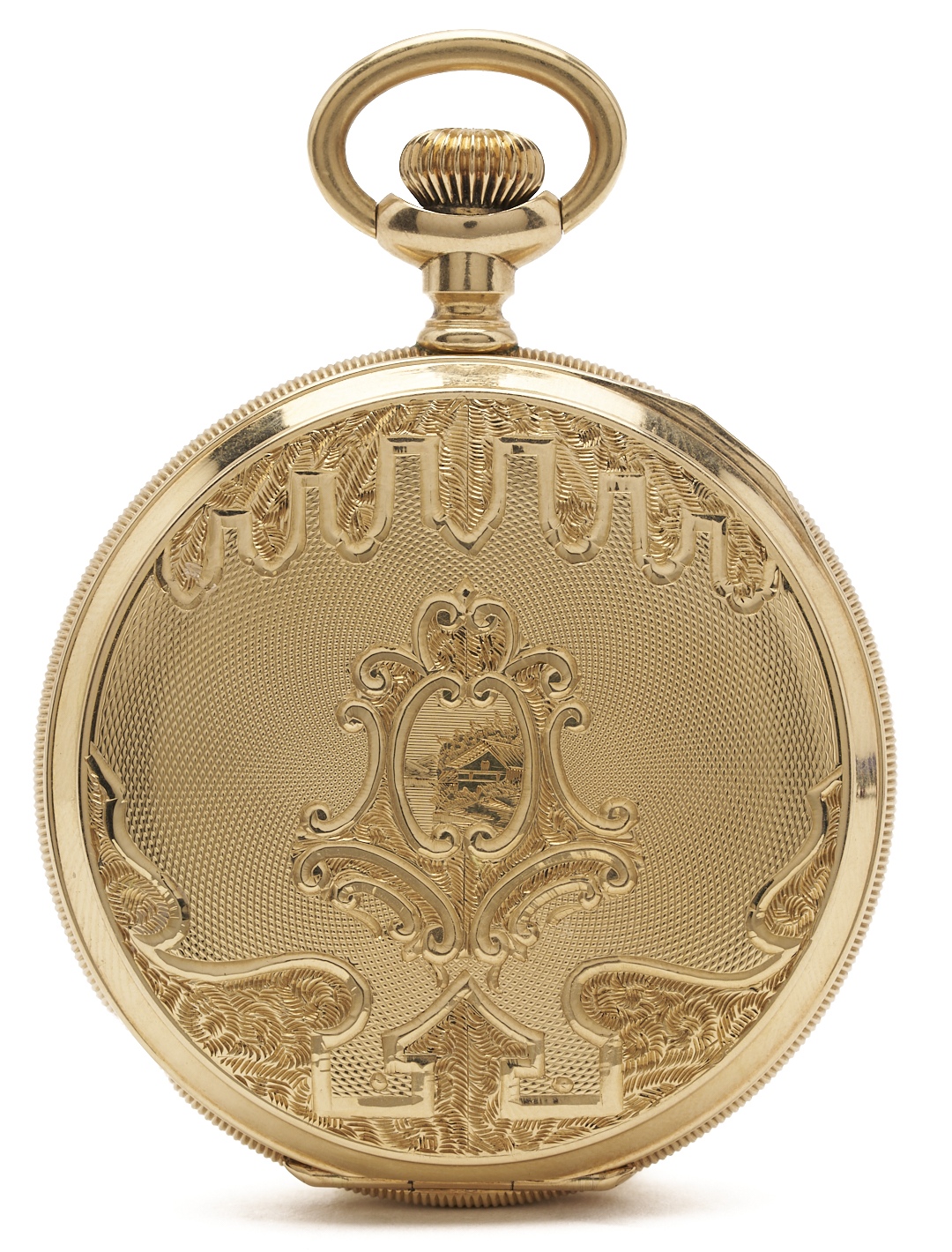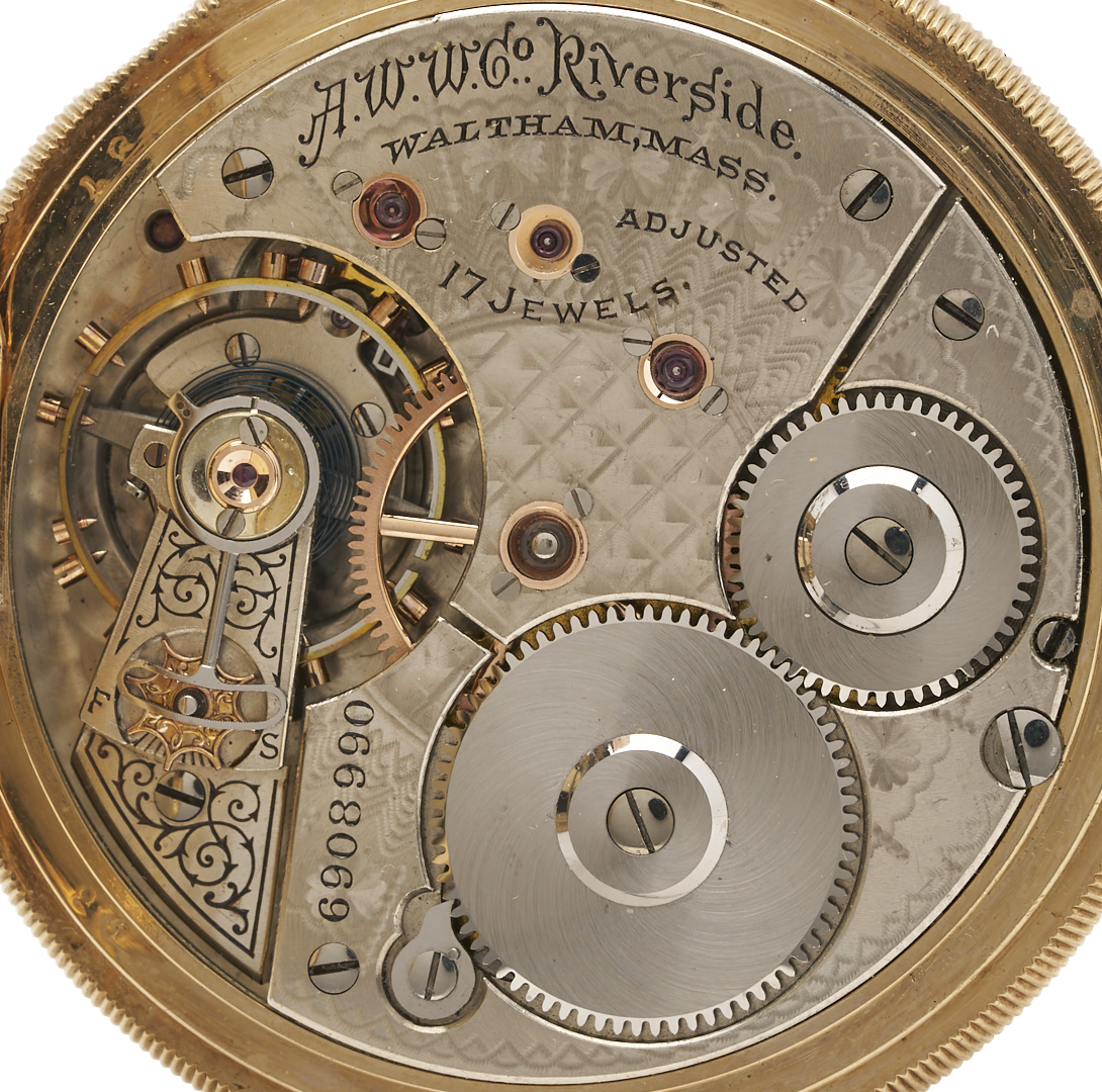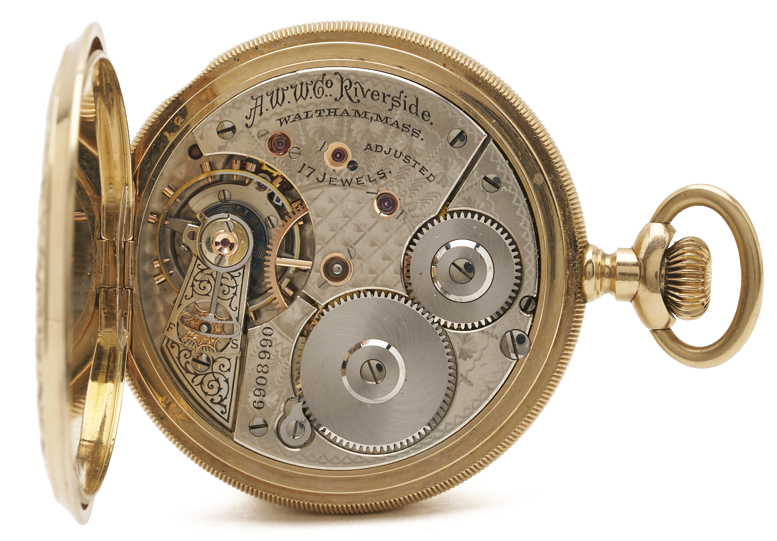 Waltham grade Riverside 17 jewel size 16s pocket watch. The watch is in a 14K yellow gold hunting case featuring a cabin scene vignette. The case is marked “14K” and XRF tests 14K gold. The serial number is 6908990 and was produced between 1898 and 1899. Gross weight of the watch is 94.44 grams.
