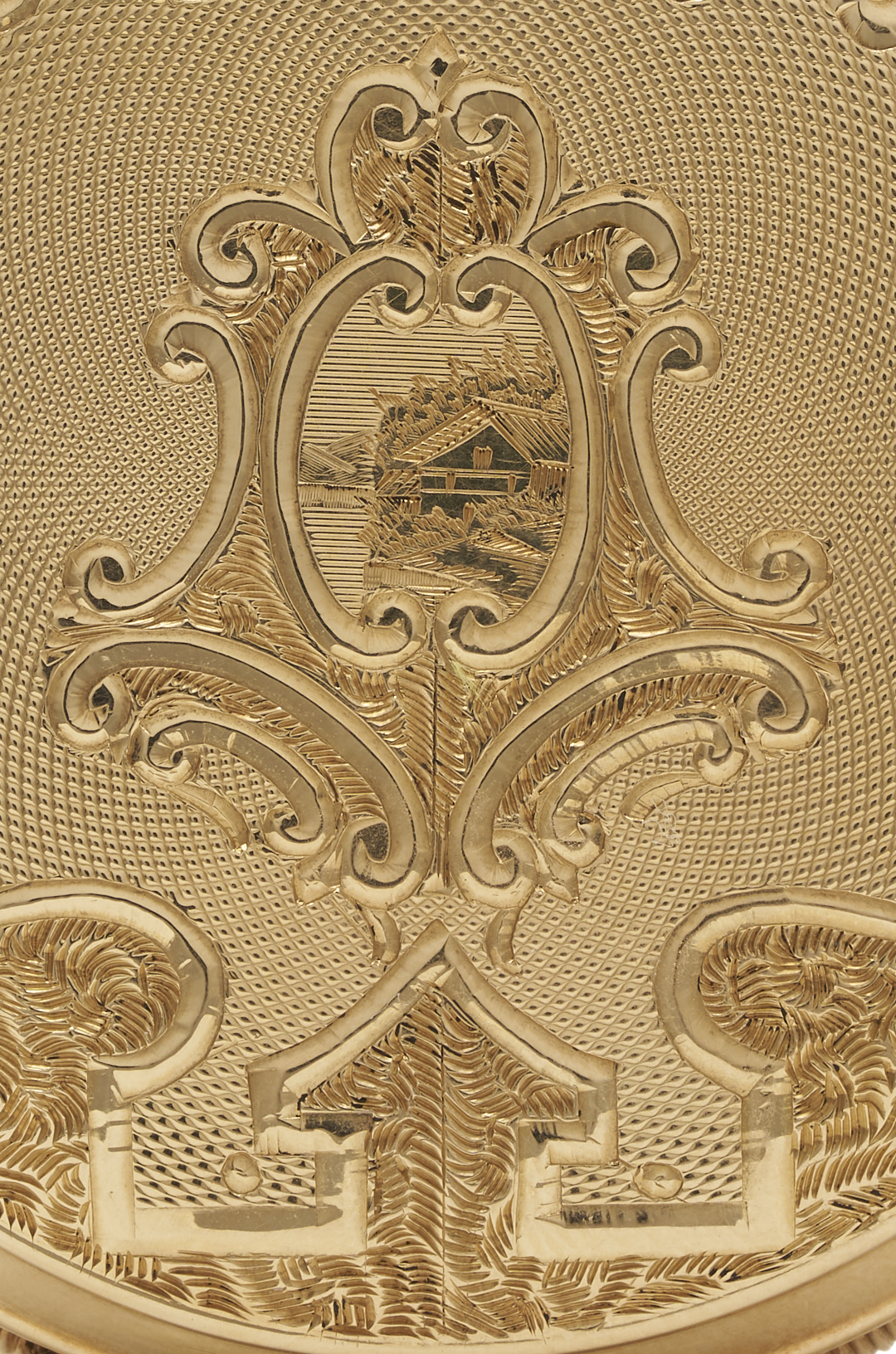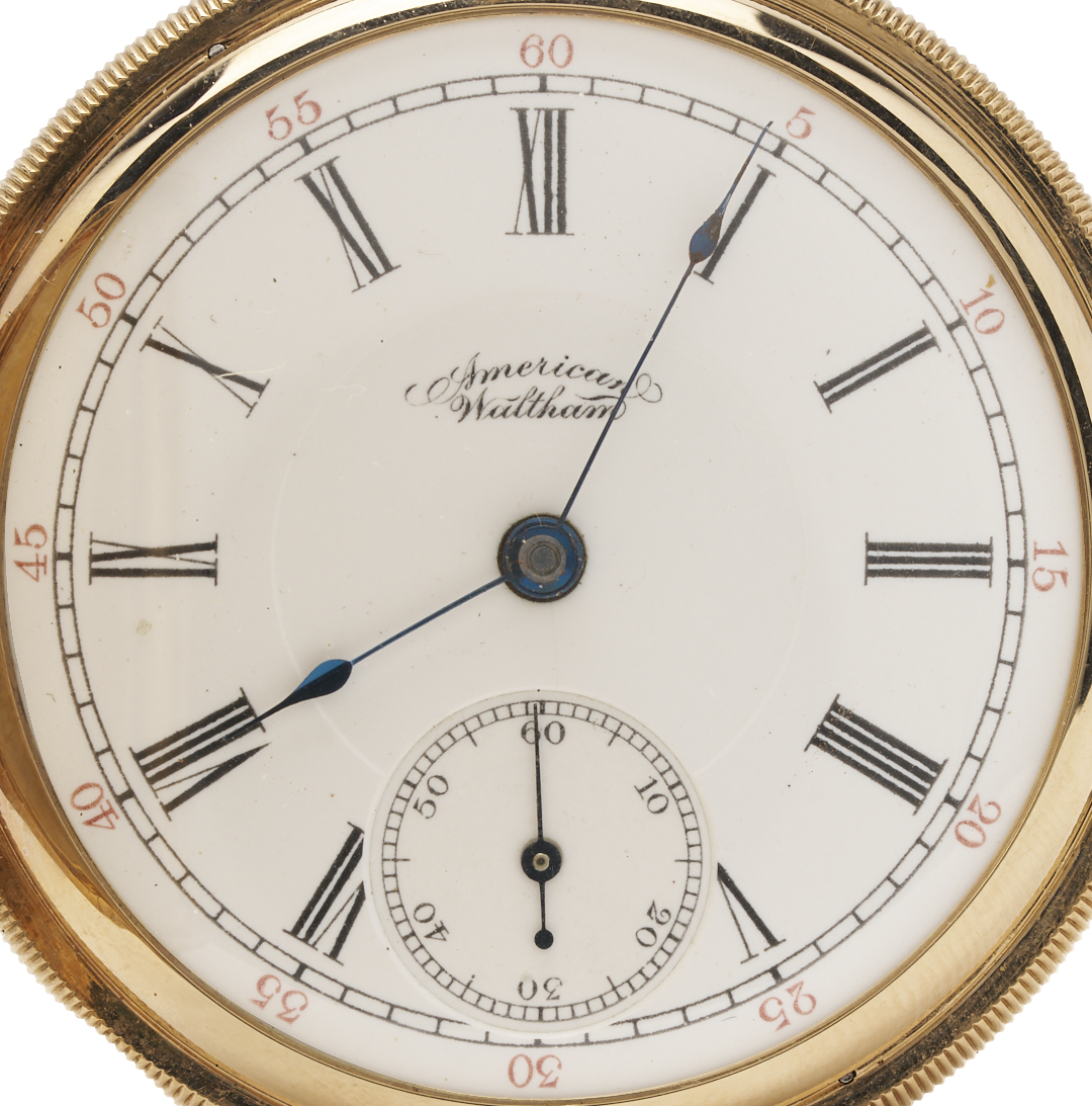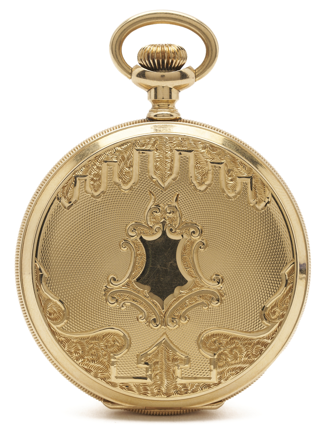 Waltham grade Riverside 17 jewel size 16s pocket watch. The watch is in a 14K yellow gold hunting case featuring a cabin scene vignette. The case is marked “14K” and XRF tests 14K gold. The serial number is 6908990 and was produced between 1898 and 1899. Gross weight of the watch is 94.44 grams.