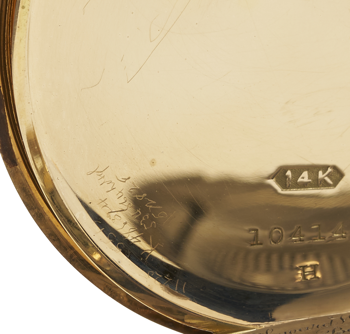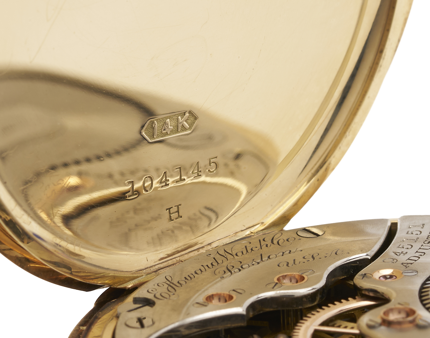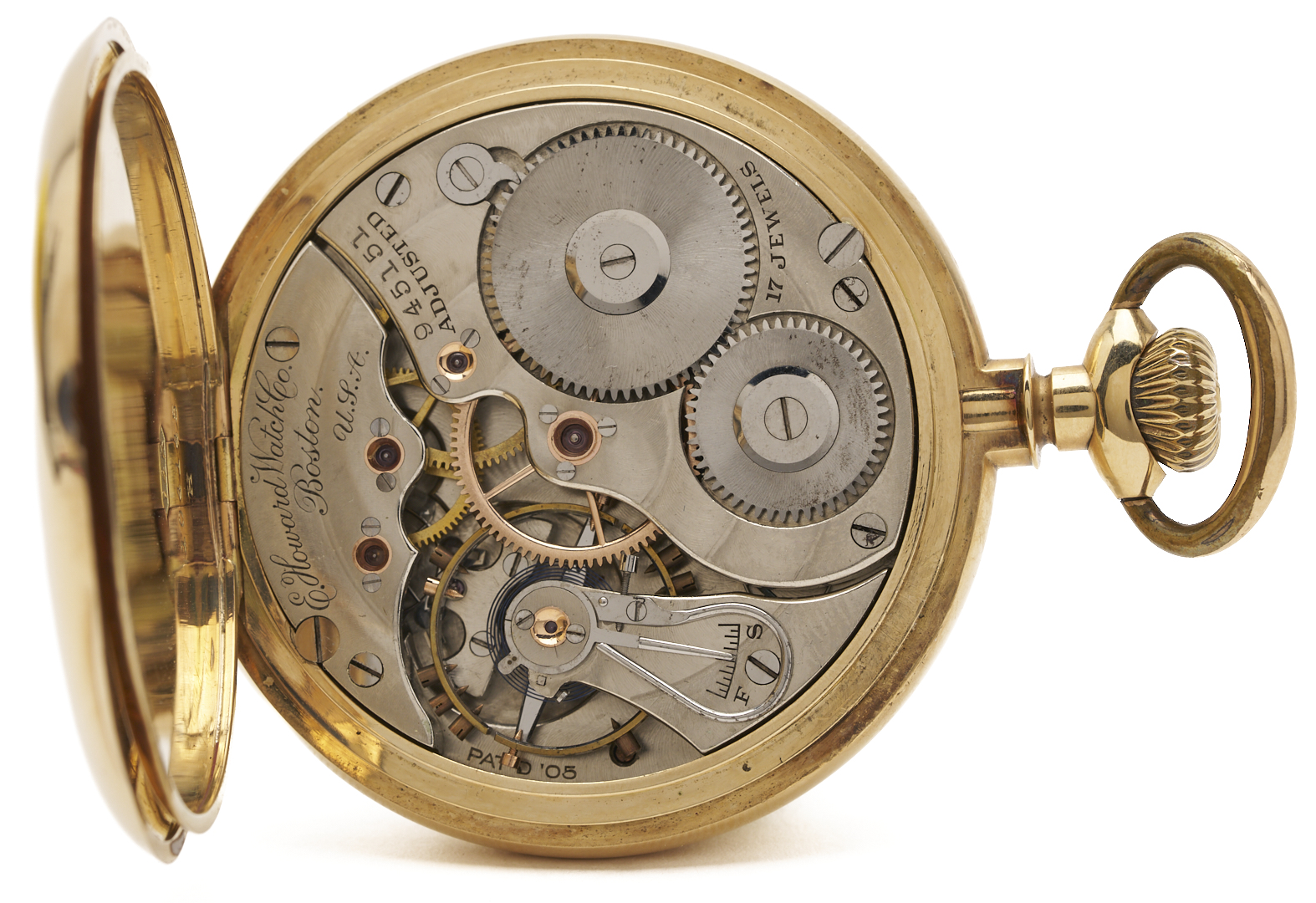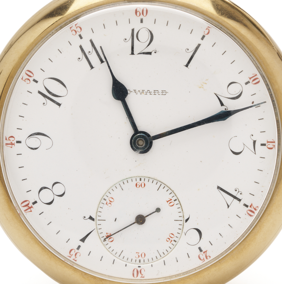 E. Howard & Co. grade series 3 17 jewel size 16s pocket watch. The watch is in a 14K yellow gold open case with three part script monogram, ECC. The case is marked “14K” and XRF tests 14K gold. The serial number is 945151 and was produced in 1907. Gross weight of the watch is 95.00 grams.