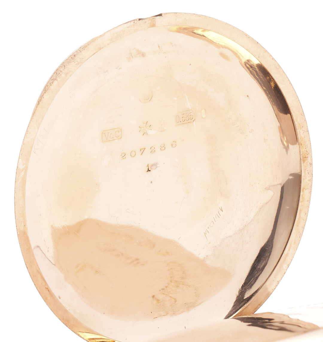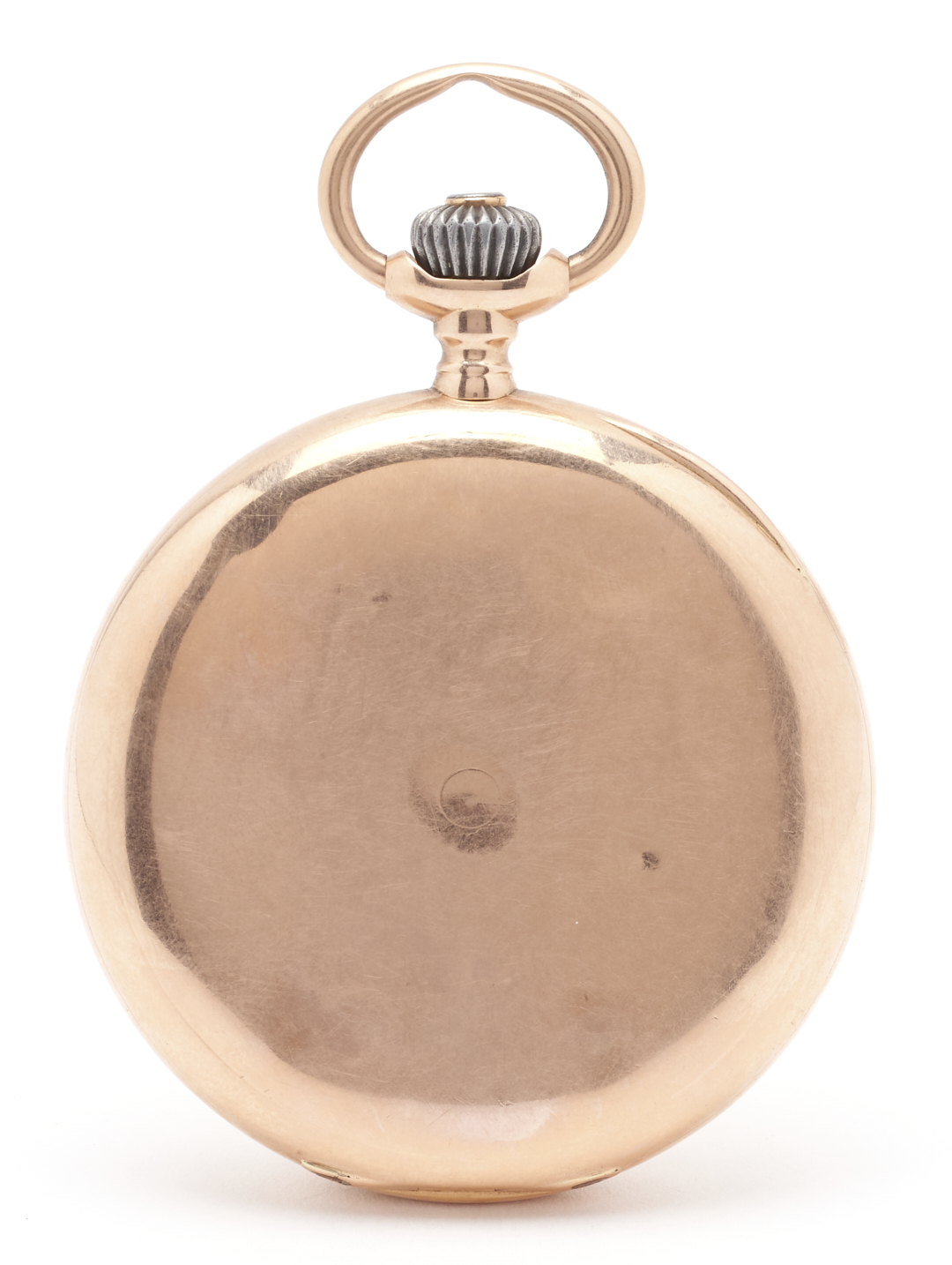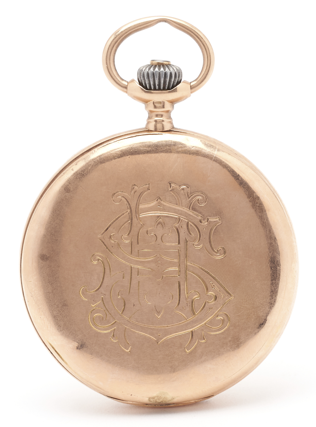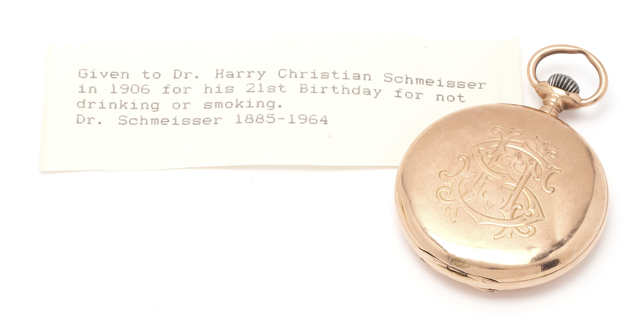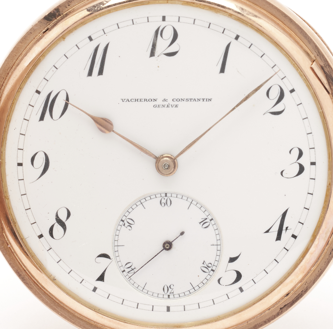 1906 Vacheron & Constantin Milan Grand Prix 14K pocket watch, Ref. #340168, 46mm, triple marked, lever set with winding knob, foliate engraved initials to case front. Movement signed Vacheron & Constantin Geneve and numbered #340168; case cover marked V&C with other hallmarks and .585 and numbered #207286; handpainted enameled dial with Arabic numerals, subsidiary seconds at six, gilt hands, and signed Vacheron & Constantin Geneve. Retains the original red leather case together with a presentation note reading “Given to Dr. Harry Christian Schmeisser (1885 – 1964) in 1906 for his 21st birthday for not drinking or smoking.” The weight of the watch is 98.7 grams.