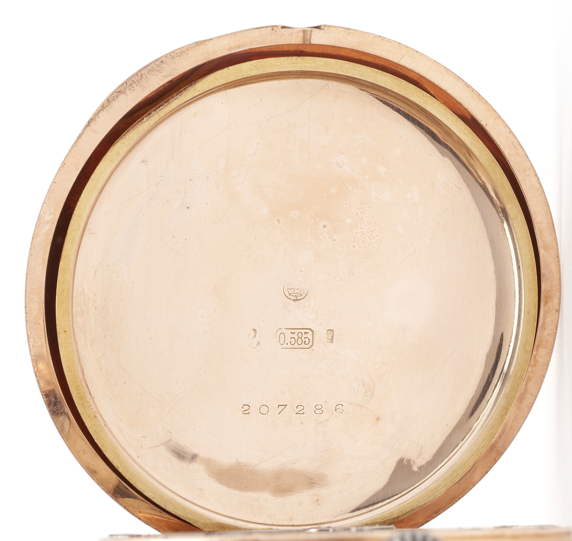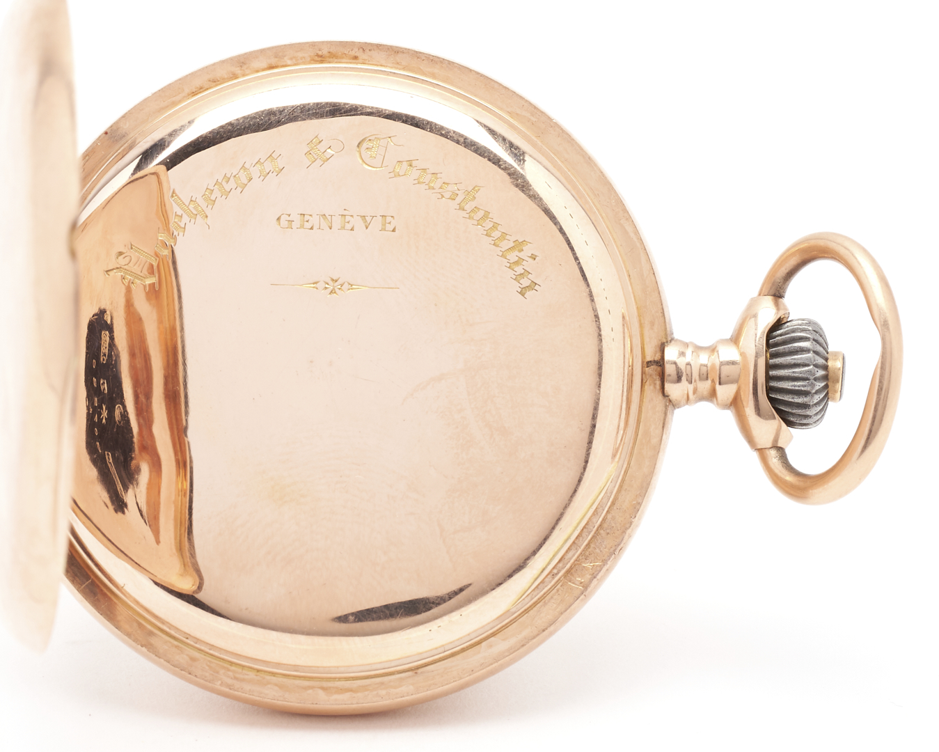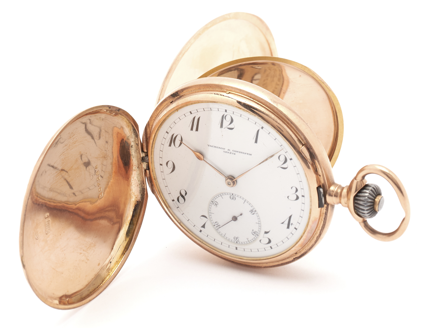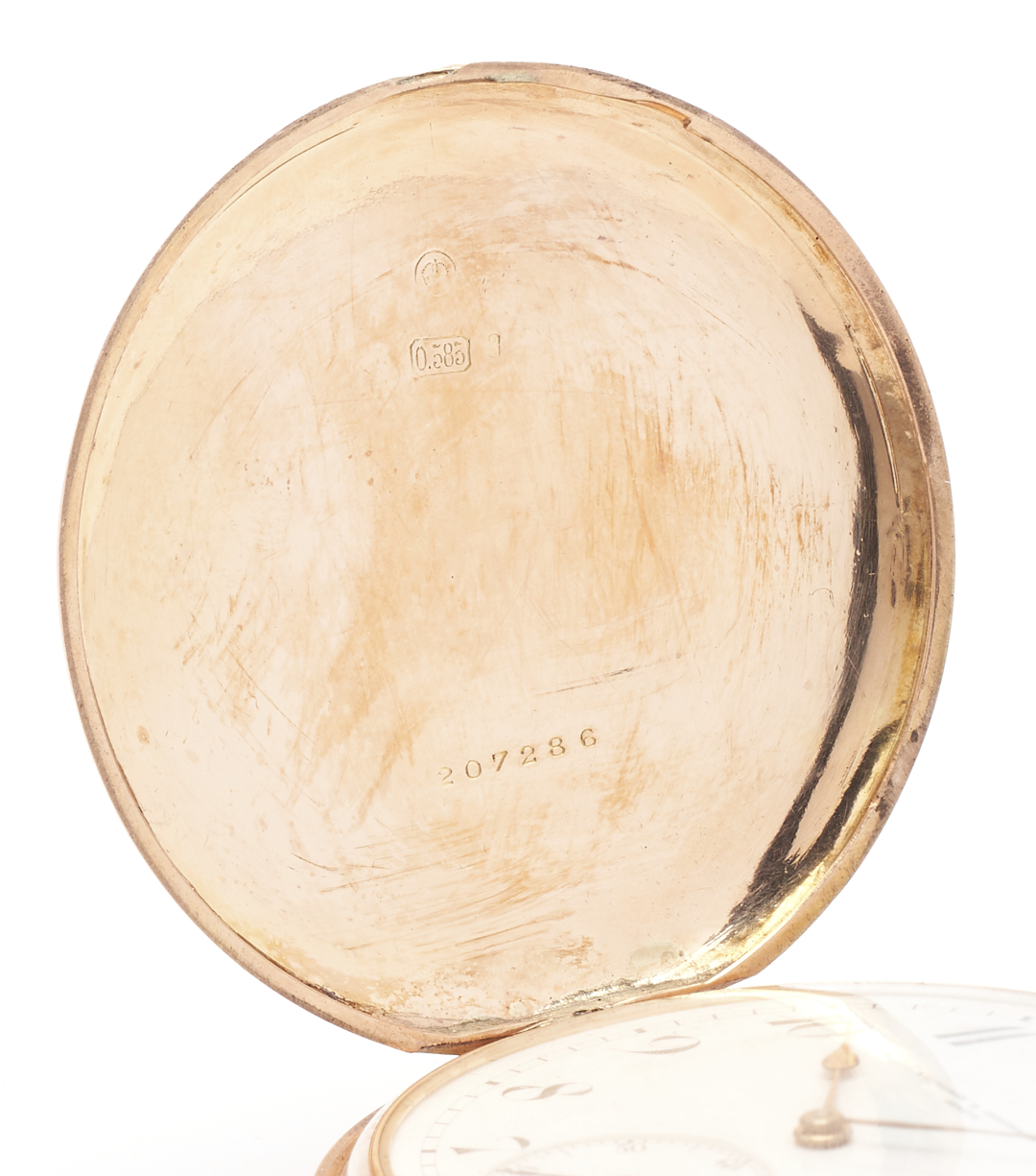 1906 Vacheron & Constantin Milan Grand Prix 14K pocket watch, Ref. #340168, 46mm, triple marked, lever set with winding knob, foliate engraved initials to case front. Movement signed Vacheron & Constantin Geneve and numbered #340168; case cover marked V&C with other hallmarks and .585 and numbered #207286; handpainted enameled dial with Arabic numerals, subsidiary seconds at six, gilt hands, and signed Vacheron & Constantin Geneve. Retains the original red leather case together with a presentation note reading “Given to Dr. Harry Christian Schmeisser (1885 – 1964) in 1906 for his 21st birthday for not drinking or smoking.” The weight of the watch is 98.7 grams.