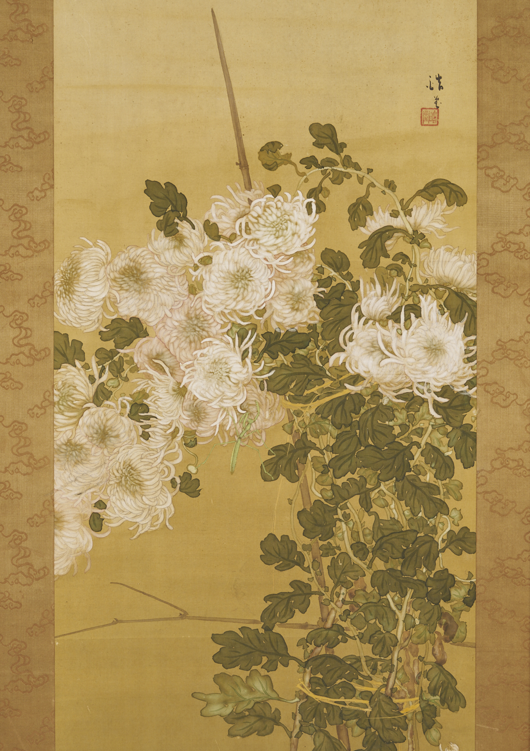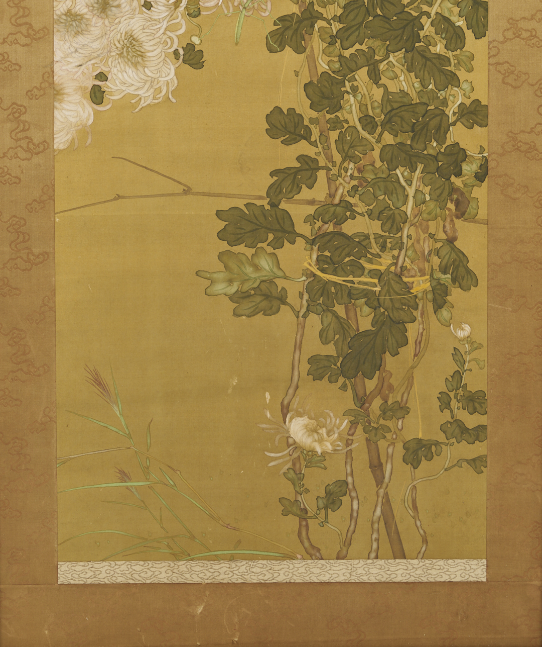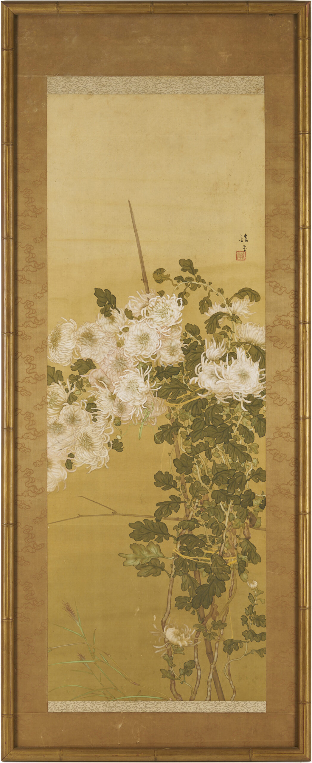 Asian watercolor on silk scroll painting depicting chrysanthemums. Signature and seal mark upper right. Silk damask mat and molded giltwood frame simulating bamboo. Japanese or Chinese, late 19th to early 20th century. Image: 45 in. H x 16 in. W. Frame: 56 in. H x 23 in. W.